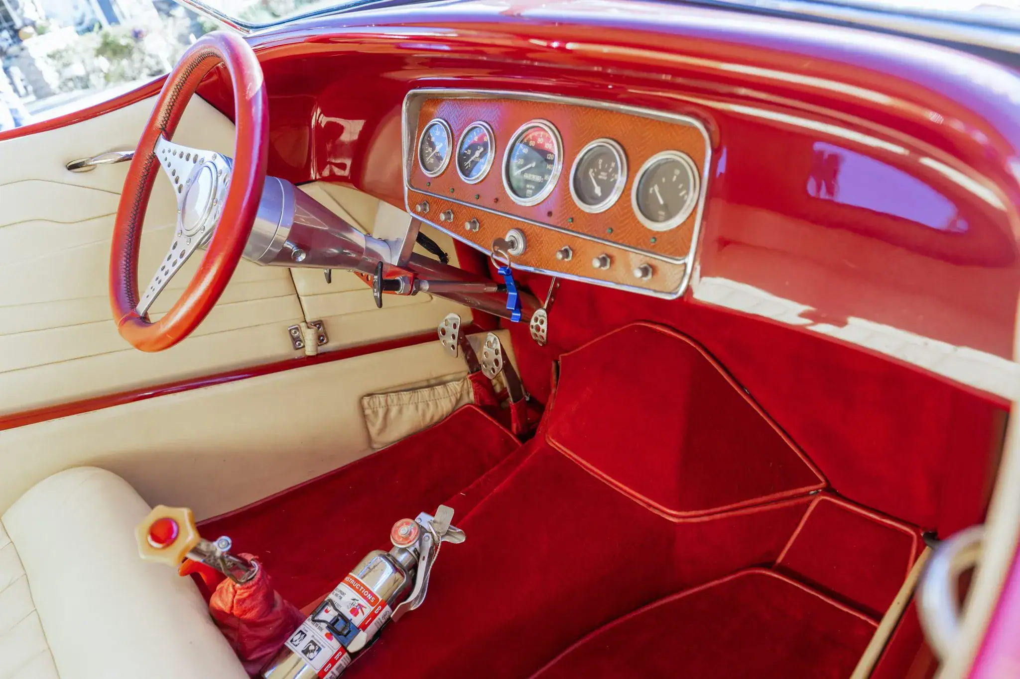 L’intérieur est garni de cuir beige et comprend un arceau de sécurité à six points, une colonne de direction en aluminium usiné, un extincteur et le tableau de bord de type Auburn qui se réjouit d’avoir des instruments Stewart-Warner… Cette voiture a fait l’objet d’un article dans le numéro de décembre 1996 du magazine “Street Rodder” de feu mon ami Tom Mc Mullen décédé dans un accident avec son épouse Deana, le Beechcraft bimoteur a “défailli”... Le Hot Rod a également et a figuré en couverture du magazine Rod & Custom en janvier 2002 pour célébrer sa participation et son premier prix au concours “Readers’ Rods Shootout” avec mention spéciale concernant le choix des feux arrière en forme de larme avec des lentilles “diable aux yeux bleus”. Les jantes “ET Fueler” de 14 et 17 po sont fixées par des écrous papillon à fixation sécurisée et chaussées de pneus “Hankook Kinergy ST” 185/60 AV et “Hankook Ventus ST” 275/60 AR. Le freinage est assuré par des freins à disque aux quatre roues, avec des disques pleins perforés et des étriers avant “Wilwood Dynalite”…