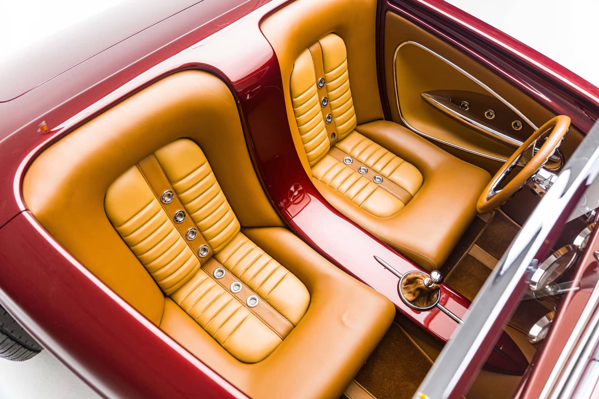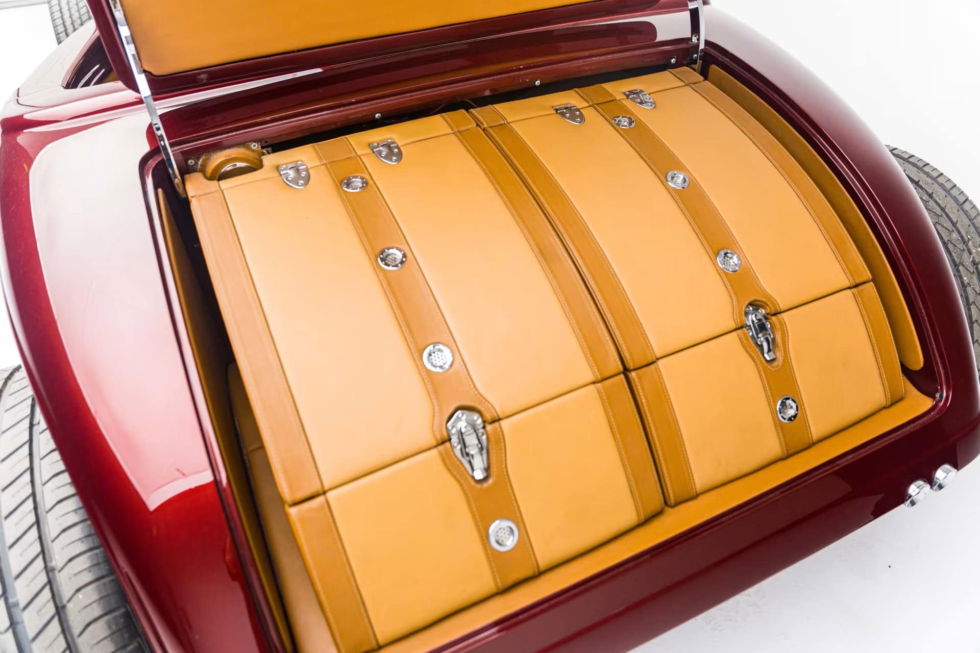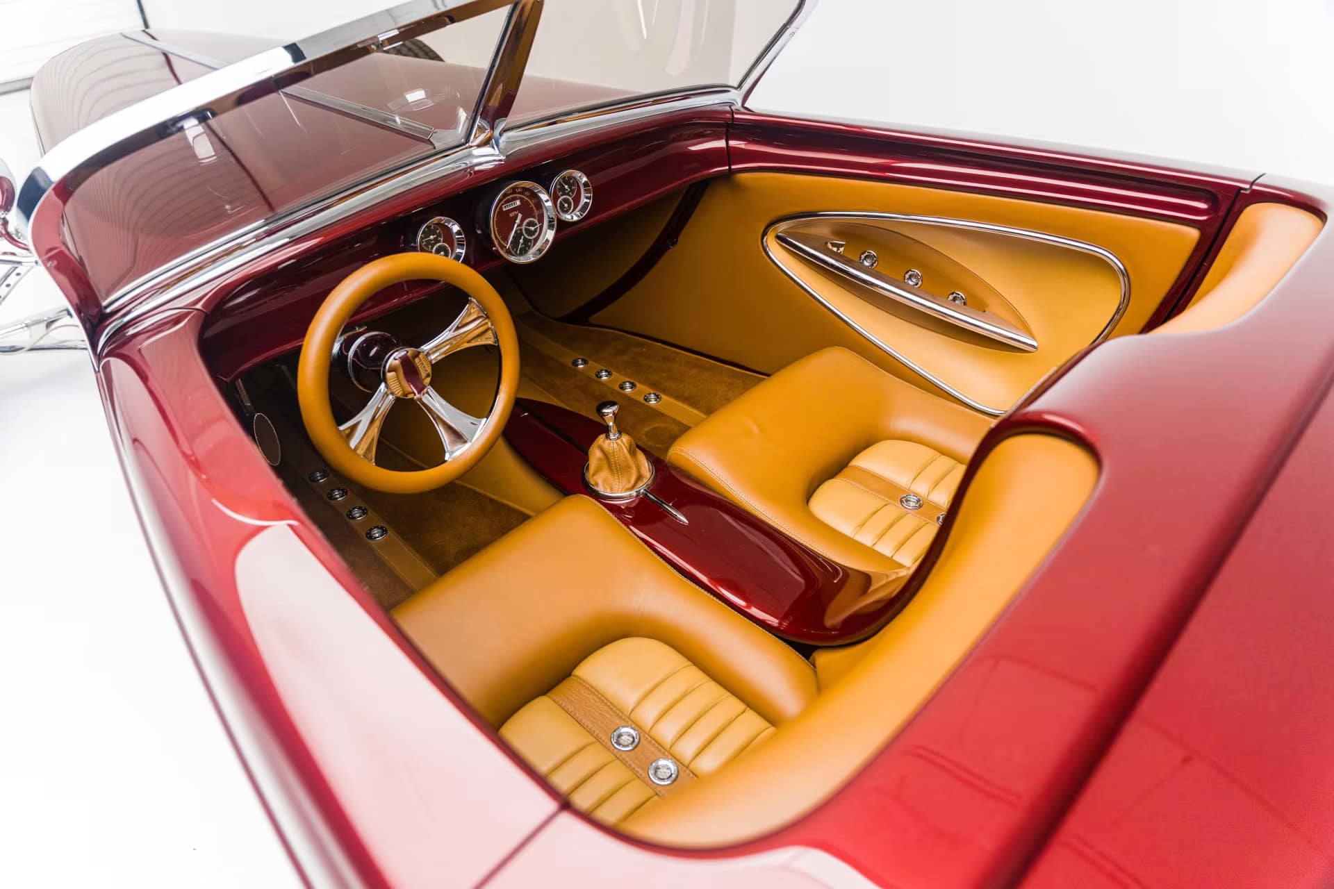 La peinture et la carrosserie ont été réalisées par “Palmer’s Custom Paint & Body” de Camarillo en Californie, et l’espace personnalisé super sympa à l’arrière, ne sert pas de coffre à bagages mais s’avère être un rangement pour “piqueniquer” avec “mini cave/bar à vin”, le tout conçu pour une harmonie haut de gamme décalée dans le temps et la fonction… À l’intérieur, la qualité “haut de gamme” se poursuit avec du sur mesure réalisé par les équipes de “Ron Mangus Custom Hot Rod Interiors” de Rialto, Californie, qui propose toutes sortes de touches sympas…