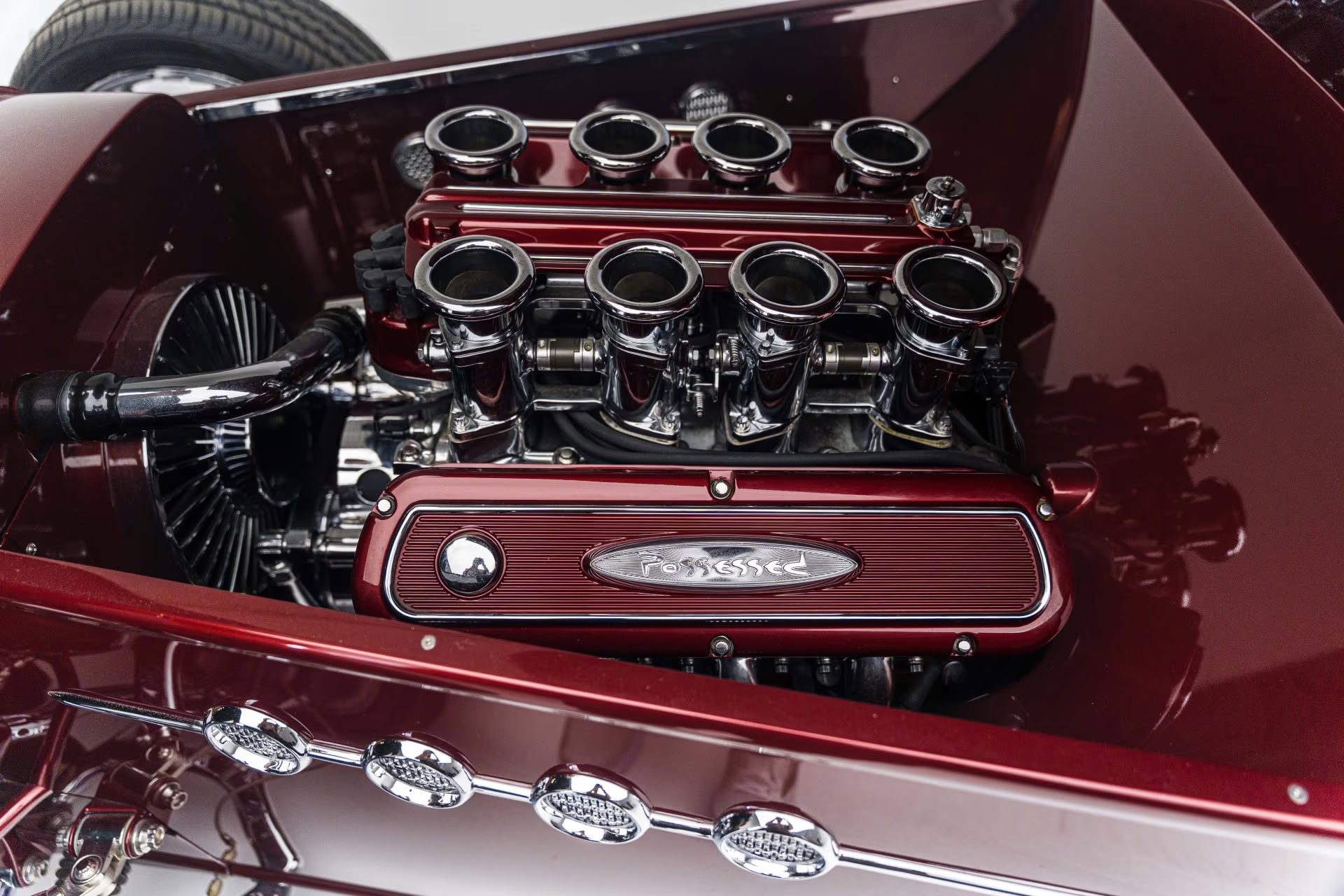 Ce Hot Rod trop “classieux” pour être réellement honnête (sic !) est maintenant reconnu dans les “bons” cercles du Hot Rodding, sous le nom de “Possessed”… Il a été assemblé par une petite armée de préparateurs, dont le gourou du Hot Rodding “Gary Ragle” (responsable de la conception générale), le garage “Scott’s Hot Rods & Customs”, basé à L.A. en Californie (qui s’est occupé de la construction), l’atelier de peinture “Palmer’s Custom Paint & Body”, et la société d’aménagements décoratifs et capitonnages “Ron Mangus Custom”…