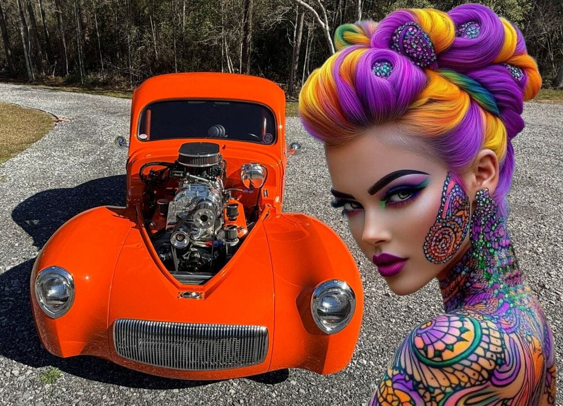 Les perspectives sont faussées comme le jeu d’échec de l’illustration. Que soit ainsi, je n’en peux rien changer si ce n’est en écrire pour qui sont abonné(e)s à un besoin de passe-temps ce qui démontre que la futilité n’est qu’un déversoir de diverses pensées… Alors j’en viens (enfin)à tapoter une histoire moins intellectuelle en une suite concernant ce Hot Rod rouge muni d’un compresseur et assorti d’une superbe et jeune plante carnivore en illustration… Soudain un “à quoi bon y passer tant de temps” se superpose à l’architecture éditoriale d’un sujet éphémère alors que j’en viens à tricher en ajoutant des “figures sexy’s” décoratives qui ajoutent du surréalisme à l’inutile besoin de tapoter de l’éphémère, au palpable par procuration… L’art est depuis longtemps un moyen d’exprimer les sentiments, les idées et les expériences de l’humain. Parmi les différents mouvements artistiques qui ont vu le jour au cours de l’histoire, le surréalisme se distingue par une fascinante exploration du subconscient. Les racines du surréalisme remontent au début du XXe siècle, lorsque certains/certaines ont cherché à exploiter les profondeurs cachées de la psyché humaine et à remettre en question les notions conventionnelles de la réalité.