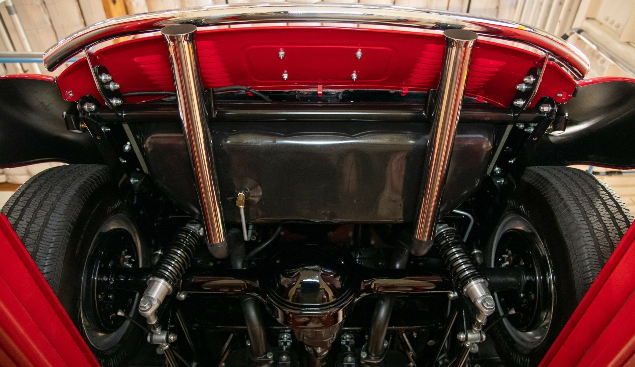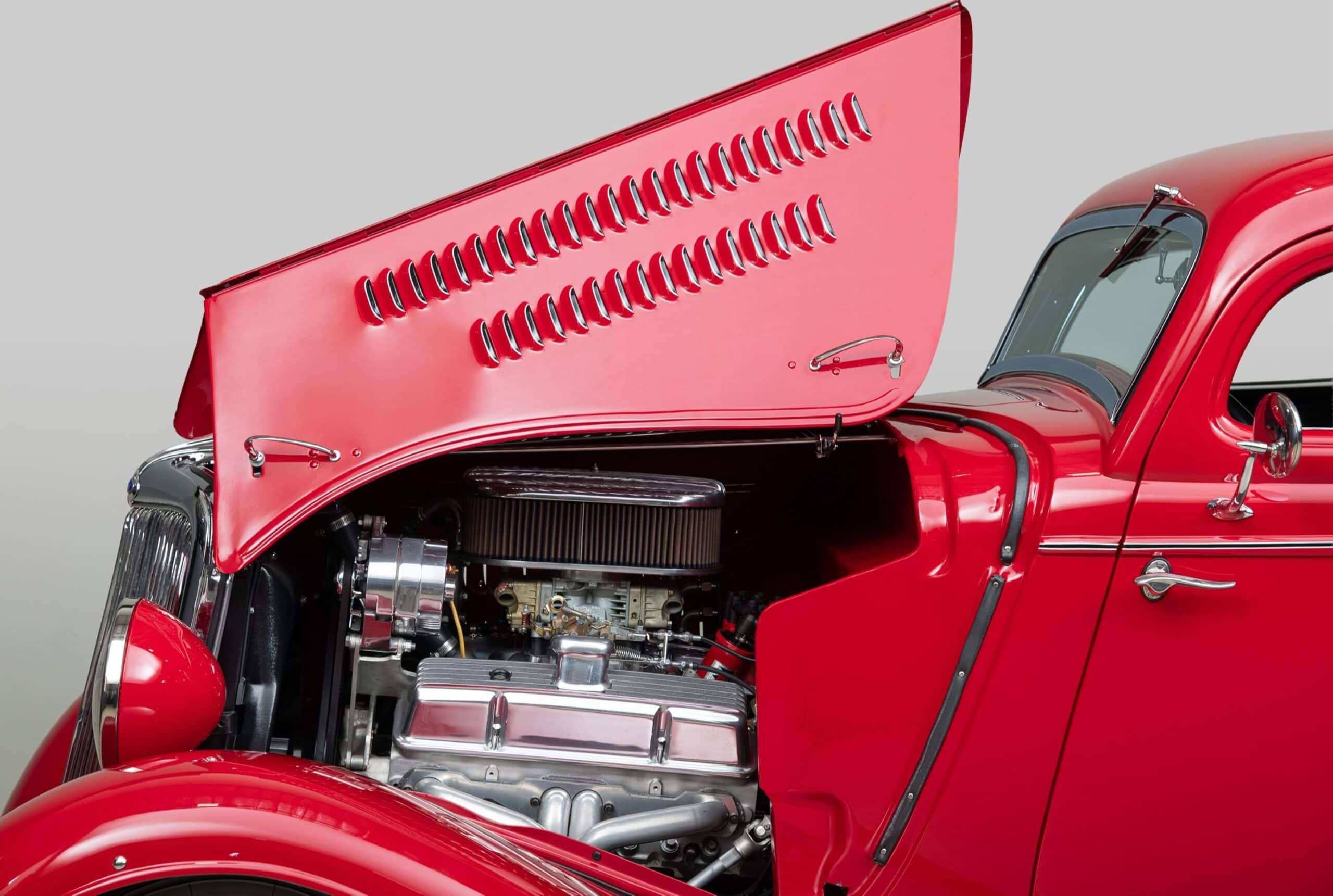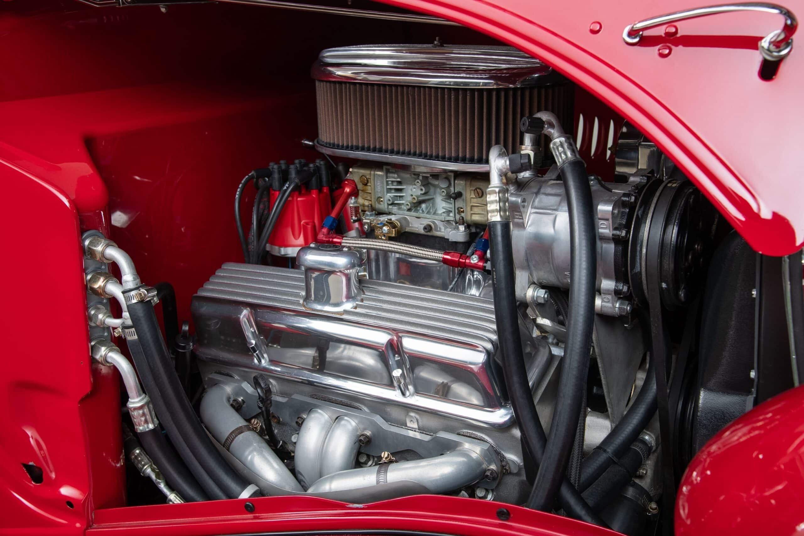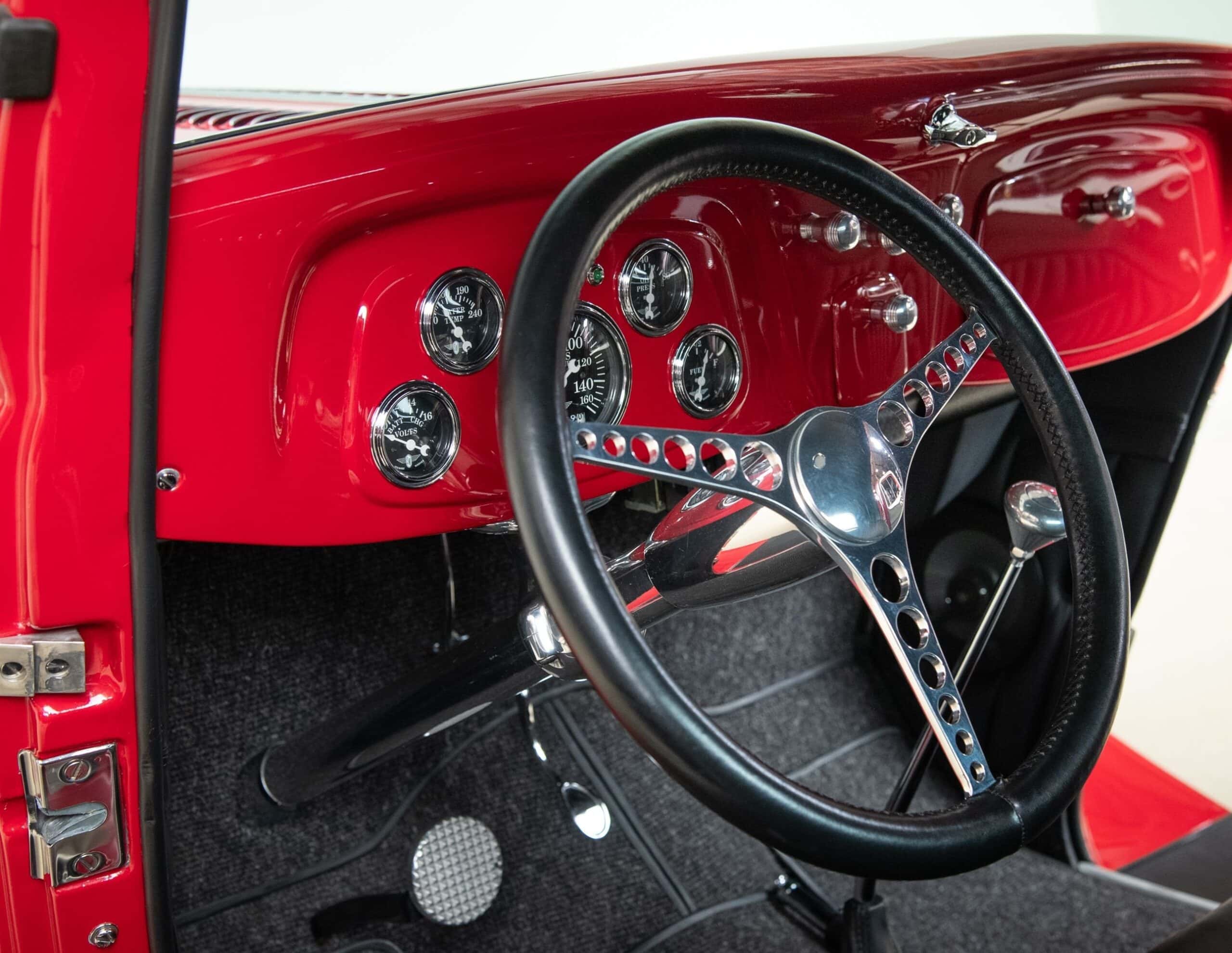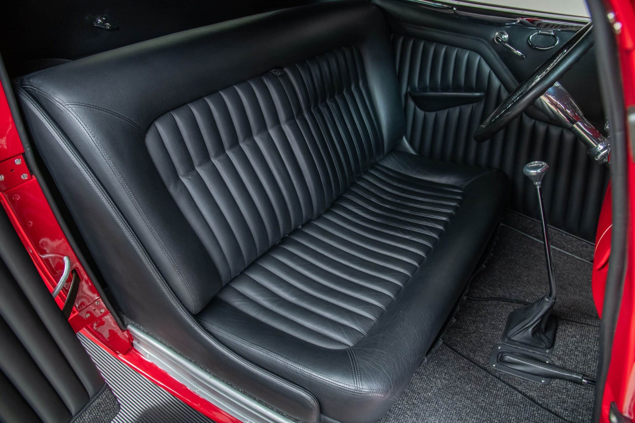 Mais aussi avec les barres de protection latérales inspirées du style “California Kid”. Eric Vaughn fut chargé de percer des ouïes d’aération dans le capot et le tablier et, après une peinture rouge Murano impeccable, le légendaire peintre de filets Dennis Rickleffs termina le coupé avec des lignes noires et blanches contrastées. Le châssis d’origine du coupé fut ensuite équipé d’un essieu abaissé, de barres de torsion et d’amortisseurs “Pete & Jakes”…
