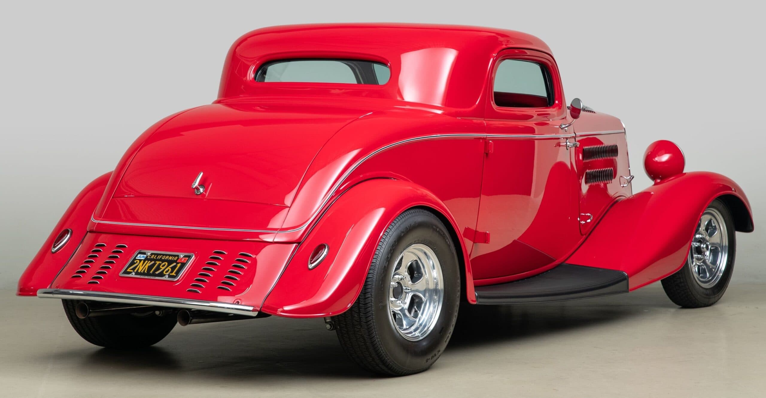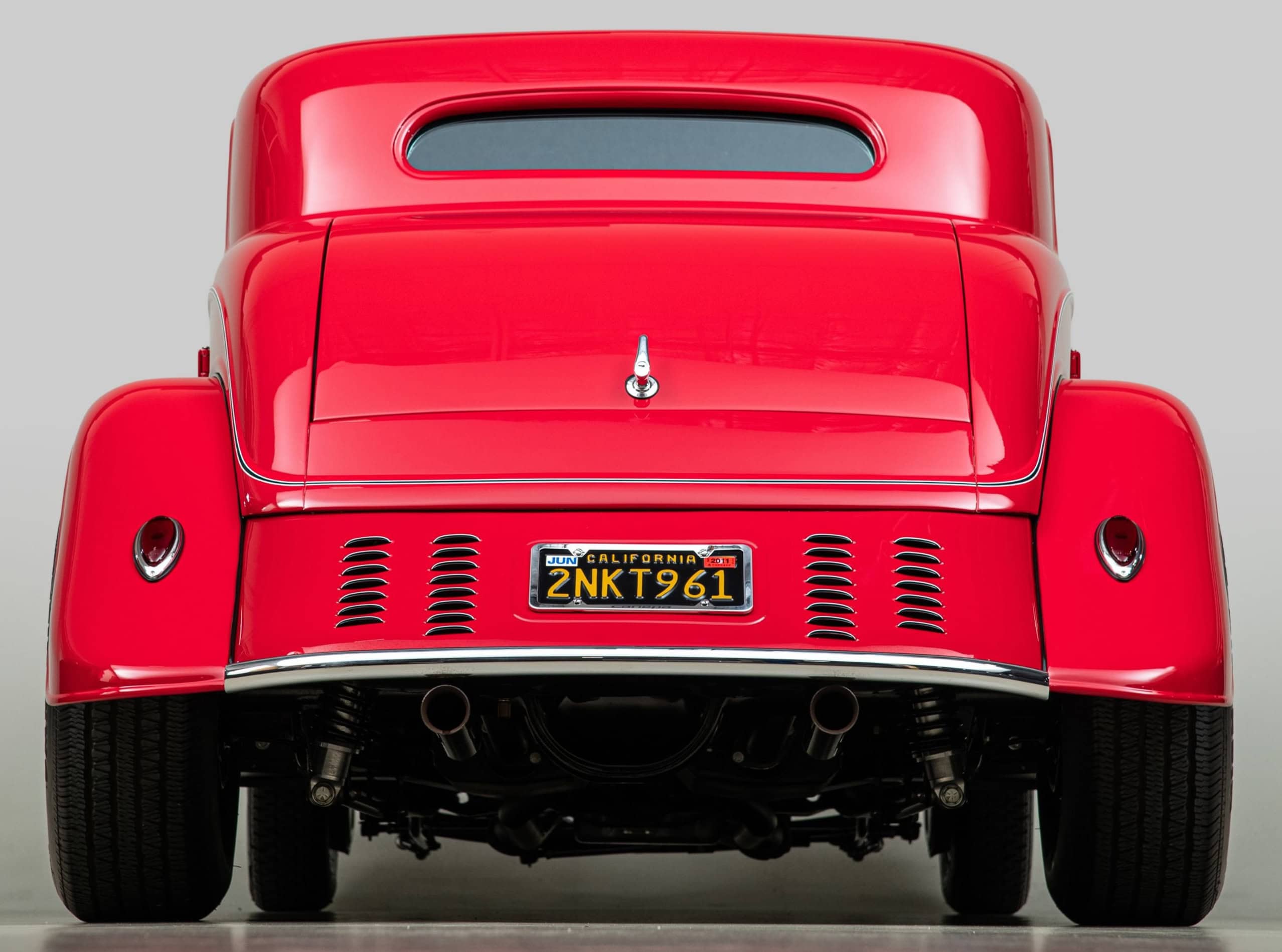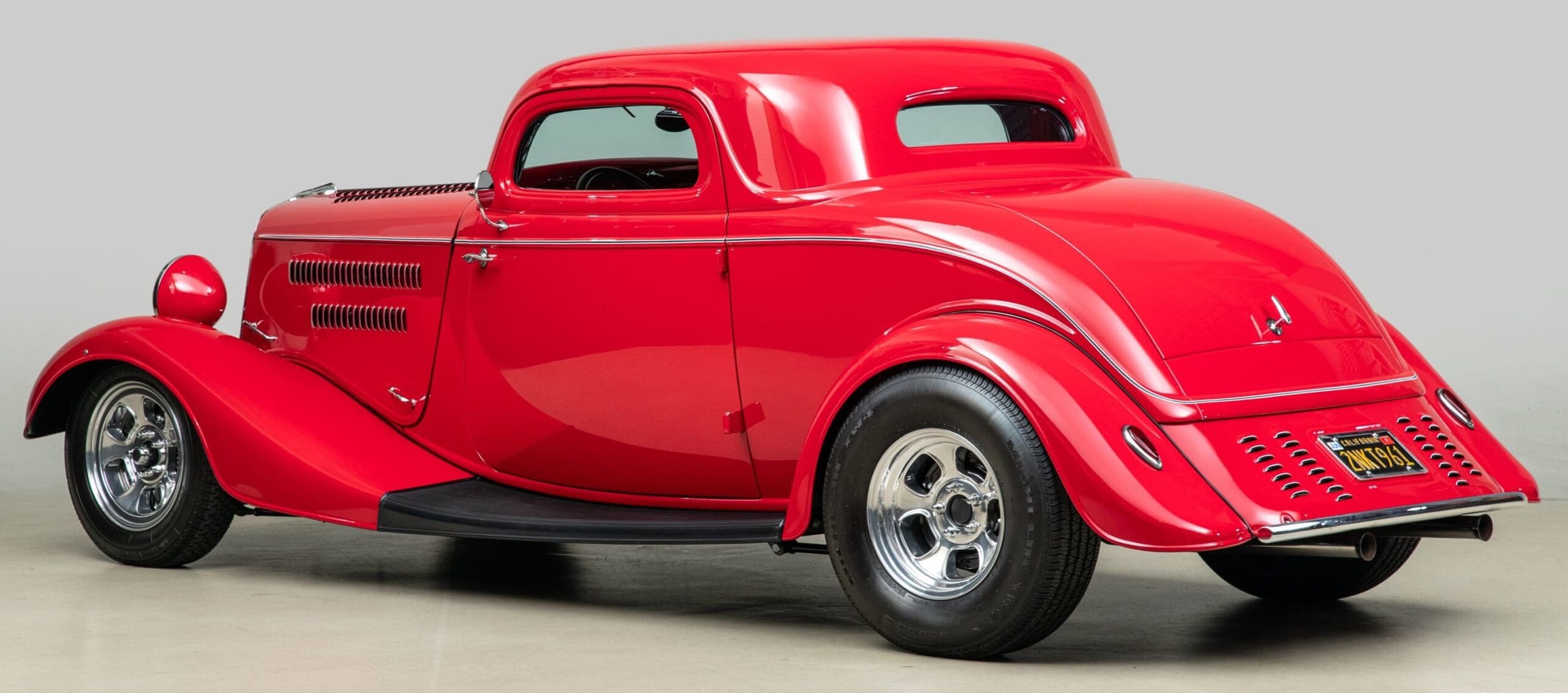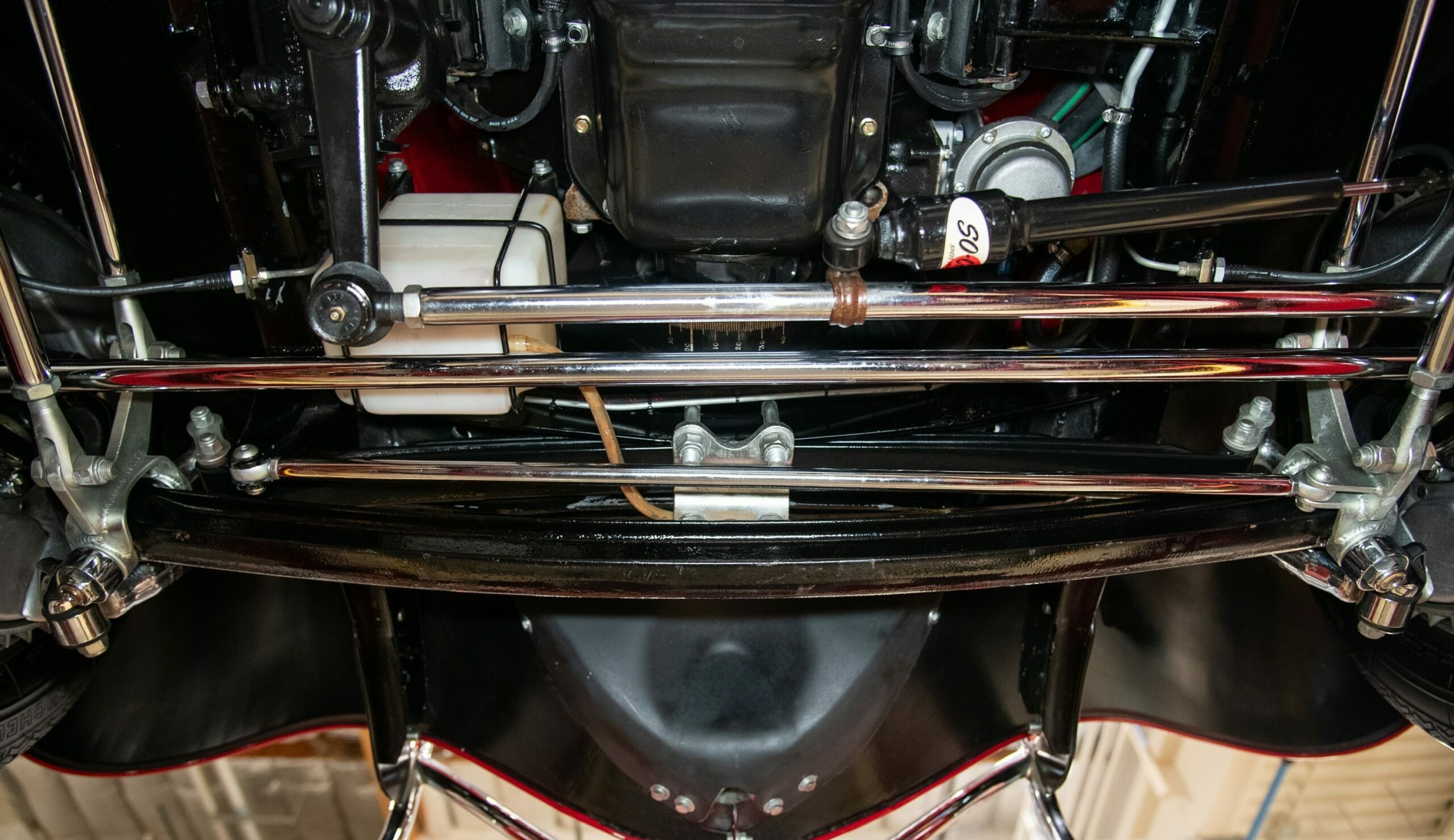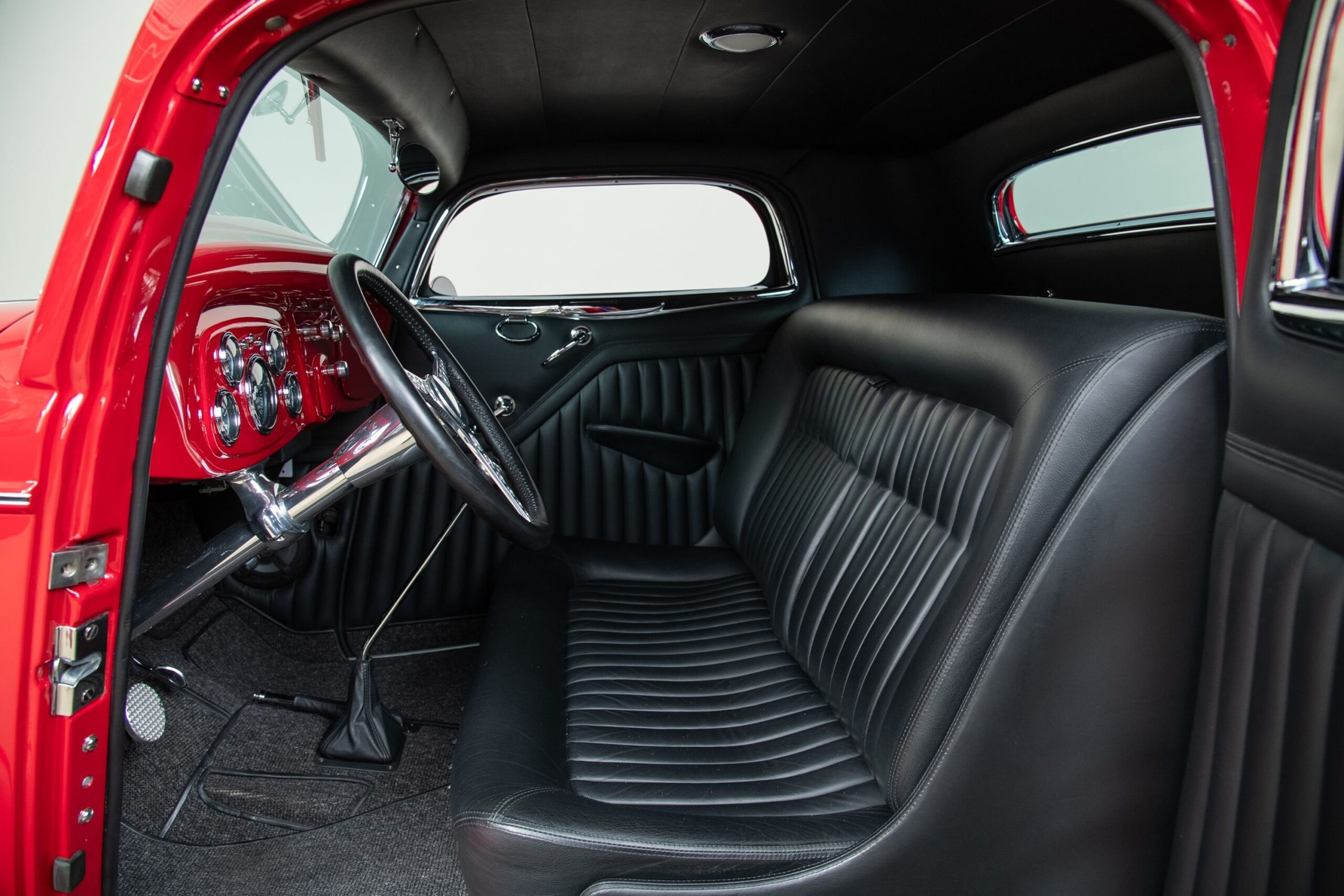 Mais aussi avec les barres de protection latérales inspirées du style “California Kid”. Eric Vaughn fut chargé de percer des ouïes d’aération dans le capot et le tablier et, après une peinture rouge Murano impeccable, le légendaire peintre de filets Dennis Rickleffs termina le coupé avec des lignes noires et blanches contrastées. Le châssis d’origine du coupé fut ensuite équipé d’un essieu abaissé, de barres de torsion et d’amortisseurs “Pete & Jakes”…