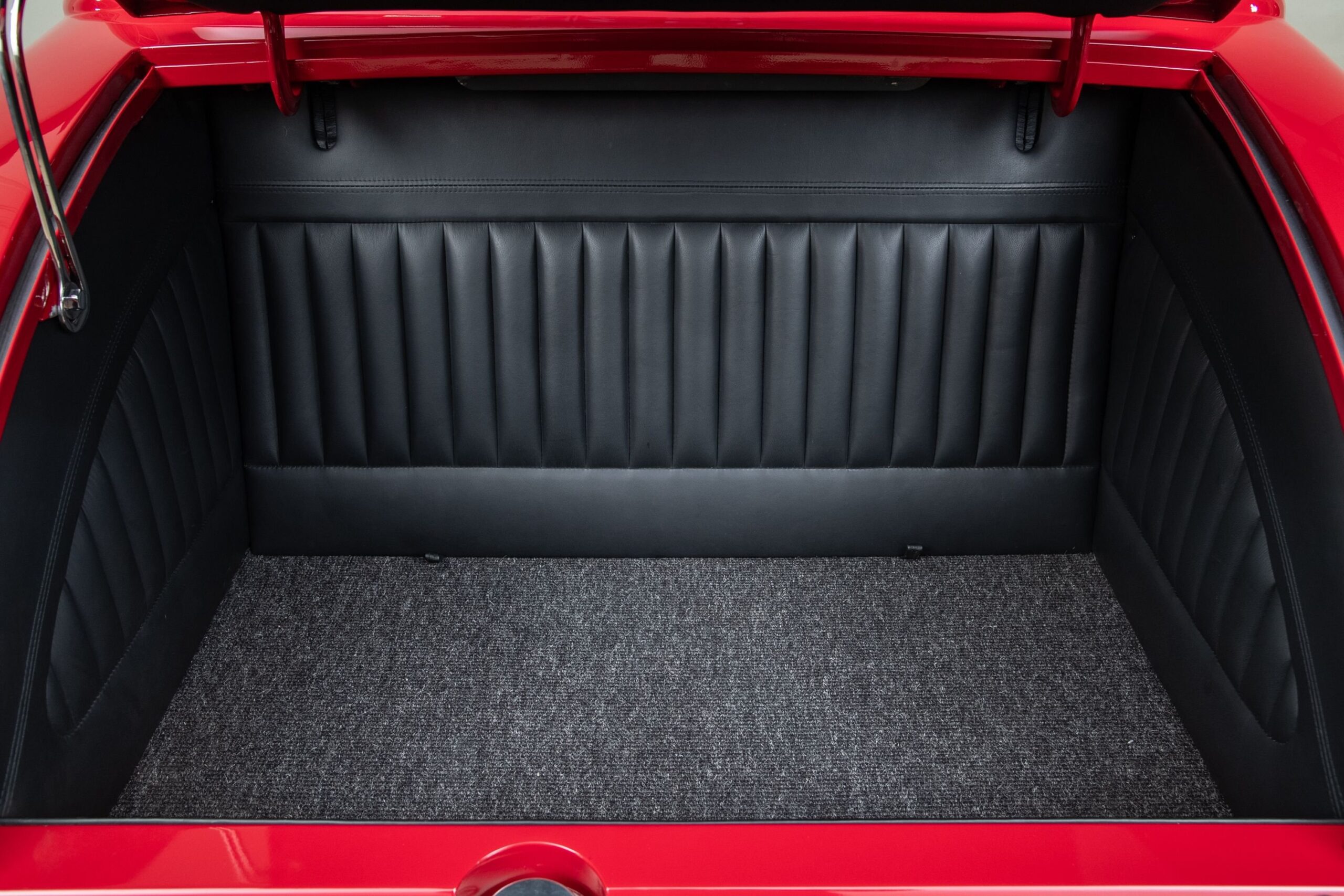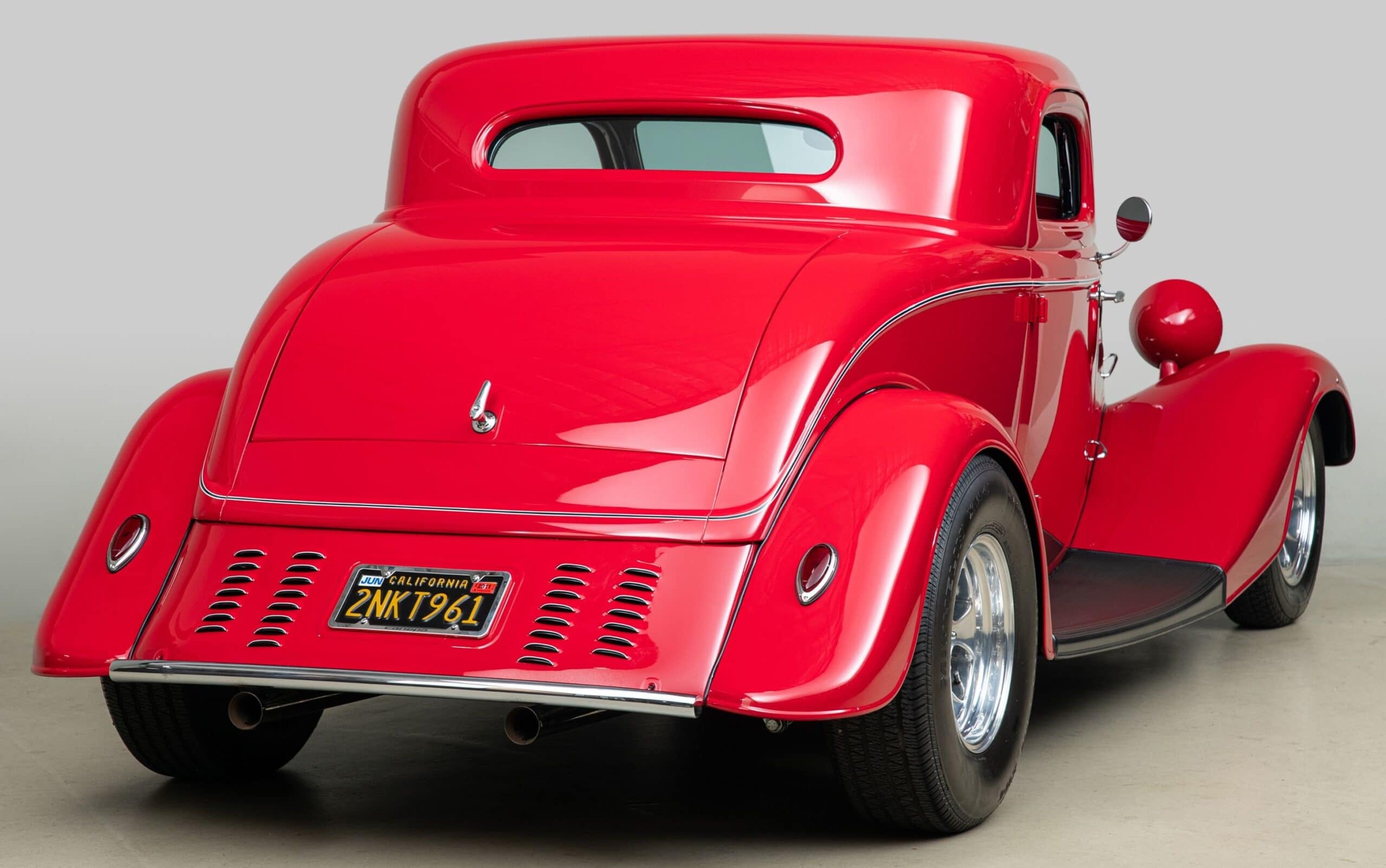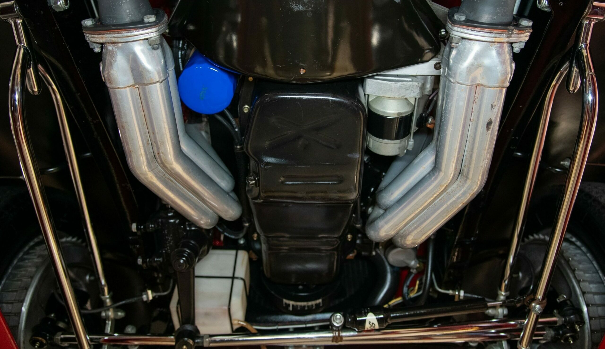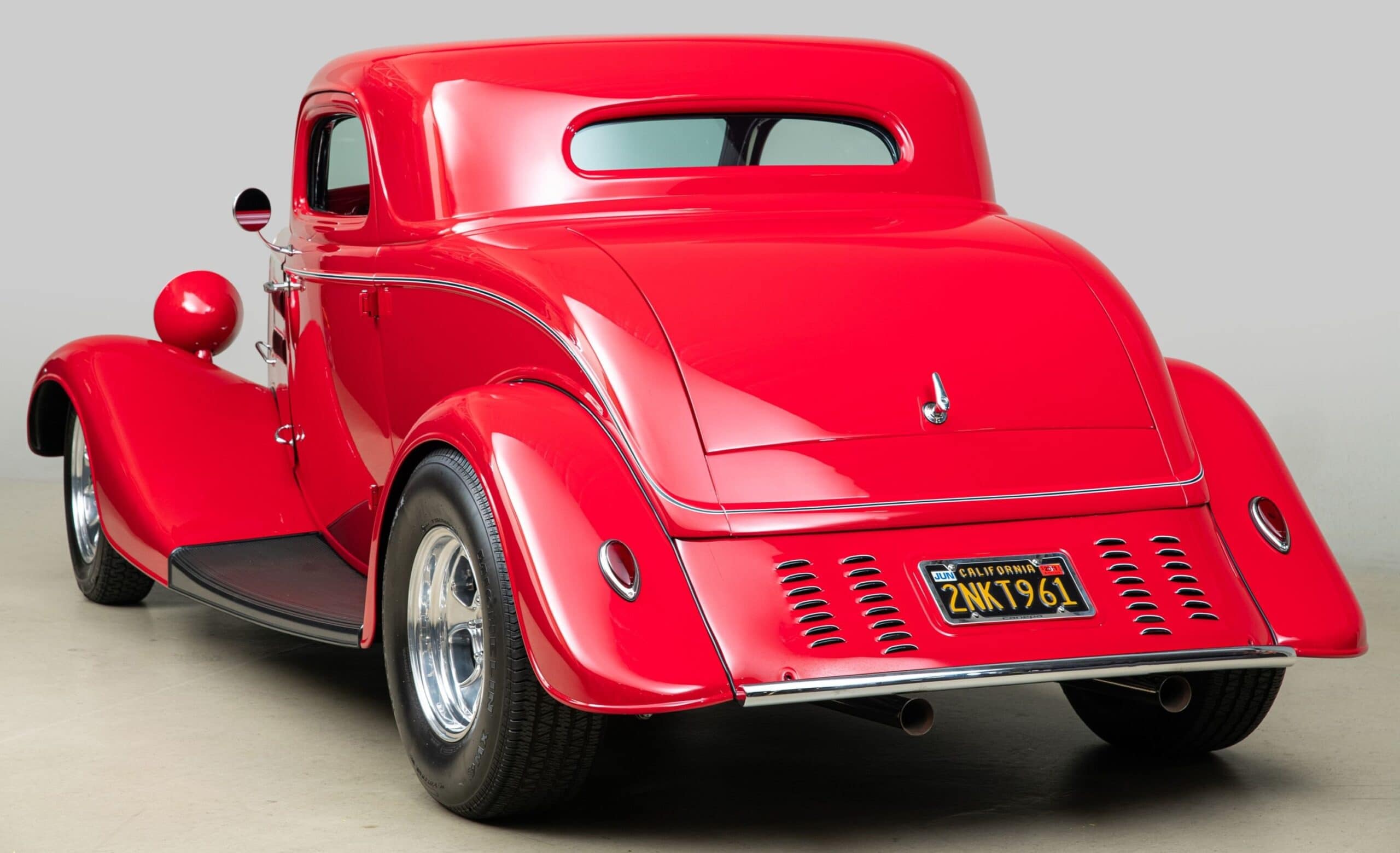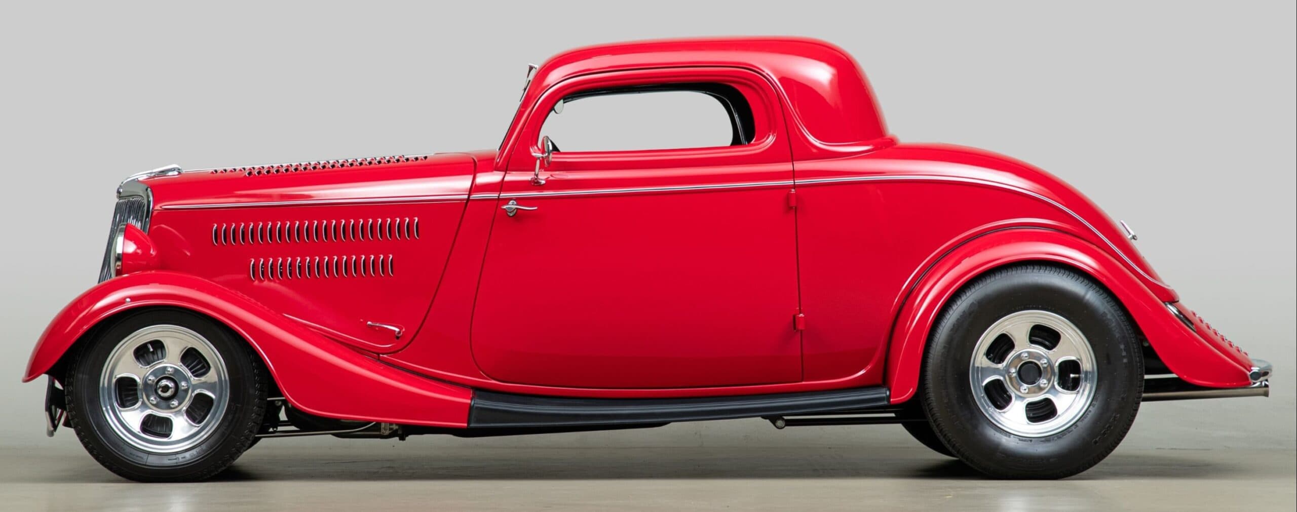 Mais aussi avec les barres de protection latérales inspirées du style “California Kid”. Eric Vaughn fut chargé de percer des ouïes d’aération dans le capot et le tablier et, après une peinture rouge Murano impeccable, le légendaire peintre de filets Dennis Rickleffs termina le coupé avec des lignes noires et blanches contrastées. Le châssis d’origine du coupé fut ensuite équipé d’un essieu abaissé, de barres de torsion et d’amortisseurs “Pete & Jakes”…