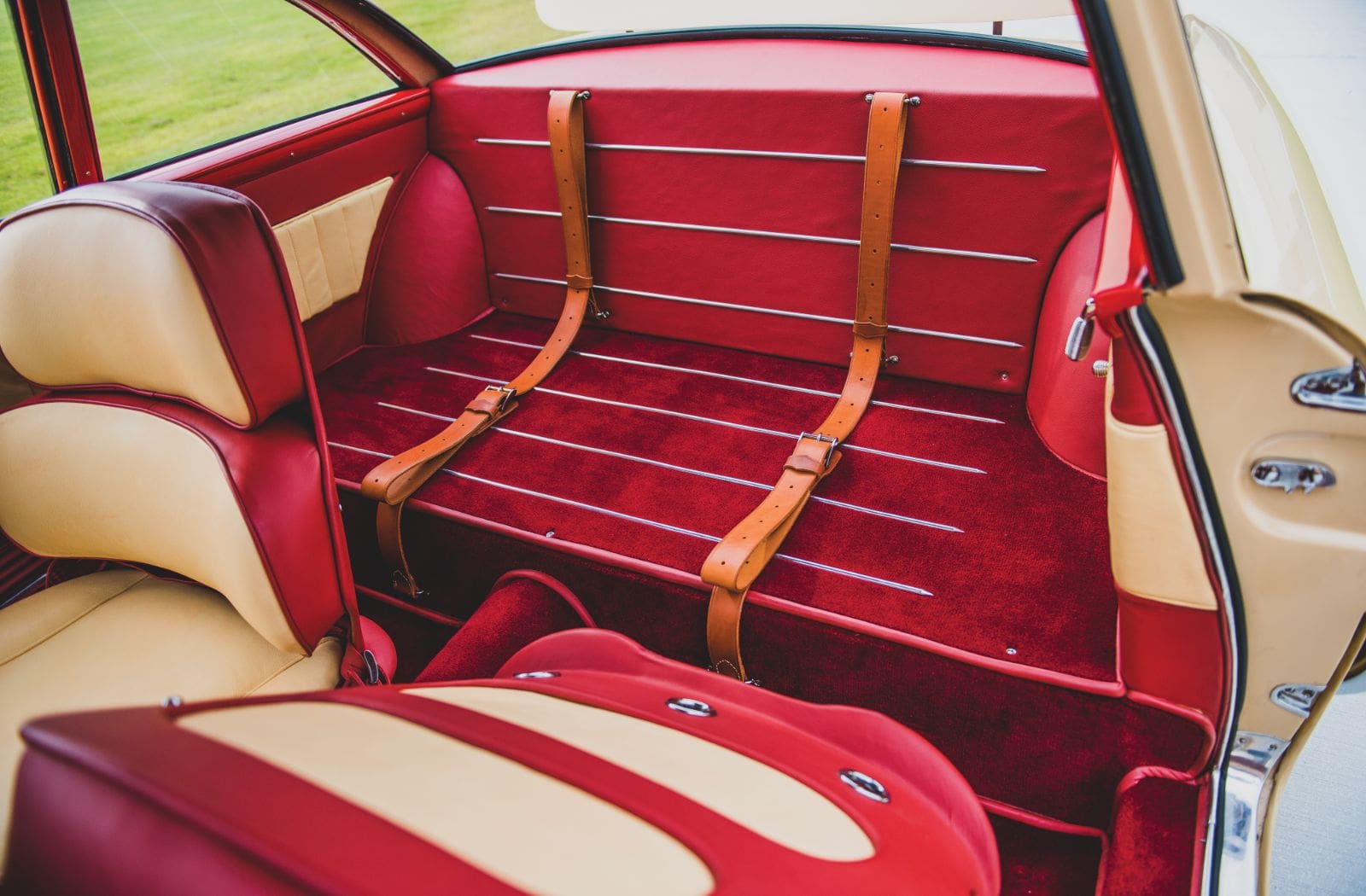 Toutes les Italia ont été livrées avec une peinture jaune/crème et un intérieur en rouge et crème. La voiture supposée avoir été propriété de Liberace a été récemment restaurée à son état d’origine. L’un des éléments de style les plus exotiques de l’Italia est la découpe de la porte qui s’étend dans le toit. La forme sans fioritures a été dramatisée par les roues à rayons Borrani et les trois tubes à l’arrière dans lesquels les feux arrière sont logés. À l’intérieur, l’Italia était rouge vif. La voiture illustrée ici a été restaurée par Hyman Ltd. Classic Cars de St. Louis. C’est le troisième Italia construite.