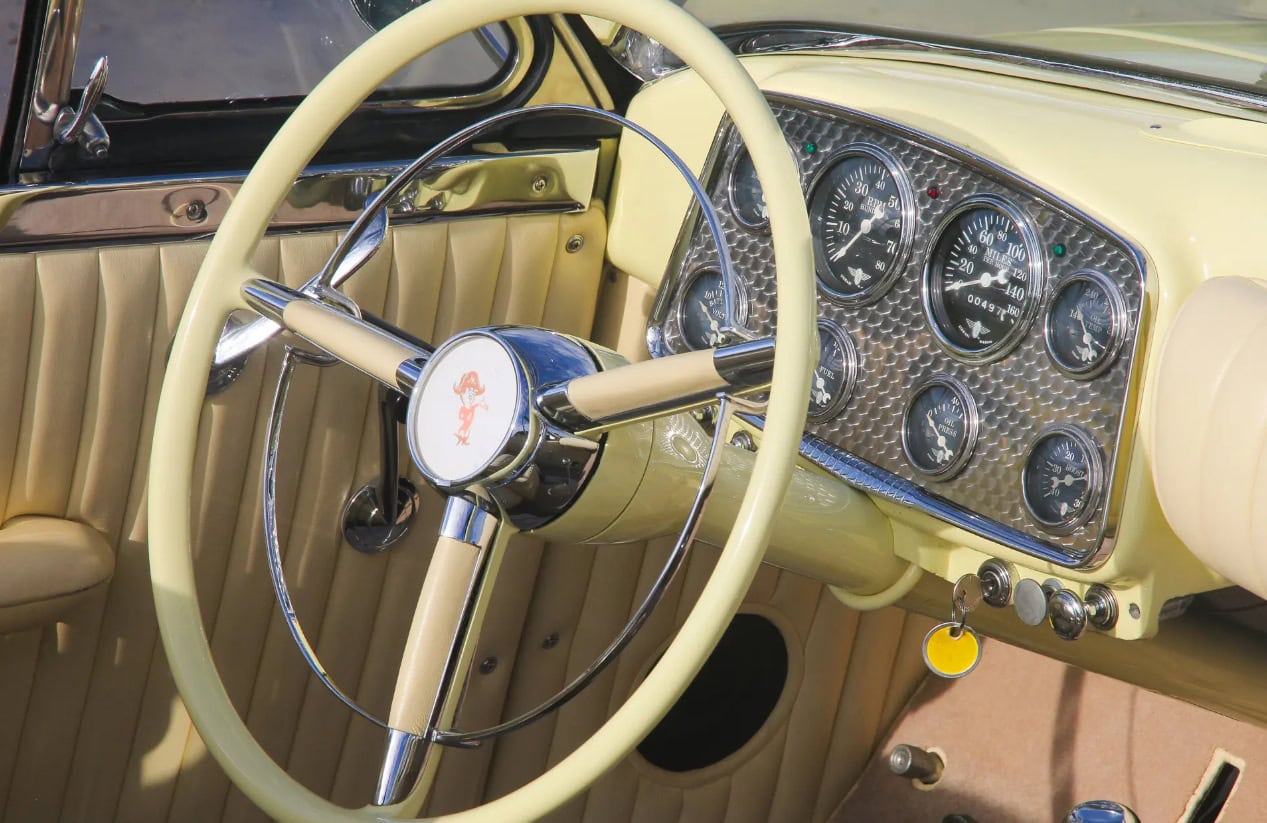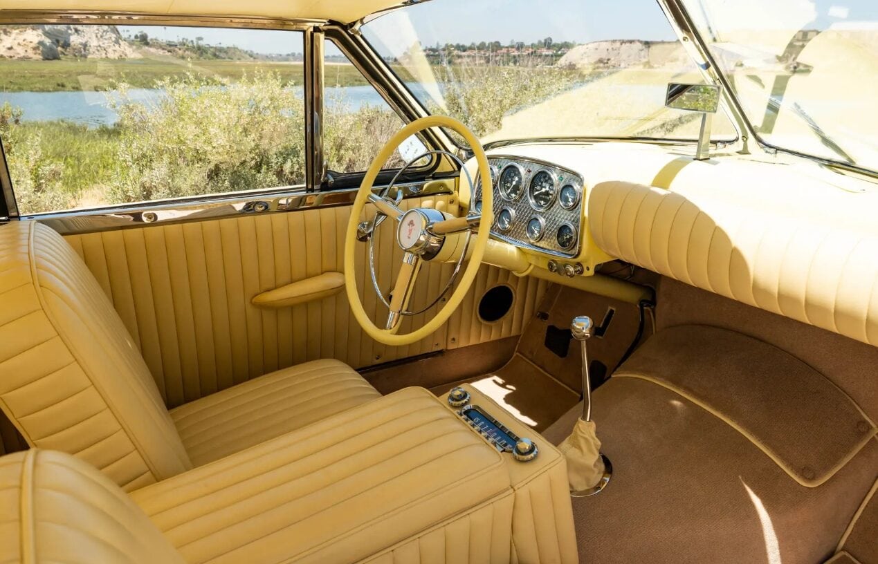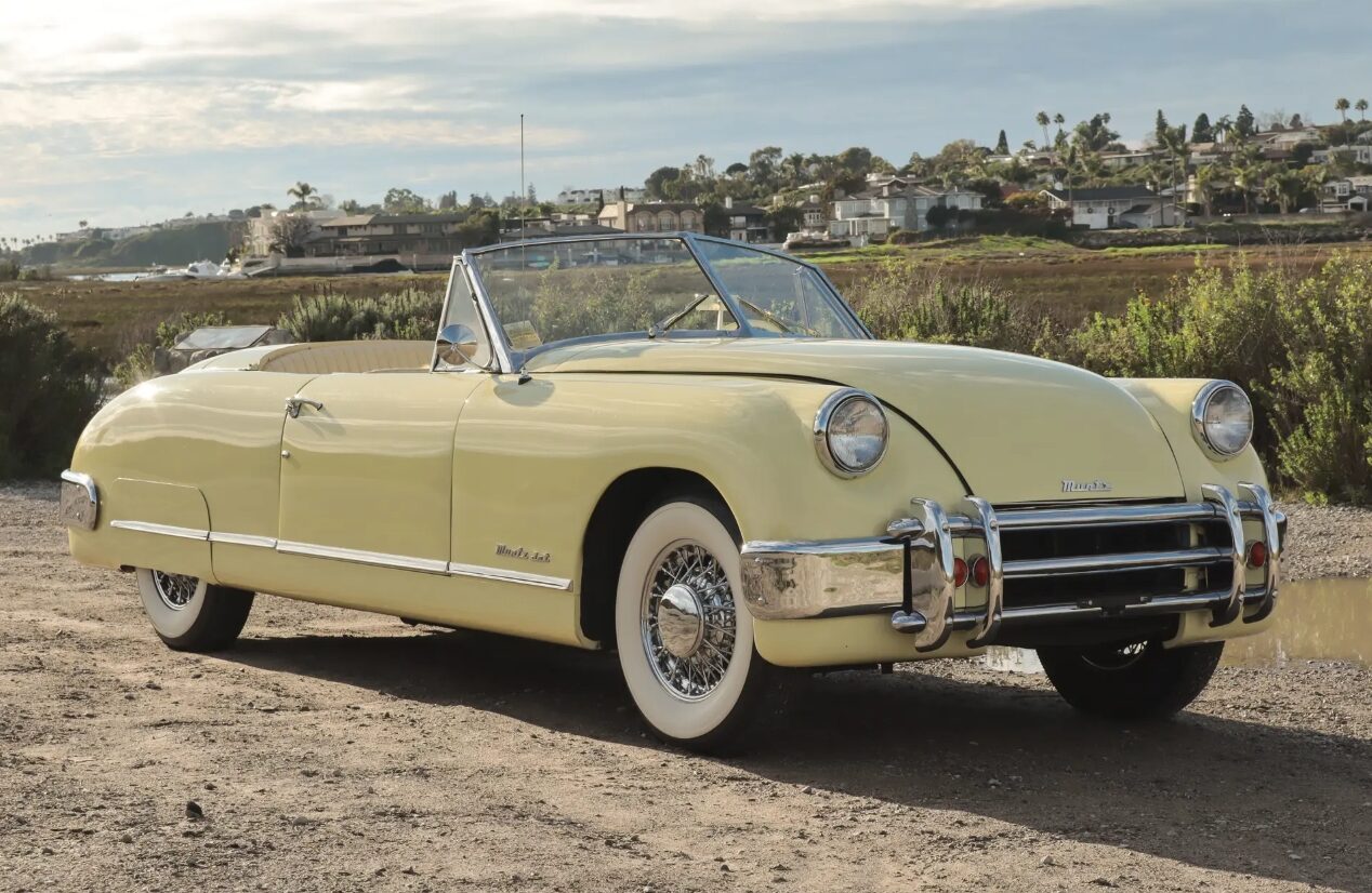 La Jet de Muntz vit le jour lorsque l’audacieux homme d’affaires acquit en 1950 le design “Jet Muntz” de Frank Kurtis pour construire et commercialiser un cabriolet sport à carrosserie enveloppante. Muntz allongea la voiture en 4 places et la rendit plus confortable avec un intérieur inspiré des hors-bord, doté d’un tableau de bord de type aéronautique, de sièges capitonnés et plissés, et d’une glacière intégrée pour les cocktails.