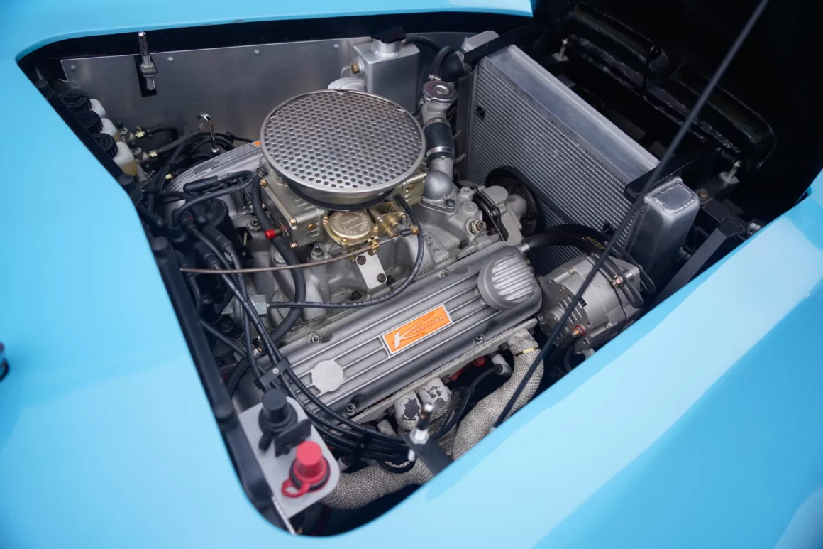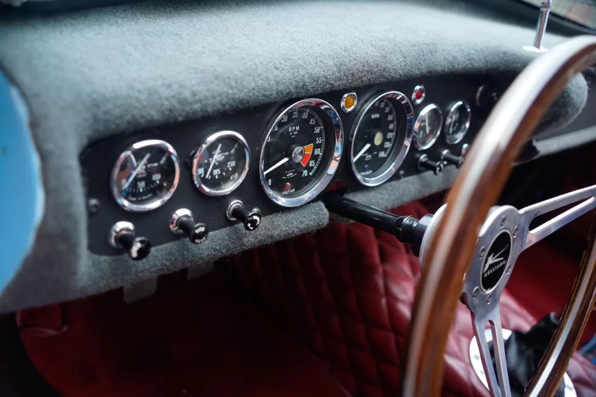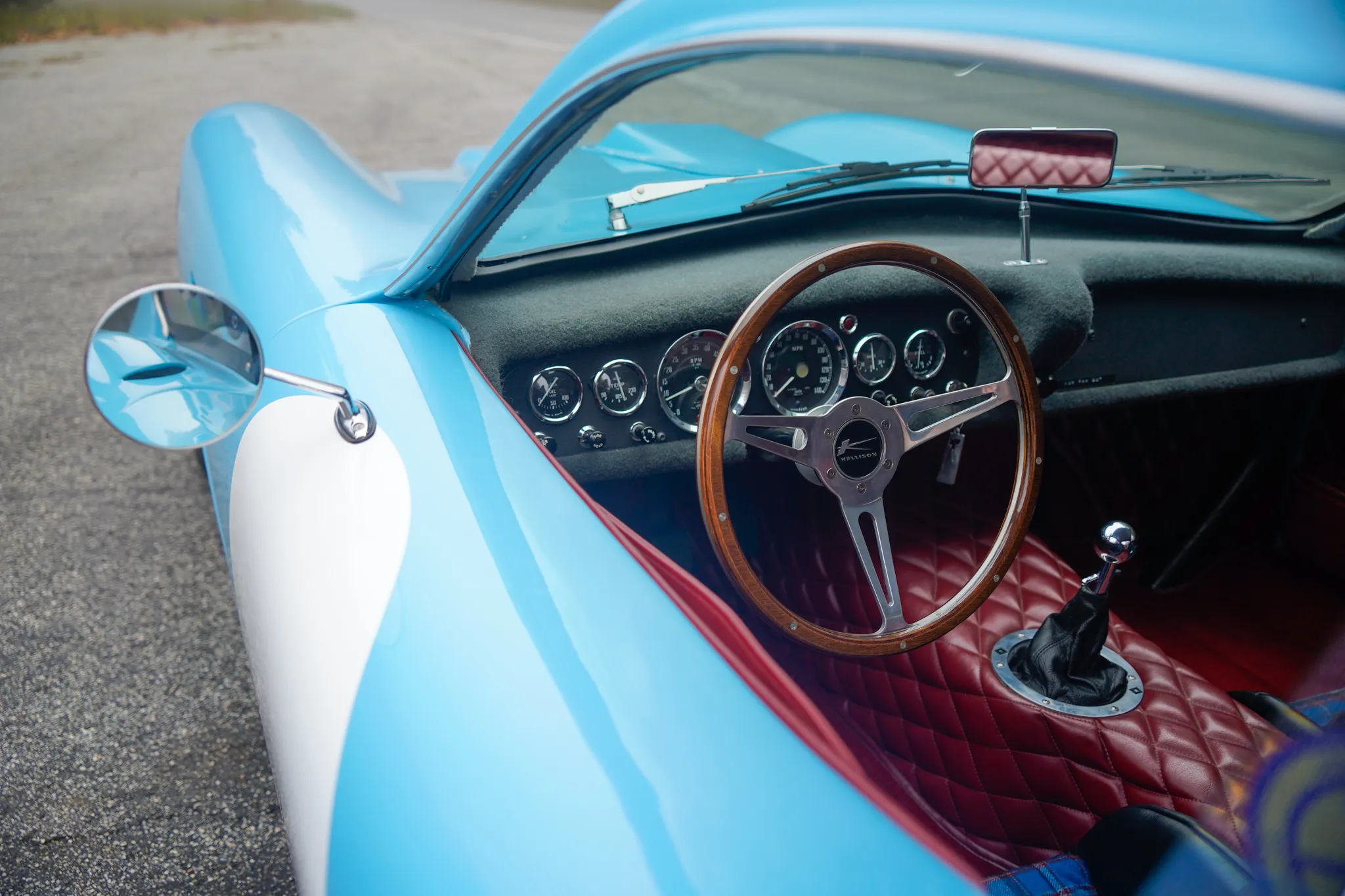 C’est une caractéristique régulièrement absente des voitures en fibre de verre construites à la main. Le travail lumineux extérieur se limitait toutefois à une garniture légère soulignant l’ouverture latérale, des enjoliveurs centraux de roue de marque Kellison et un emblème de capot singulier, tous minimalistes et bienvenus dans cette conception. Les détails de la carrosserie comprenaient une légère réduction du bord de la culbuteuse permettant une sortie d’échappement latérale, une petite pelle de capot et des ouvertures d’ailes arrière pour diminuer la faible possibilité de refroidissement des freins arrière. En fait, plus on passait de temps à regarder la voiture, plus on commençait à réaliser que Lamm et son équipe de restauration avaient préparé correctement cette voiture. Le verre latéral, unique, et l’éclairage des clignotants inférieurs étaient deux autres exemples de résolutions de conception intelligentes sans succomber au malaise du marché secondaire ou des billettes souvent vu dans les restomods ou les Custom-cars.