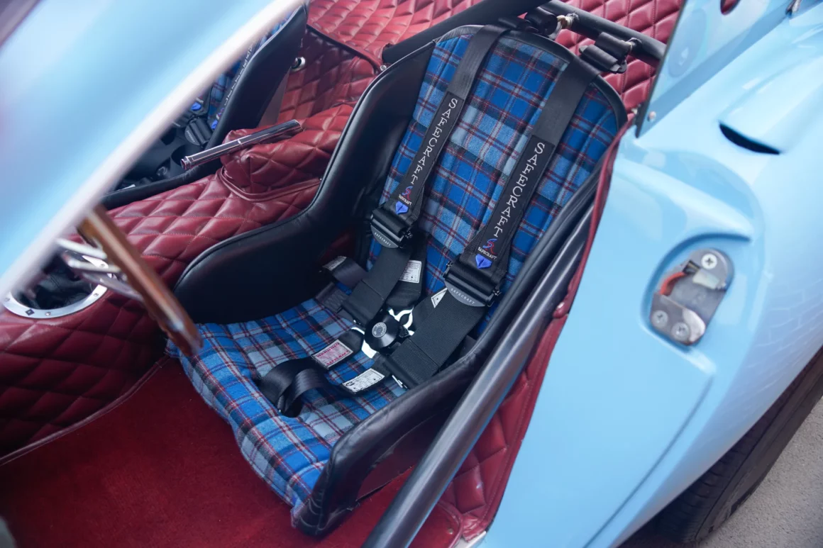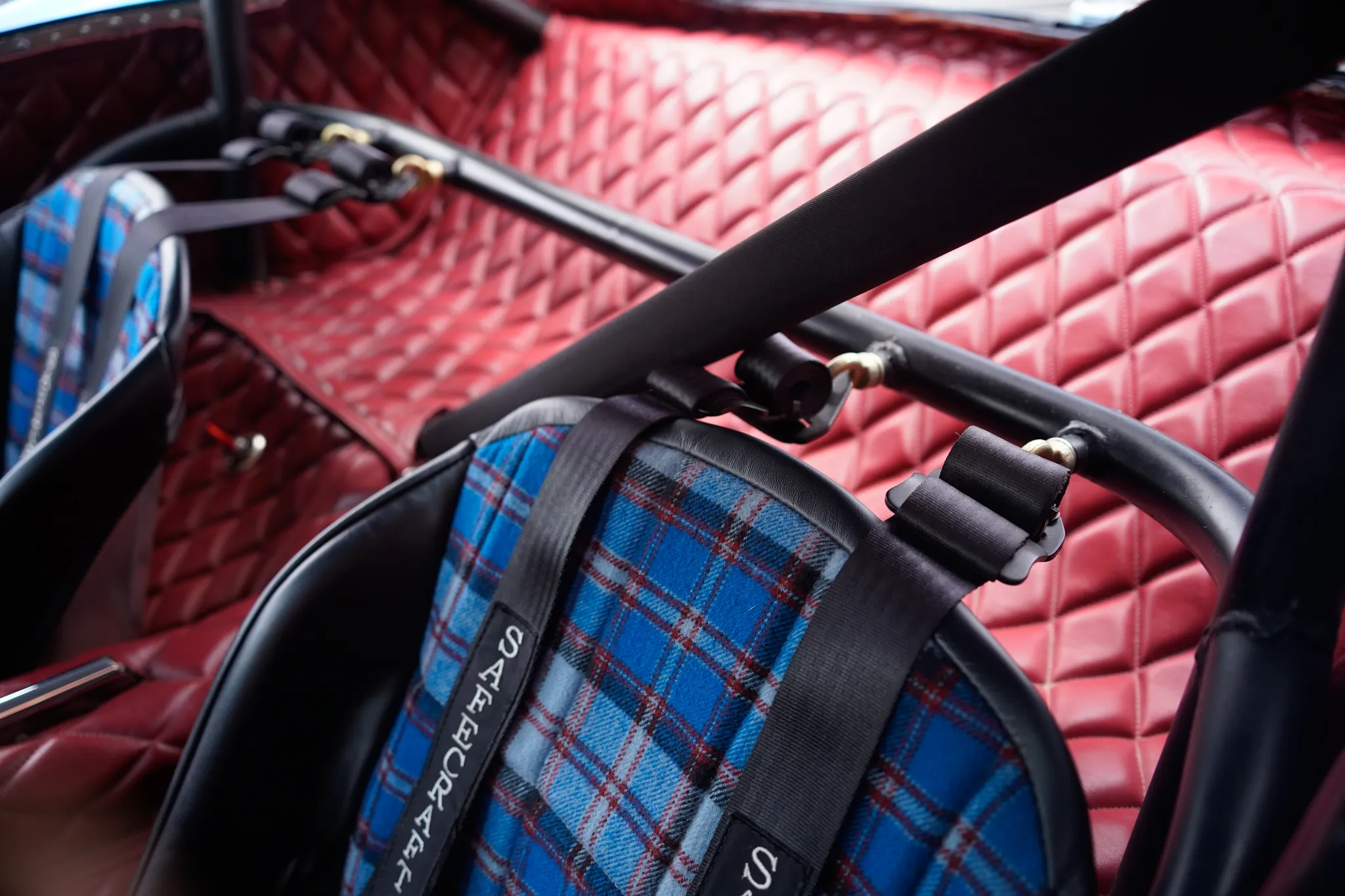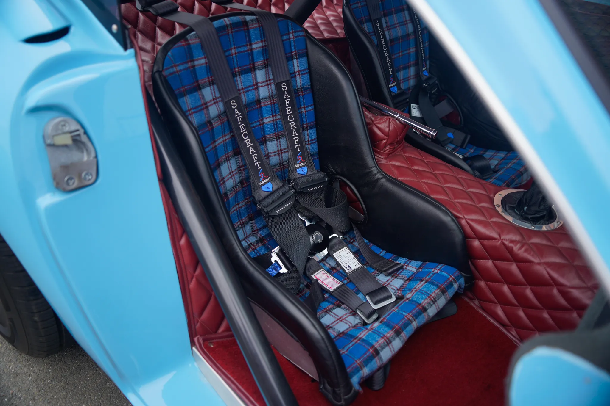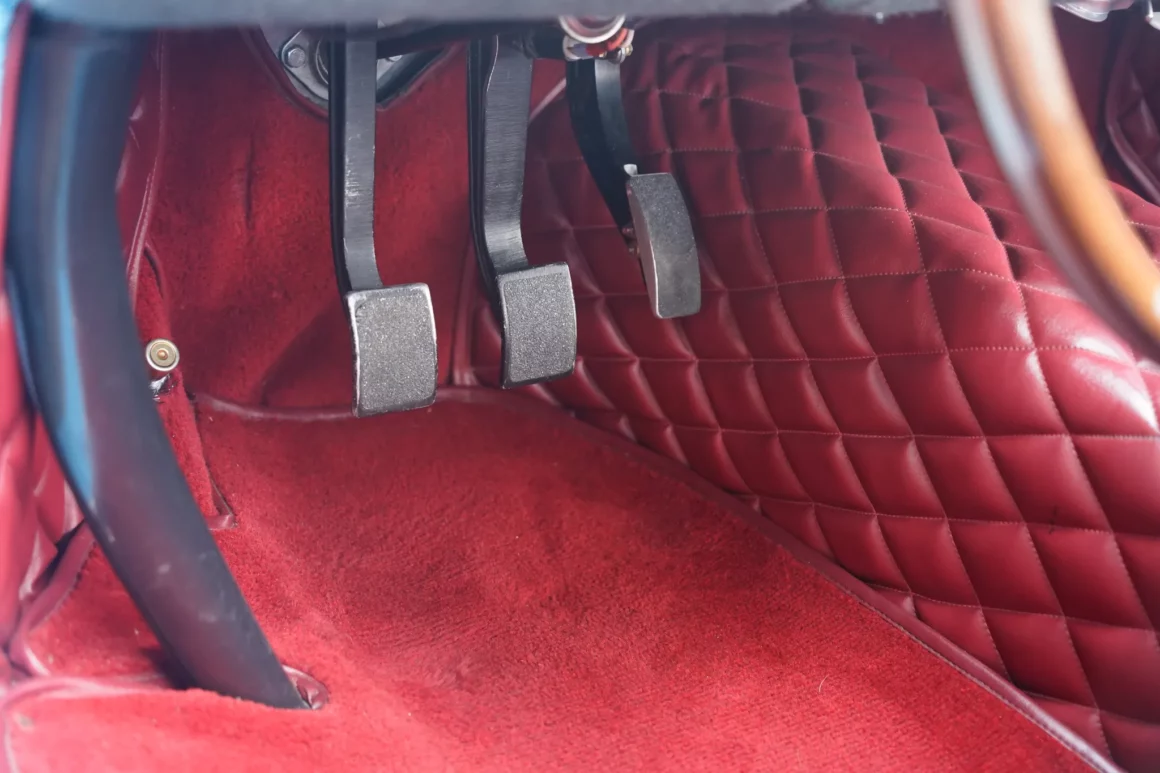 Les choix de matériaux et de couleurs étaient risqués pour l’exposition de Peeble Beach mais bien résolus avec du vinyle touffeté rouge foncé cousu dans les portes et la console avec un tapis rouge et des sièges baquets profilés en tissu à carreaux. Un ensemble de ceintures de sécurité de compétition Safecraft était installé avec des ancrages de barre de soutien arrière et des fermoirs à dégagement rapide du moyeu central. Le panneau du tableau de bord était en excellent état recouvert de fourrure Zeus, étrangement en harmonie avec l’ambiance intérieure. Les jauges principales et les petits instruments avaient une excellente couleur assortie et de belles lunettes chromées. Le compteur kilométrique indiquait un peu plus de 2 200 milles, qui avaient probablement tous été amassés avec Lamm au volant et dont 1000 avaient été acquis au milieu des bourrasques de pluie soudaines… Il a été souligné que la zone de rangement arrière offrait juste assez d’espace pour quelques sandwichs de charcuterie, tandis que le reste de l’espace intérieur était consommé…
