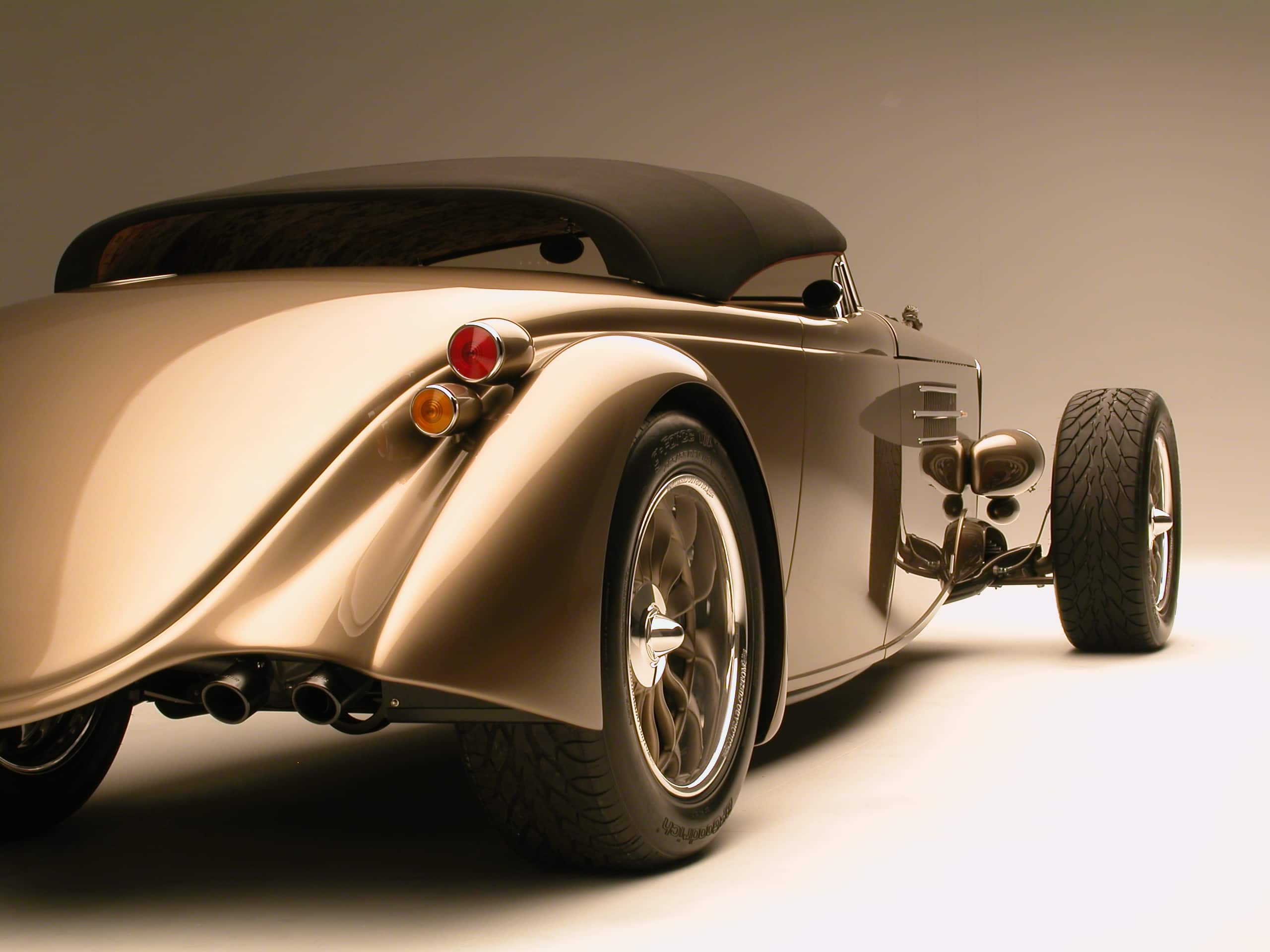 “Posies” a toujours admiré les légendaires carrossiers d’Europe, des noms comme Bertone, Ghia et Pininfarina d’Italie : Karmann d’Allemagne : Figoni de France, qui tous fabriquaient d’élégantes machines artisanales uniques. C’est ce désir de faire une “déclaration” qui distingue les voitures de “Posies” des autres artisans du Hot-Rodding qui a été le moteur de son entreprise. Il n’était, par exemple, pas intéressé à faire un highboy’32 bien exécuté (non pas qu’il ne l’ait pas fait), mais il préférait puiser dans son esprit fertile pour fabriquer “quelque chose” de complètement différent.