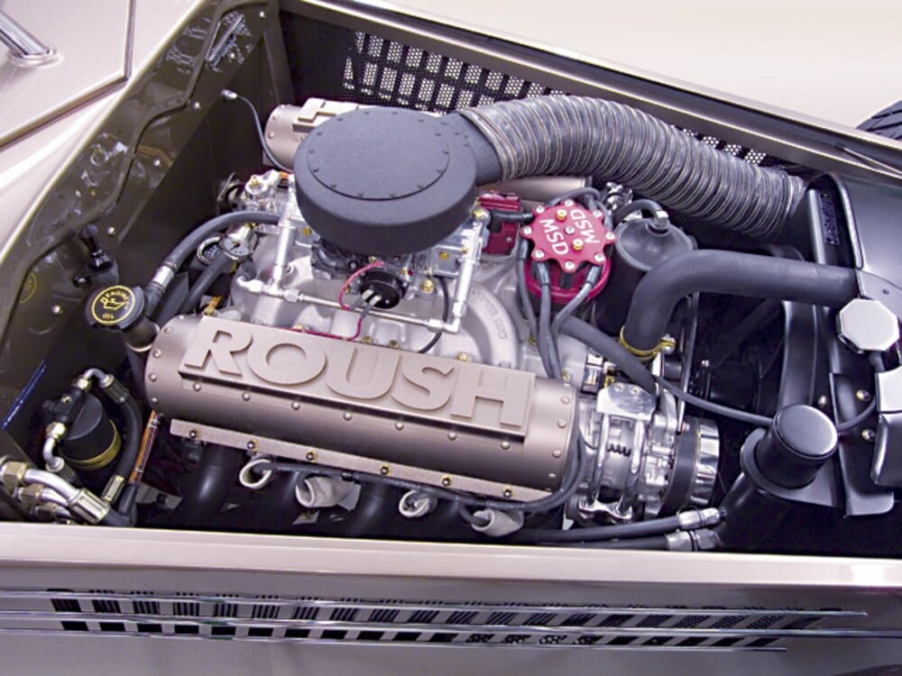 Les autres points forts sont les jantes Colorado Custom 18s à l’avant et 20s à l’arrière, ainsi que les pneus BFGoodrich g-Force T/A. La puissance provient de “Roush Performance”, un V8 531ci avec plus de 500 lb-pi de couple avec des têtes en aluminium, un Holley 750-cfm à quatre corps, un allumage MSD et une prise d’air Roush /Snorkel. Le système d’échappement revêtu de HPC est une combinaison de collecteurs de tubes individuels de 2 pouces qui se déversent dans des tuyaux d’échappement de 2 1/2 pouces qui traversent quatre silencieux “Flowmaster Hushpower II” (oui, quatre). La puissance est transmise par une boite Ford Deltrans C6 trans (avec convertisseur) qui est associée à une Gear Vendors Under / Overdrive qui transforme la boîte automatique à trois vitesses en une six vitesses entièrement fonctionnelle.