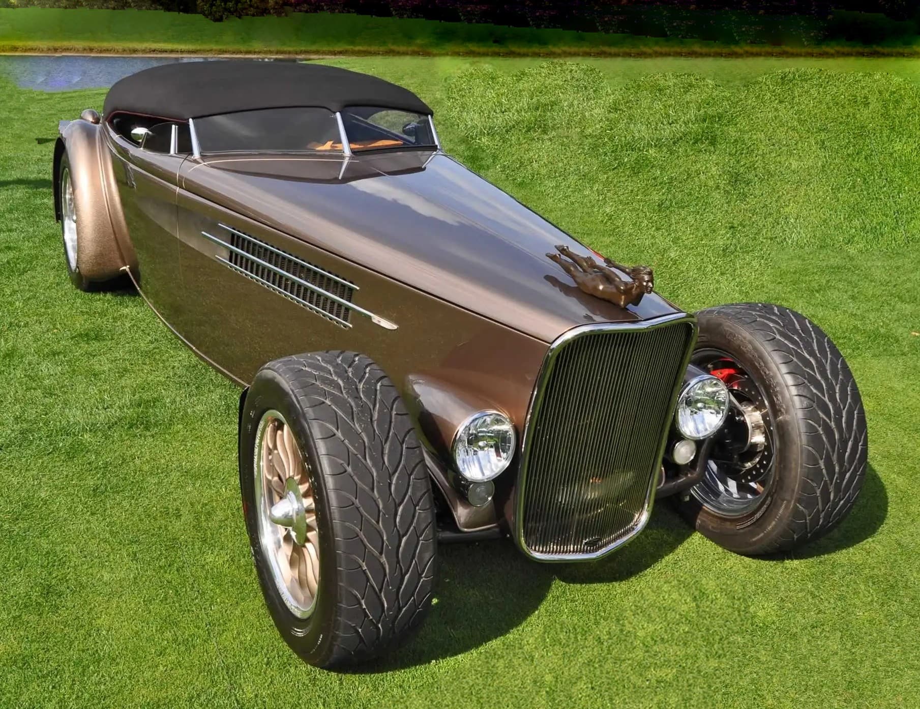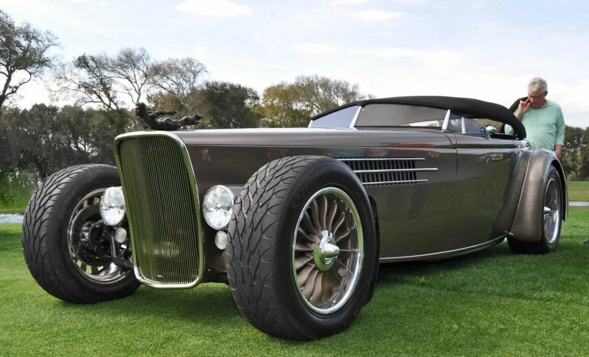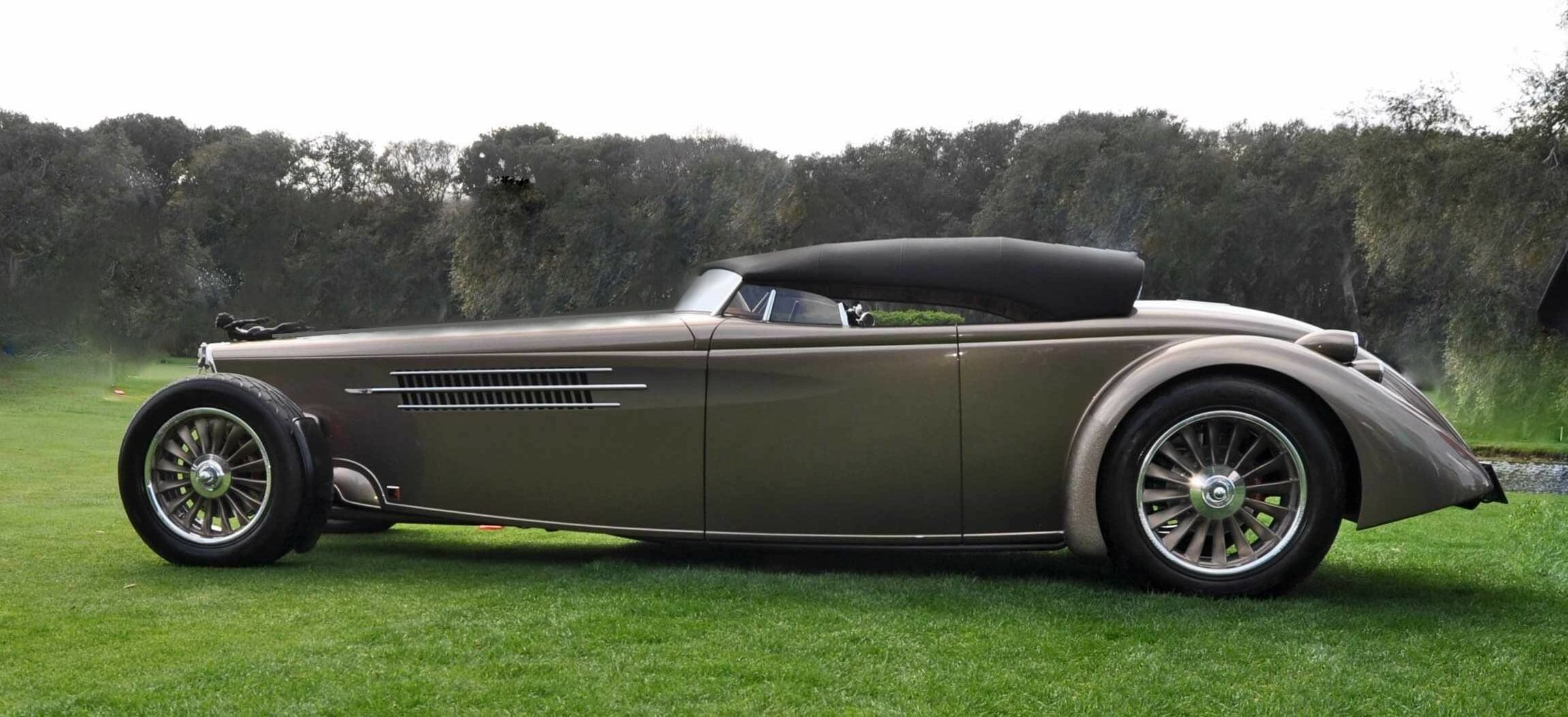3° L’AEROLINER SPORT a été inspiré par les constructeurs Français des années ’30, Posies a adopté des éléments de design de cette époque pour transformer une Ford’35 en une sorte d’automobile du Capitaine Némo : l’Aeroliner Sport. L’équipage de “Posies” a étiré un châssis jusqu’à 139 pouces et y a installé un V8 Roush 427ci qui produit un robuste 531cv. Mentionnons que la carrosserie est en aluminium avec le toit recouvert de tissu, une paire de sièges baquets Corvette, un système audio, un air conditionné Vintage et des freins Wilwood.