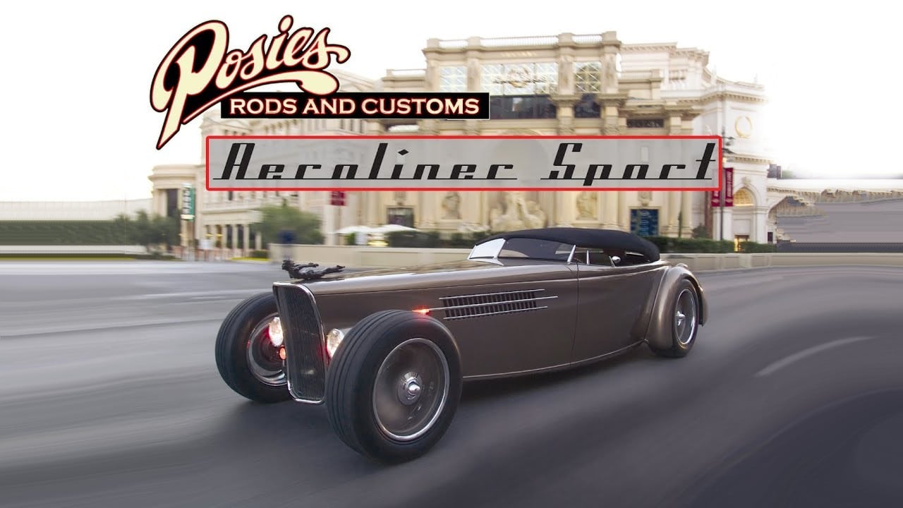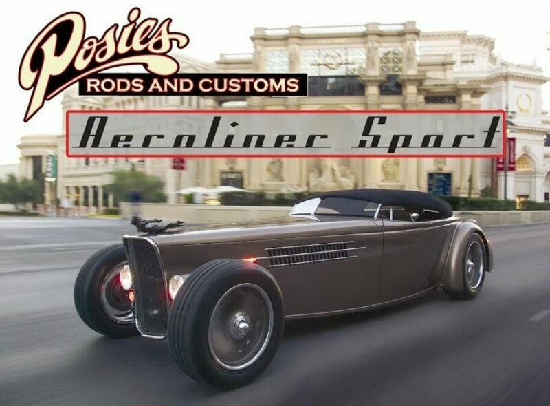 Cette voiture a été inspirée par l’ère sportive art déco Française des années 1930 , selon POSIES. Bien que cela semble assez simple (ou pas!), pour comprendre la base de l’Aeroliner Sport, nous devons remonter à 2001, lorsque POSIES a acheté une carrosserie de roadster Ford’35 Downs en fibre de verre. Ce n’est qu’à la fin de 2004 que le projet a commencé sérieusement -à raison de 12 heures par jour et 7 jours par semaine, jusqu’à ce qu’il fasse ses débuts sur le stand Flowmaster au SEMA Show 2005. Ironiquement, pour ramener la carrosserie en fibre de verre à POSIES, elle a été coupée en deux pour s’insérer dans la remorque. Une fois « collées » ensemble, les ailes arrière ont été déplacées vers l’avant de 9 pouces et la carrosserie rétrécie de 6 pouces.