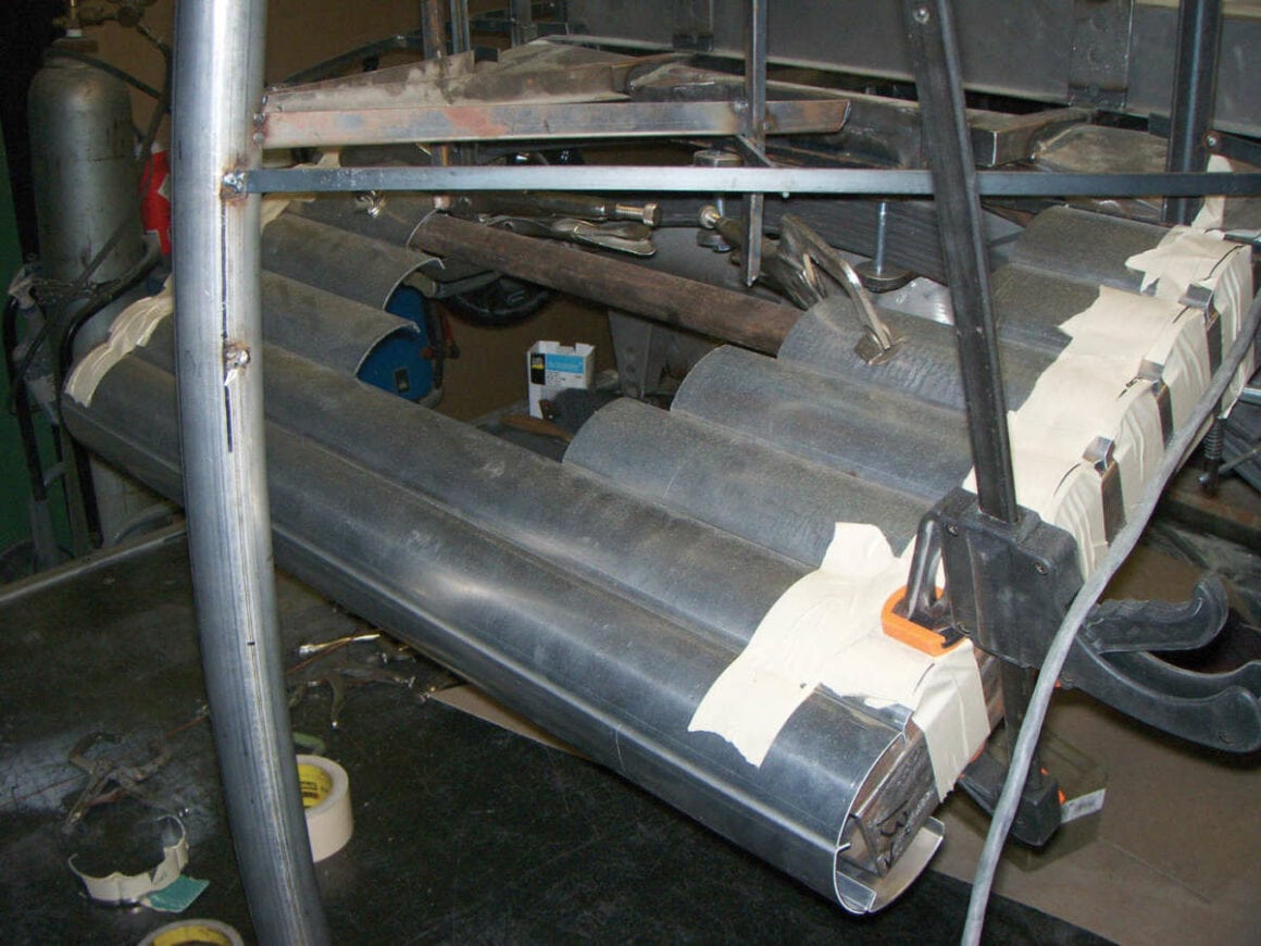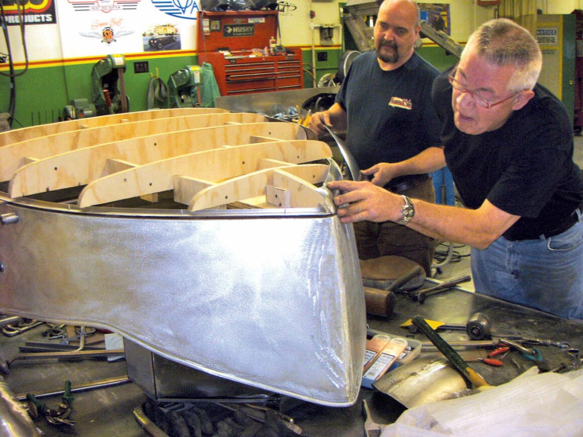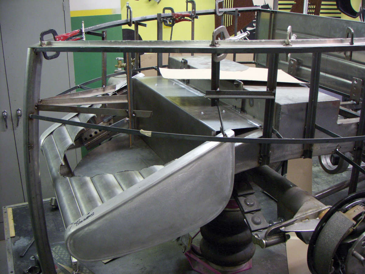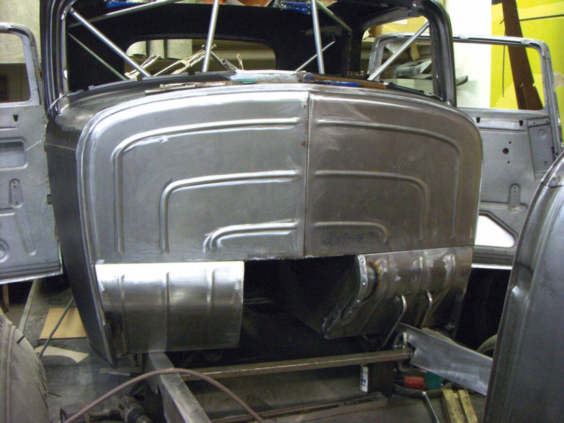 -Une fois la forme retravaillée, mes techniciens “Posies” ont ensuite placé la carrosserie sur le châssis afin que le reste des panneaux puisse être fabriqué. La cloison pare-feu a été soudée à partir de deux pièces jointes verticalement. L’arrière de la carrosserie a été incliné/cabré à l’aide d’un seul panneau, entourant l’arrière de la carrosserie qui portait le même thème que sur la cloison pare-feu. Les panneaux d’angle arrière ont été formés pour rencontrer les panneaux latéraux et arrière. La ligne de carrosserie Ford 1932 de série a été transportée à travers les panneaux d’angle à travers le panneau arrière. Le remplissage arrière inférieur, les panneaux de plancher et le tunnel de l’arbre d’entraînement ont été fabriqués et soudés à la carrosserie.