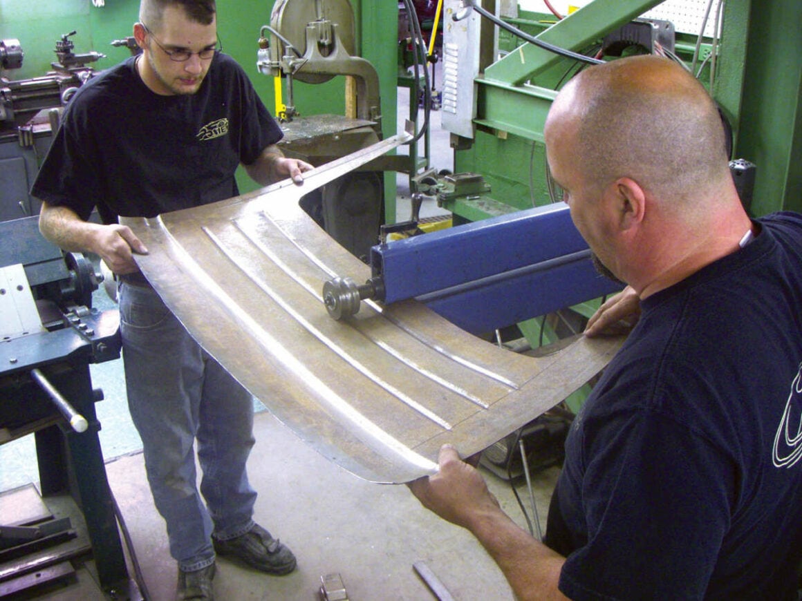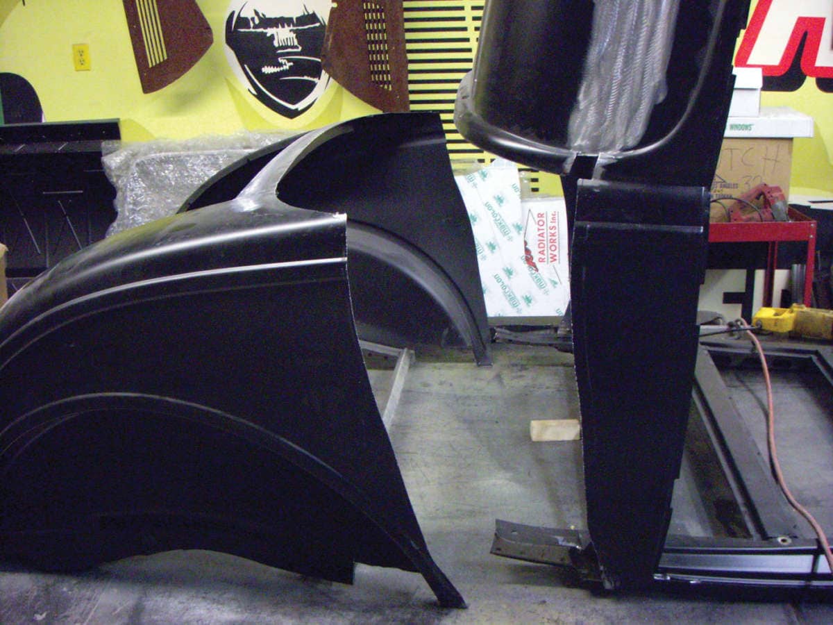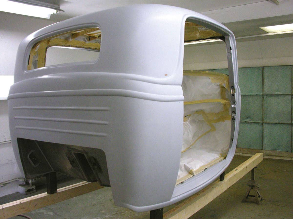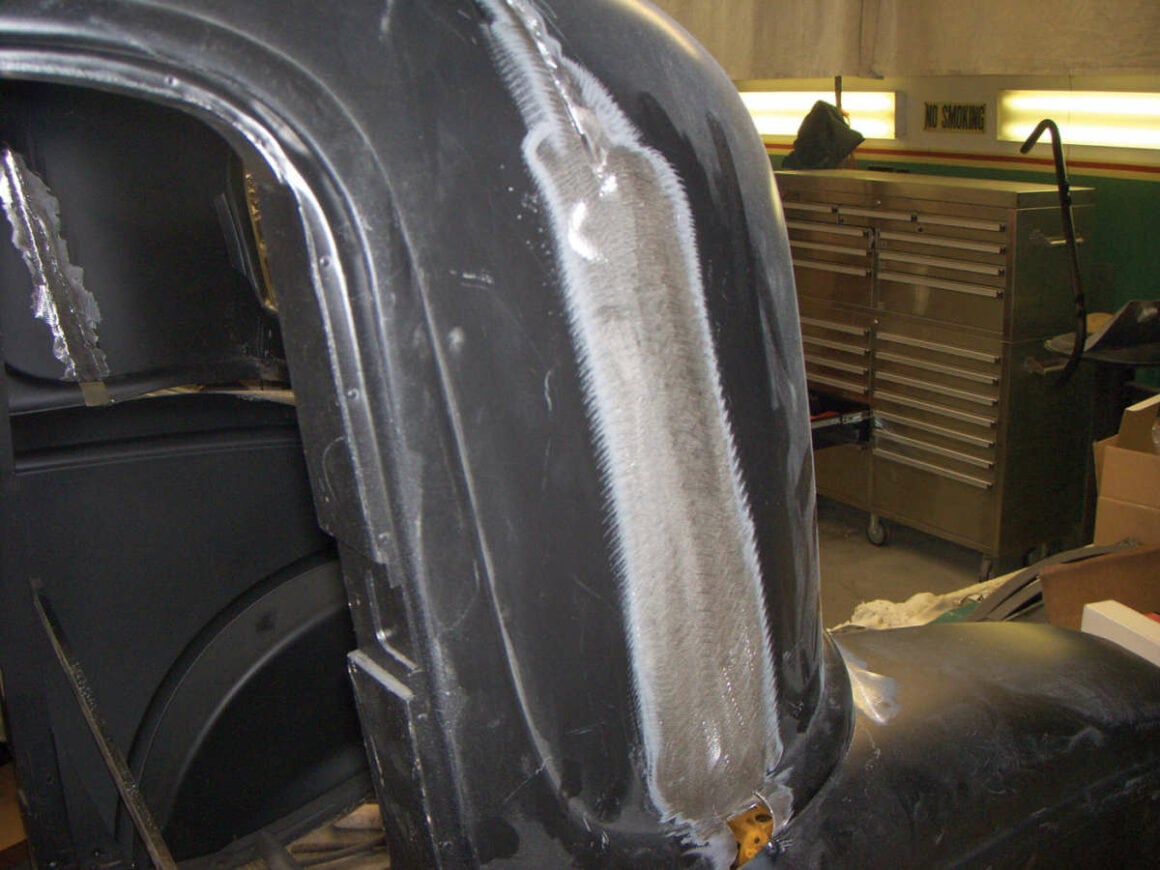 -Une fois la forme retravaillée, mes techniciens “Posies” ont ensuite placé la carrosserie sur le châssis afin que le reste des panneaux puisse être fabriqué. La cloison pare-feu a été soudée à partir de deux pièces jointes verticalement. L’arrière de la carrosserie a été incliné/cabré à l’aide d’un seul panneau, entourant l’arrière de la carrosserie qui portait le même thème que sur la cloison pare-feu. Les panneaux d’angle arrière ont été formés pour rencontrer les panneaux latéraux et arrière. La ligne de carrosserie Ford 1932 de série a été transportée à travers les panneaux d’angle à travers le panneau arrière. Le remplissage arrière inférieur, les panneaux de plancher et le tunnel de l’arbre d’entraînement ont été fabriqués et soudés à la carrosserie.