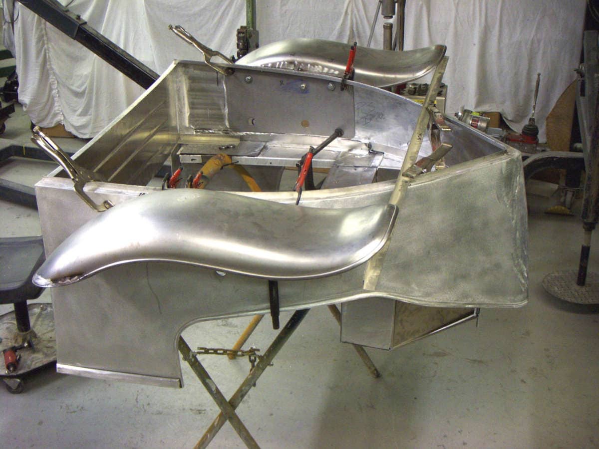 -La queue de bateau est en aluminium. Deux panneaux ont été utilisés pour fabriquer le haut du coffre tandis que plusieurs pièces ont été utilisées pour fabriquer le périmètre, roulées à la bonne forme, puis soudées ensemble. Tout l’arrière de la carrosserie a été retiré sous la lunette arrière, seule une petite partie du quart de panneau reste derrière le montant de la porte.