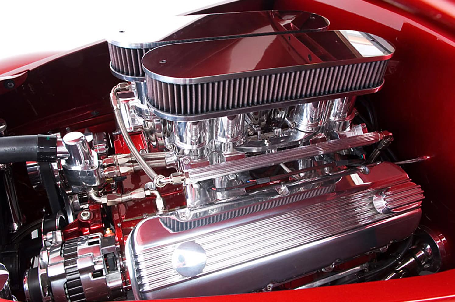 La suspension a été abaissée, les freins améliorés et un nouveau V8 modifié a été installé. Un tel projet de personnalisation destiné à créer un véhicule unique en son genre, a couté largement plus de 100.000$ pour pouvoir, sous le prétexte d’une créativité “à l’Américaine” satisfaire un égo surdimenssionné par les capacités financières très importantes… La passion pour le design automobile est un prétexte, le but est que cette “Cavallo Rossa” soit susceptible d’attirer l’attention partout où elle ira glaner des prix et coupes en fer-blanc… Je concède un coté à la fois pitoyable ET digne de moults remerciements… Pour ma part, c’est le fait de pouvoir en réaliser un des presque 5.000 articles qui constituent ce web-site…