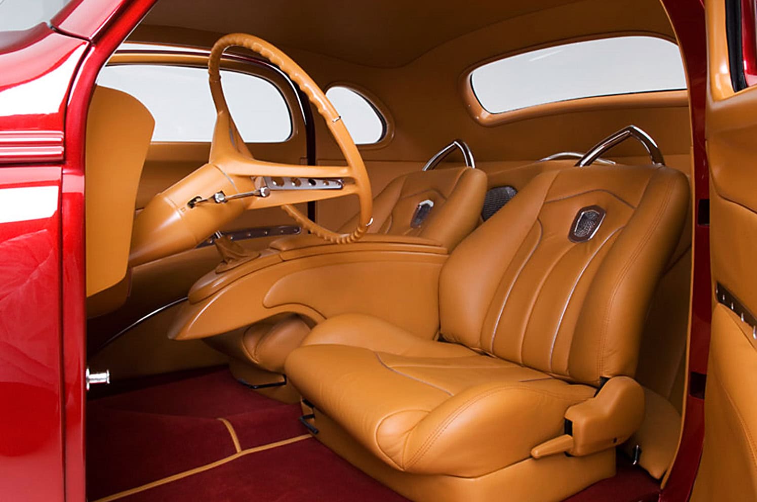La carrosserie est entièrement en acier et repose sur un châssis Art Morrison. La bête est propulsé par un V8 498ci de 425cv assisté d’une transmission automatique 700R4. Conçue et construite par Kindig-It Design (qui s’était fait remarquer avec une sorte de Super Corvette ’53), est un parangon de l’entreprise. “Cavallo Rossa” est peinte en “rouge pomme d’amour” complété par un intérieur en cuir Harvest… la bête a remporté le GM Design Award du plus beau Hot Rod GM au SEMA-Show. Regardez la vidéo présentée ci-dessous et préparez-vous à être fasciné… Voilà, j’en ai terminé… Vous pouvez enfon regarder la vidéo qui ne raconte strictement rien de ce que je vous ai publié…
