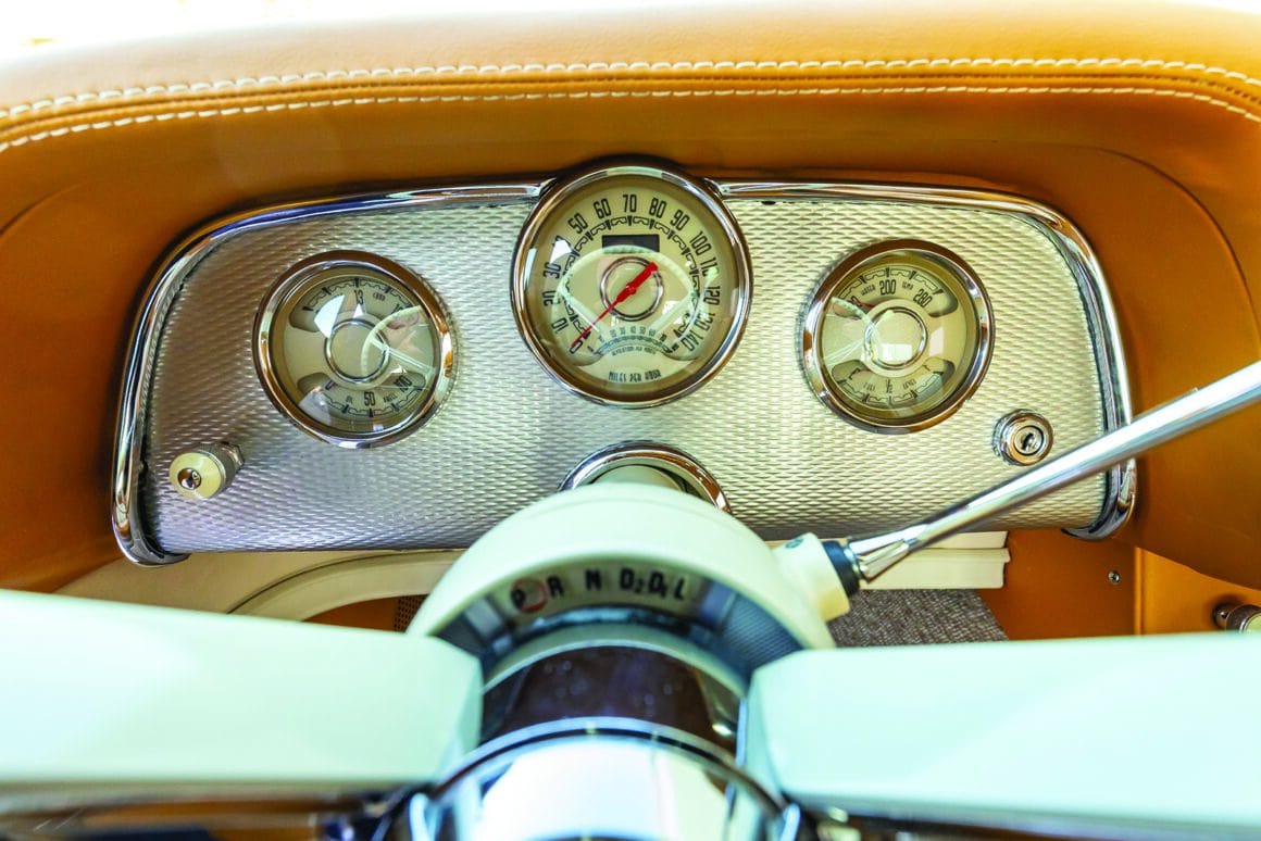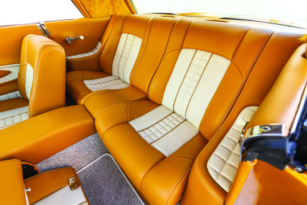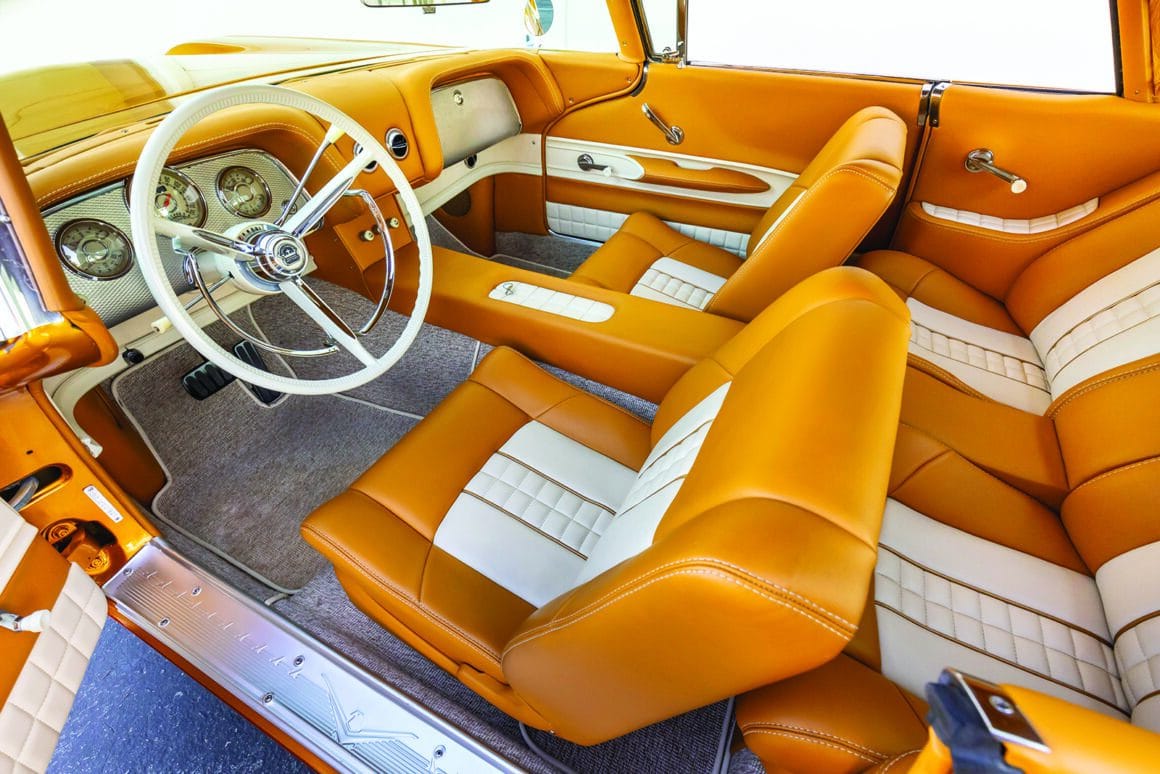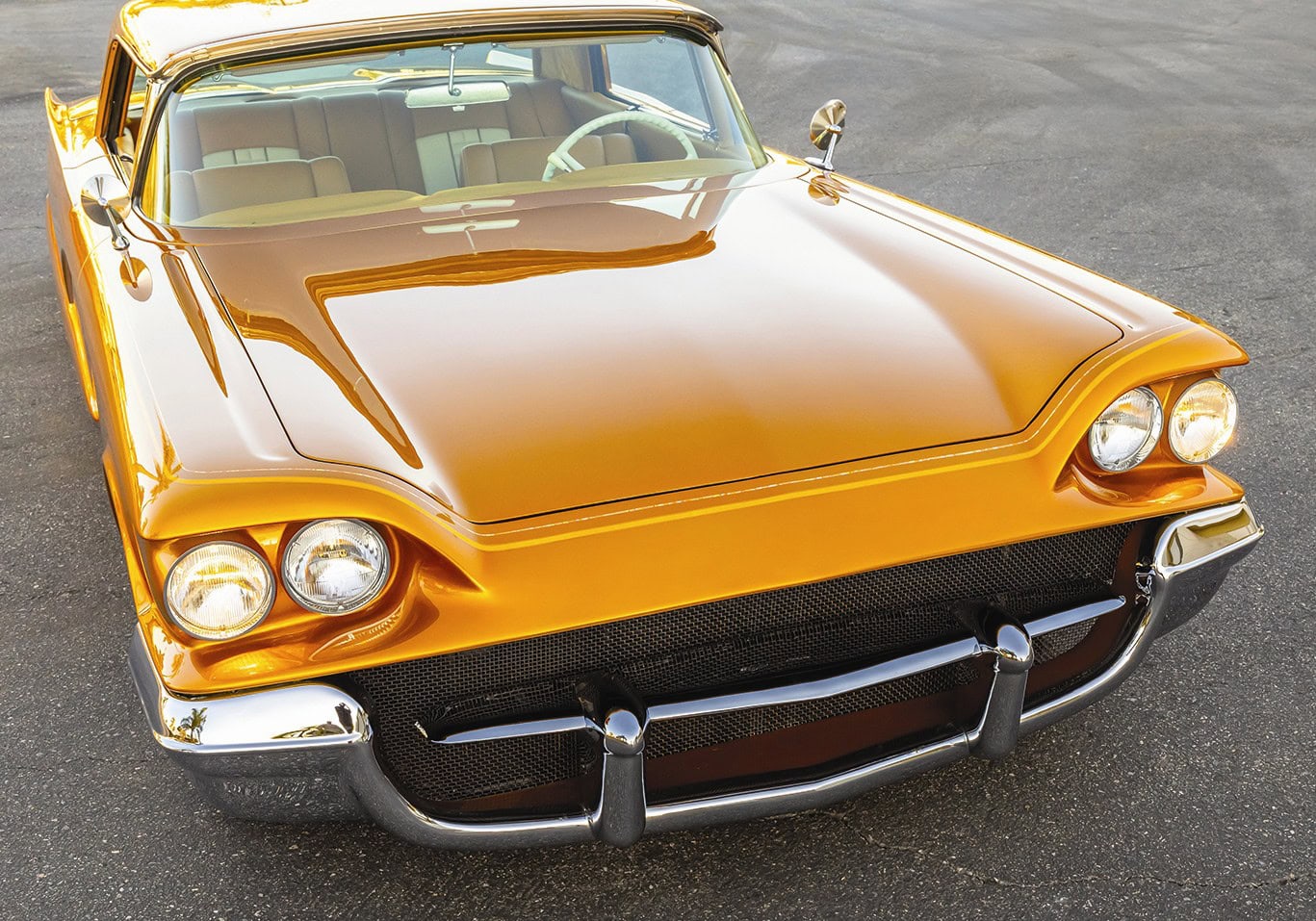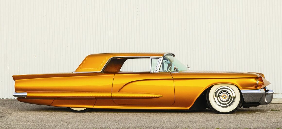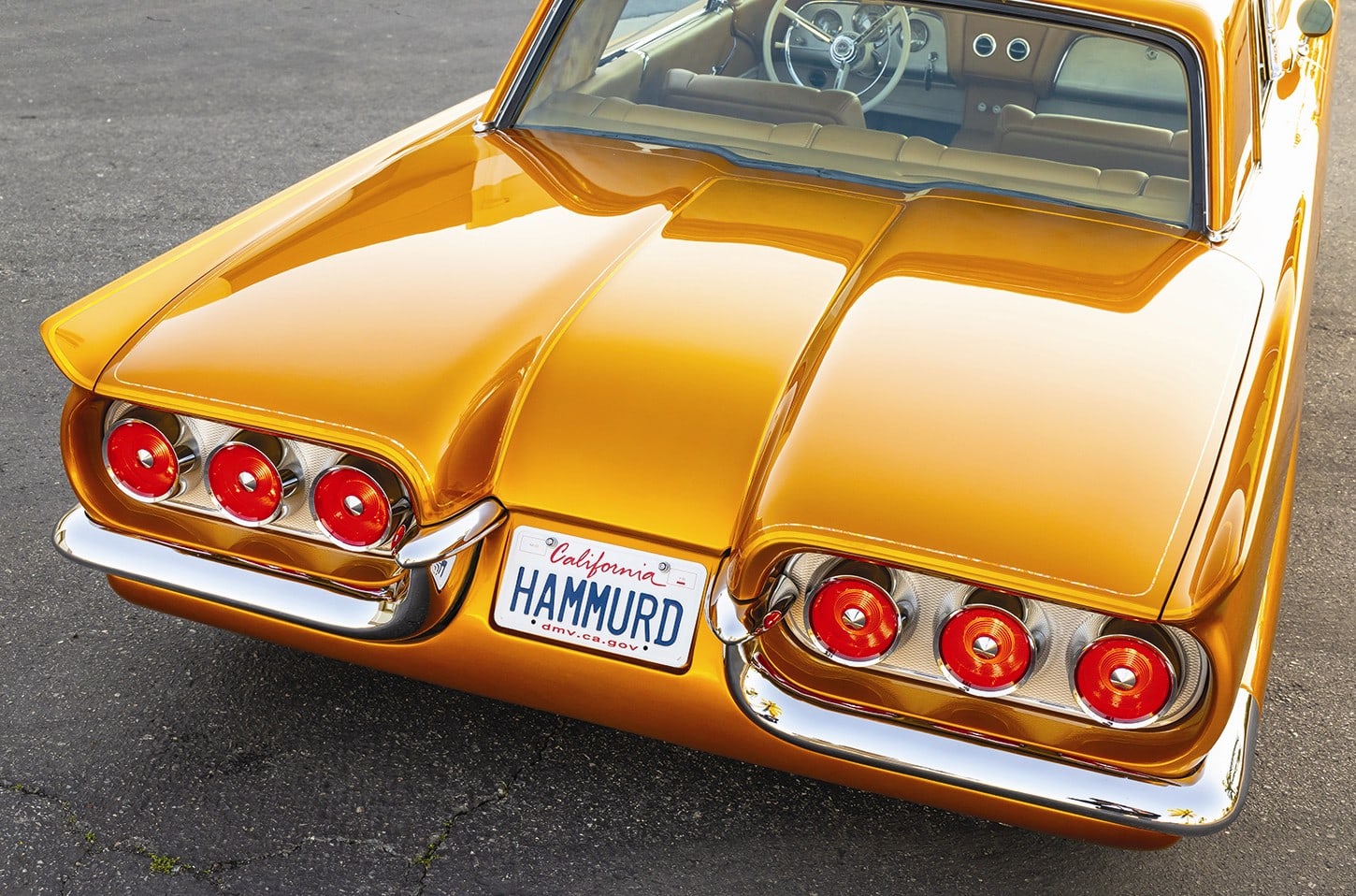 Cette T-bird de 60 penche très certainement vers l’extrémité personnalisée sauvage du spectre car elle a des modifications de bon goût importantes de la tôle d’usine. Ces modifications et la carrosserie ultérieure proviennent de HHR, tandis que le mélange de couleurs personnalisé PPG a été réalisé par Albert De Alba de De Alba Autoworks (bien connu pour ses peintures complexes) et Paul Stoll (peintre et hot rodder de longue date de PPG). L’expérience m’a montré que les travaux intérieurs importants suivent les travaux de tôlerie approfondis. La ‘Bird personnalisée ’60 de Peter n’est pas différente. Elle présente de nombreuses touches personnalisées bien pensées à travers les coutures d’Ultimate Auto Interiors en or et cuir crème.