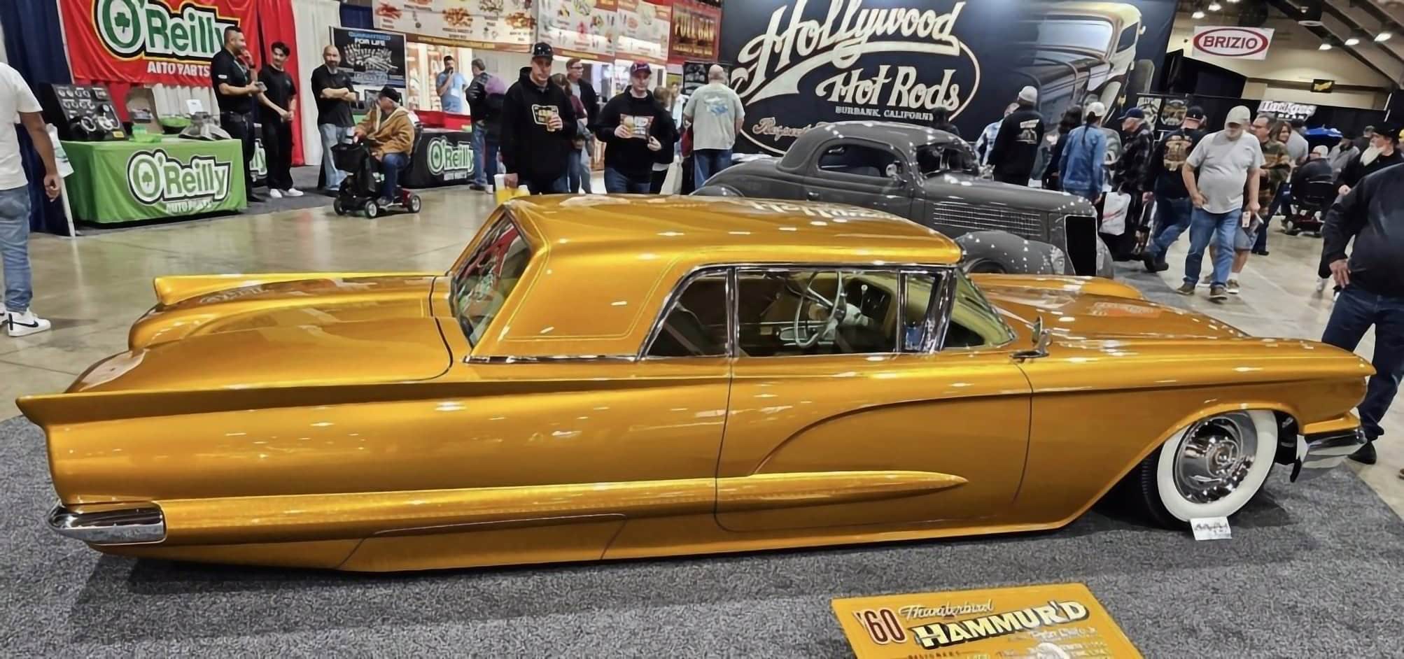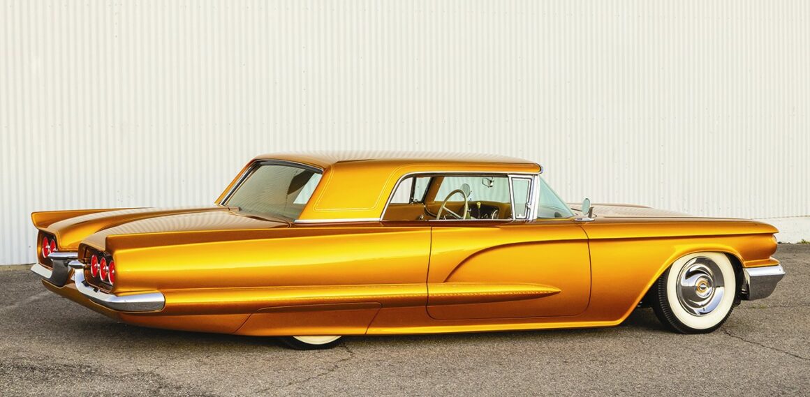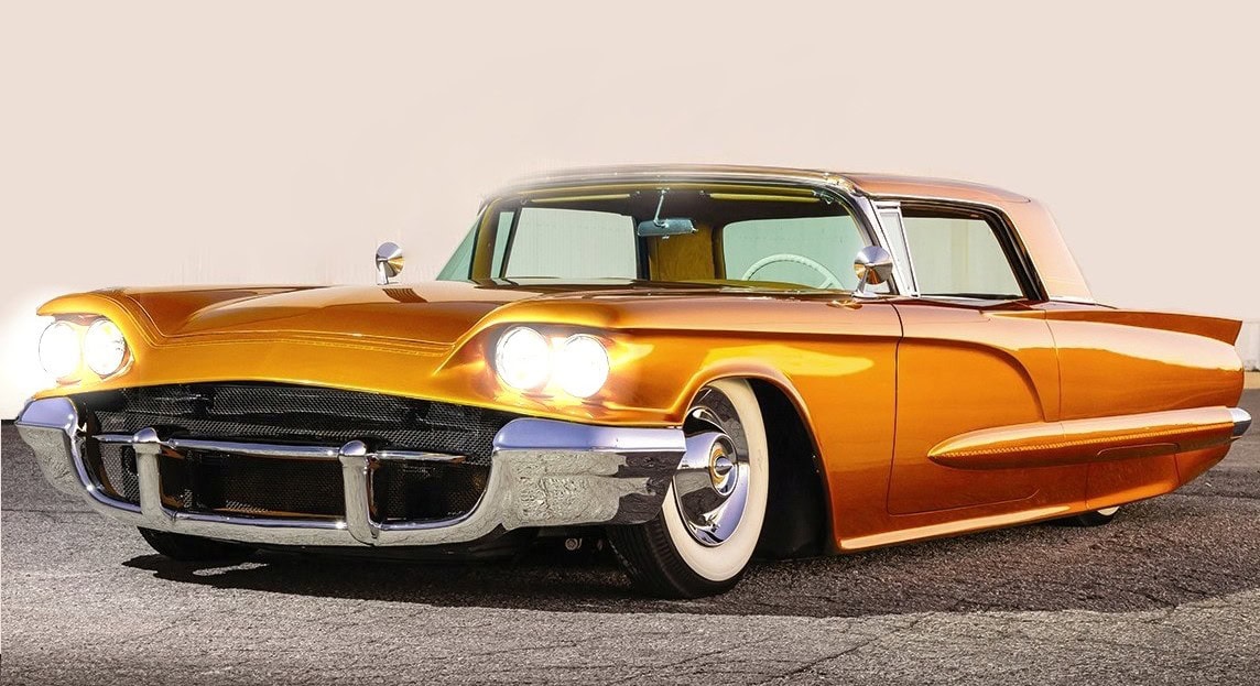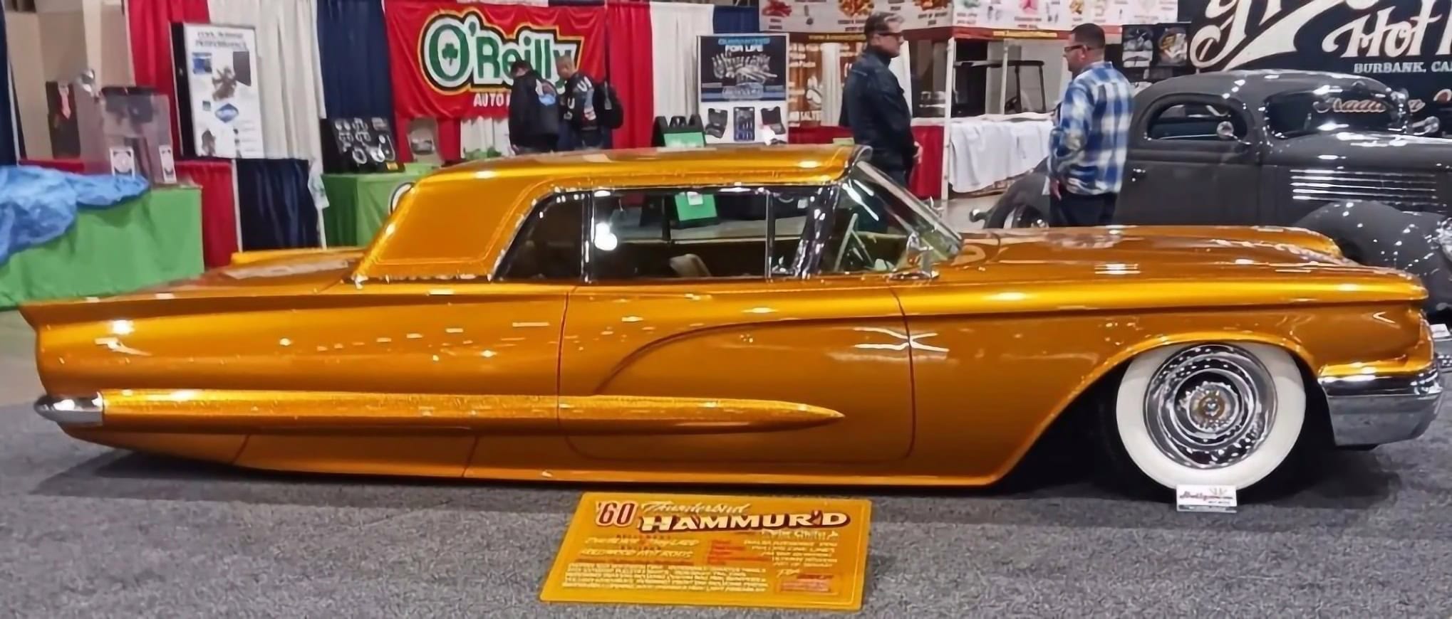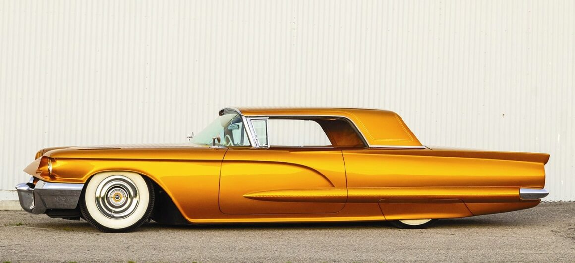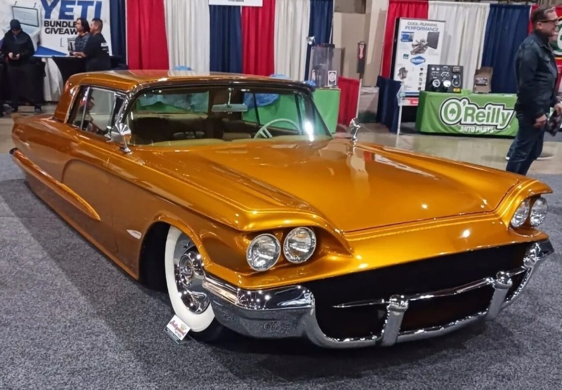 L’œuvre comprend une paire de baquets avant Ford d’origine, la garniture de toit est teinte en cuir de vachette doré pour correspondre aux sièges. La T-bird personnalisée a fait sa première sortie au Grand National Roadster Show 2024 où elle a remporté plusieurs prix haut de gamme, en premier dans la classe Radical Hardtop/Sedan et le “George Barris Memorial Kustom D’Elegance”. Voilà, c’est terminé… On… En fait “moi” pour vous en avons “fait le tour” en photos. Je suis le premier à déplorer un manque d’unicité créant une impossibilité de réaliser une mise en page “clean”, “soft”, “pro”, plus léchée et attrayante, quoi que, vous conviendrez que tout n’est qu’illusion, preuve en est par les photos du Sema show qui n’a manifestement pas le standing imaginé… Illusions…