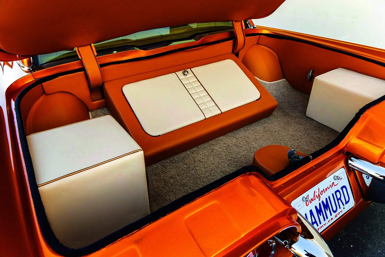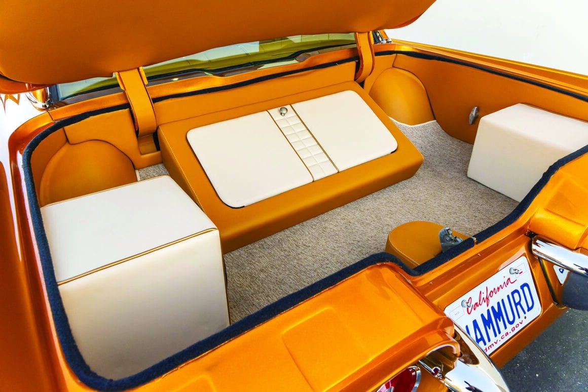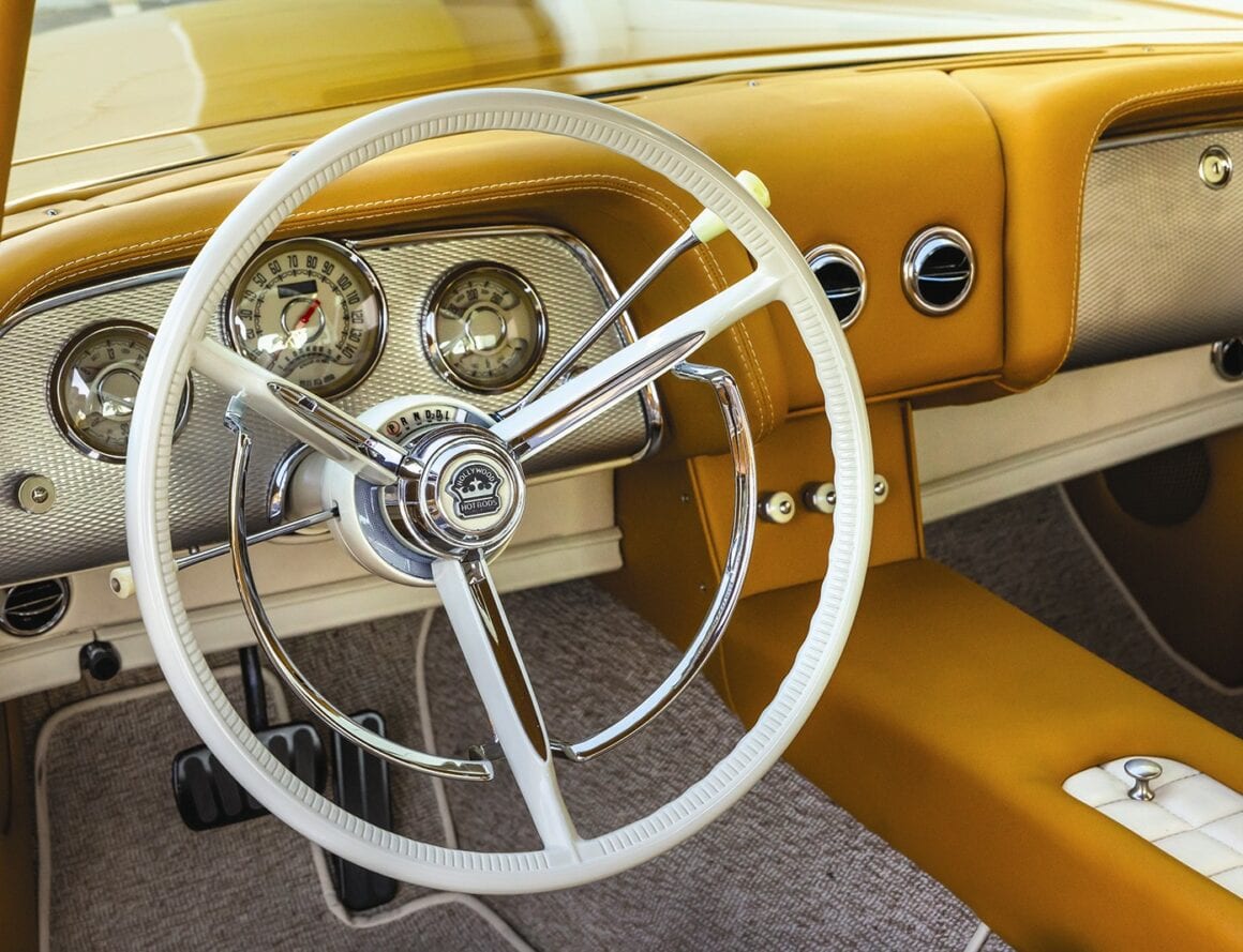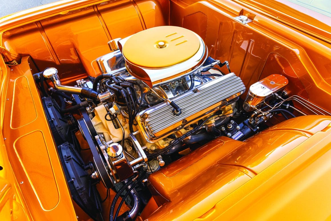 La combinaison de roues et de pneus – oh si importante pour qu’une custom ait le « bon » look – est composée de jantes Ford de 15 pouces avec des anneaux de garniture uniquement à l’arrière et des jantes modifiées à l’avant pour accepter les enjoliveurs Cadillac Sombrero (fabriqués de 1948 à 1952, qui étaient pour les roues de 15 pouces). Tout cela est enveloppé de caoutchouc Coker à flancs blancs larges. Le moteur de cette ‘Bird’ personnalisée est un Ford FE de 65, de 390ci, que Jim Van Gordon a reconstruite, le V-8 est surmonté d’une admission Edelbrock en aluminium poli et d’un simple quatre corps Edelbrock et recouvert d’un filtre à air très détaillé. L’allumage est électronique. Les mods de tôle sont la pierre angulaire de toute coutume, du doux au sauvage.