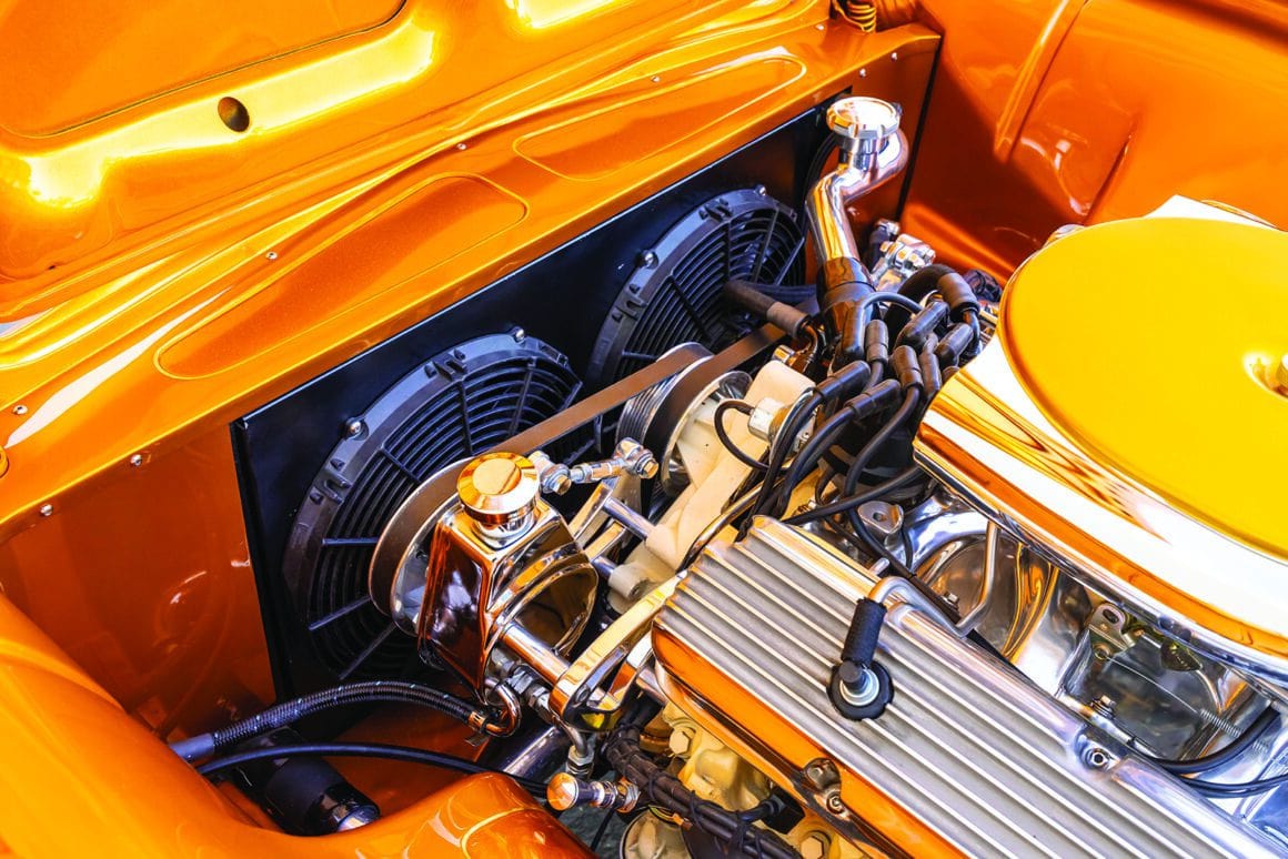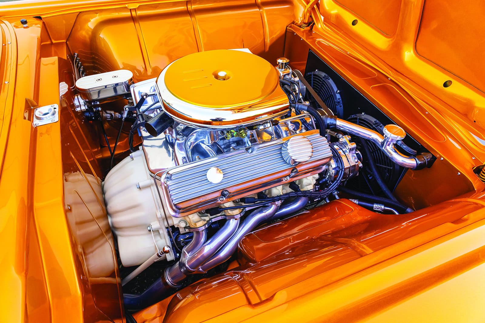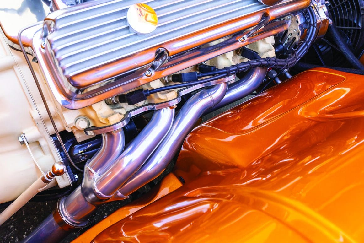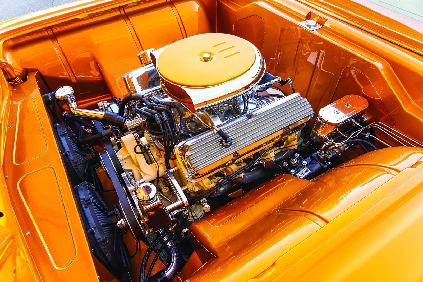 La combinaison de roues et de pneus – oh si importante pour qu’une custom ait le « bon » look – est composée de jantes Ford de 15 pouces avec des anneaux de garniture uniquement à l’arrière et des jantes modifiées à l’avant pour accepter les enjoliveurs Cadillac Sombrero (fabriqués de 1948 à 1952, qui étaient pour les roues de 15 pouces). Tout cela est enveloppé de caoutchouc Coker à flancs blancs larges. Le moteur de cette ‘Bird’ personnalisée est un Ford FE de 65, de 390ci, que Jim Van Gordon a reconstruite, le V-8 est surmonté d’une admission Edelbrock en aluminium poli et d’un simple quatre corps Edelbrock et recouvert d’un filtre à air très détaillé. L’allumage est électronique. Les mods de tôle sont la pierre angulaire de toute coutume, du doux au sauvage.