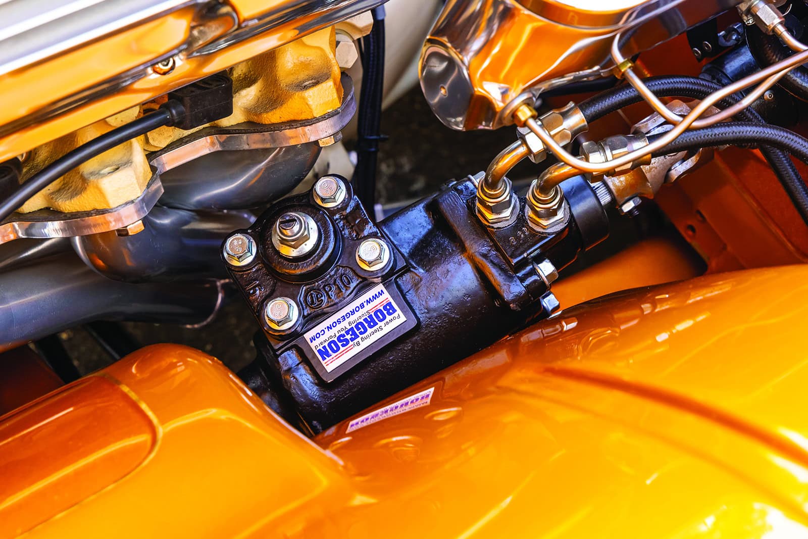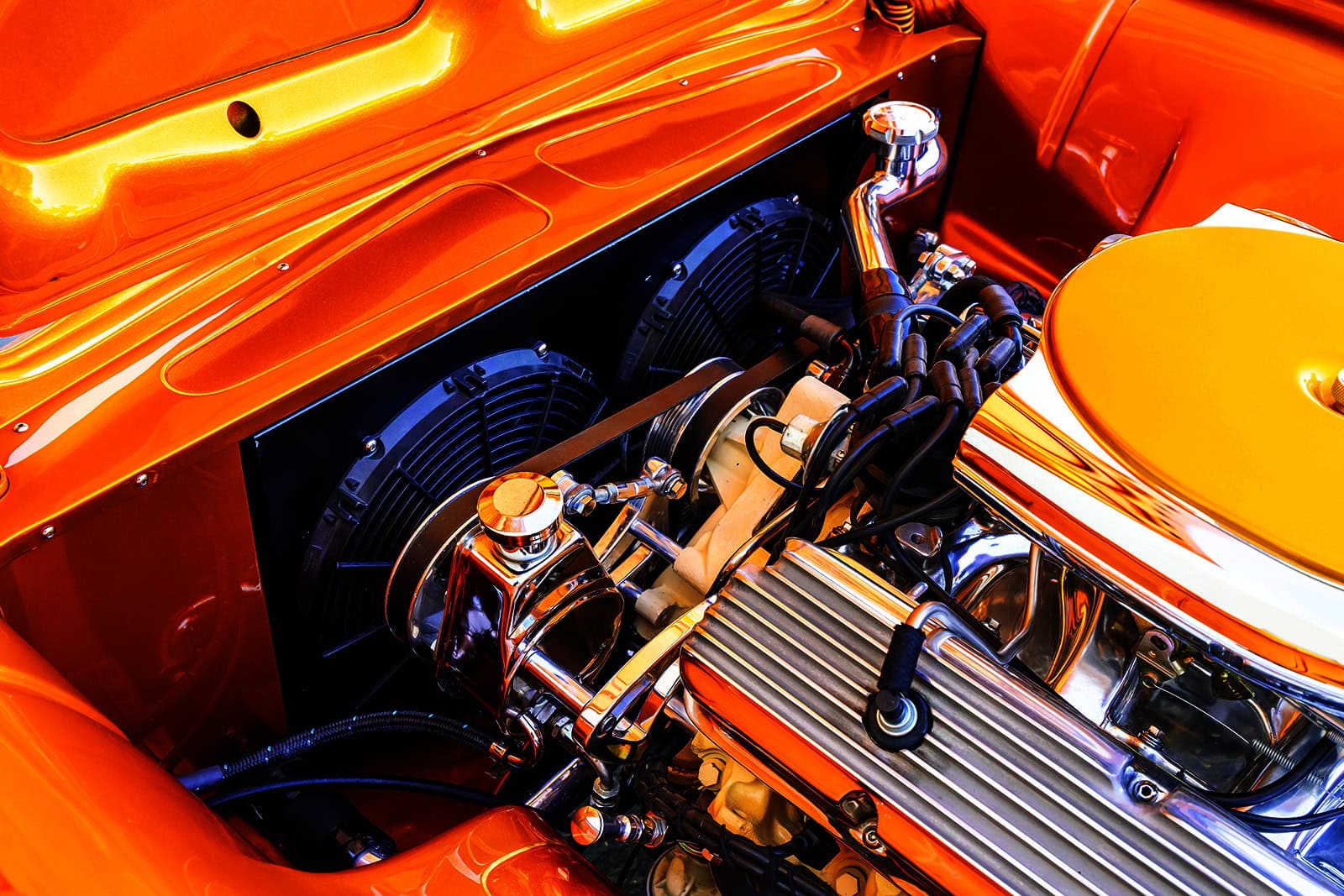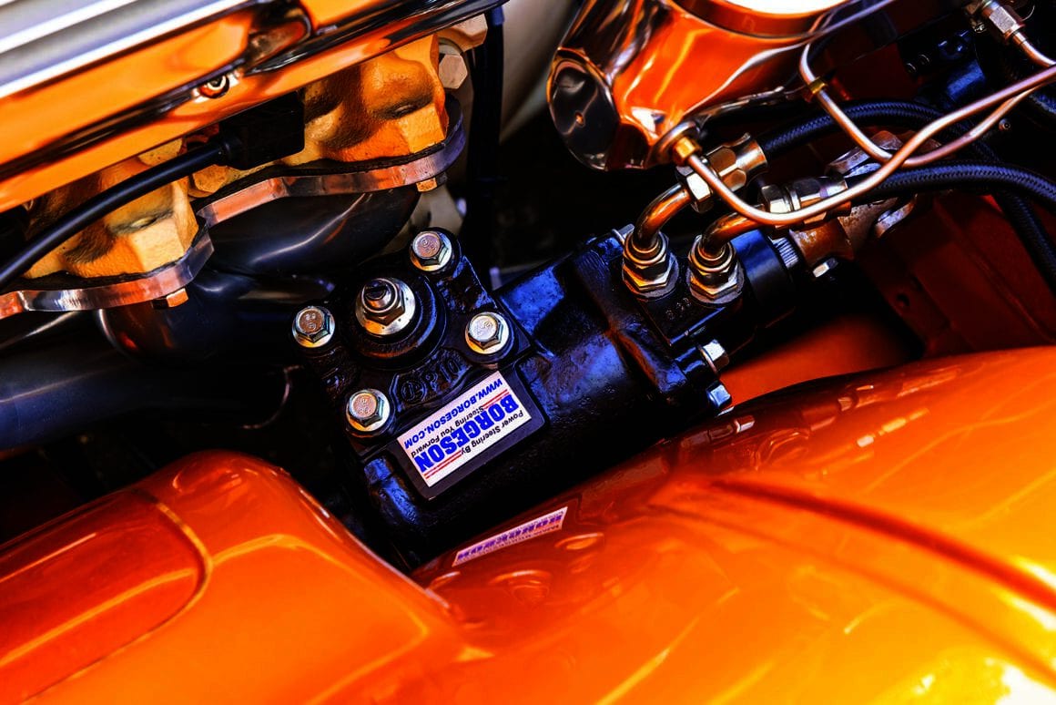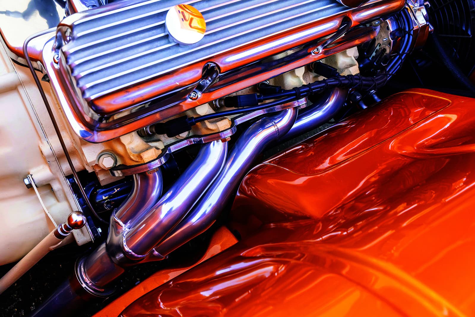 La combinaison de roues et de pneus – oh si importante pour qu’une custom ait le « bon » look – est composée de jantes Ford de 15 pouces avec des anneaux de garniture uniquement à l’arrière et des jantes modifiées à l’avant pour accepter les enjoliveurs Cadillac Sombrero (fabriqués de 1948 à 1952, qui étaient pour les roues de 15 pouces). Tout cela est enveloppé de caoutchouc Coker à flancs blancs larges. Le moteur de cette ‘Bird’ personnalisée est un Ford FE de 65, de 390ci, que Jim Van Gordon a reconstruite, le V-8 est surmonté d’une admission Edelbrock en aluminium poli et d’un simple quatre corps Edelbrock et recouvert d’un filtre à air très détaillé. L’allumage est électronique. Les mods de tôle sont la pierre angulaire de toute coutume, du doux au sauvage.