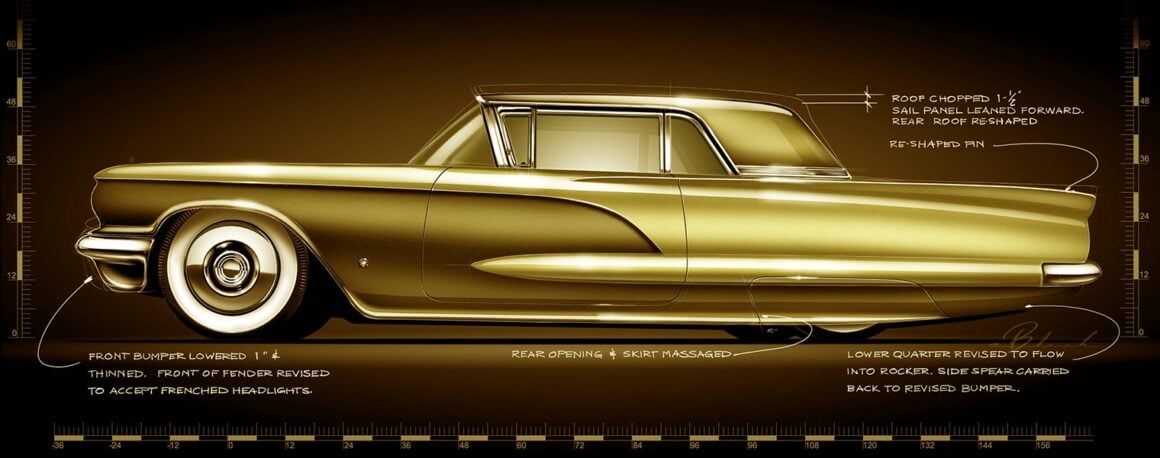 Peter a pensé à restaurer une Ford Thunderbird 60 pour sa mère malade, car c’était la première voiture dont il se souvenait que son père lui avait donnée. Il a atteint son objectif et a offert à SA maman la Thunderbird restaurée, mais après sa mort, il l’a stockée dans un garage, et elle est restée immobile. Au milieu des années 2000, il a vu une œuvre d’art d’Eric Black qui représentait un oiseau construit avec la même influence que la Hirohata ’51. Soudain, le désir était là d’en faire plus avec la T-bird de 60. Nous sommes maintenant en 2013, en quelques semaines, le désir a battu son plein, la Thunderbird restaurée de 60 étant maintenant démontée avec l’intention d’avoir une Square Bird entièrement personnalisée. Comme pour tant de projets, il y a eu un ou deux accrocs…