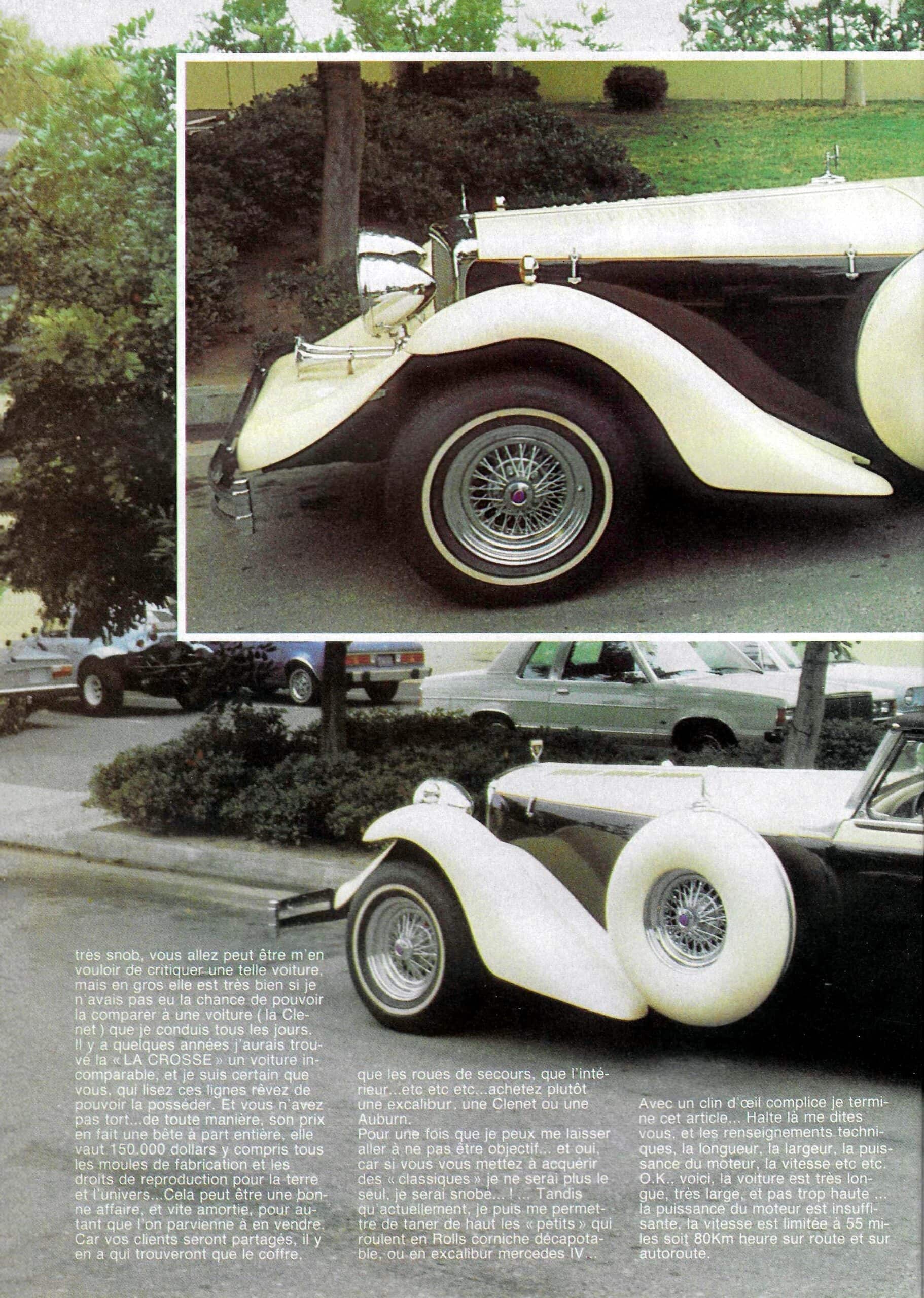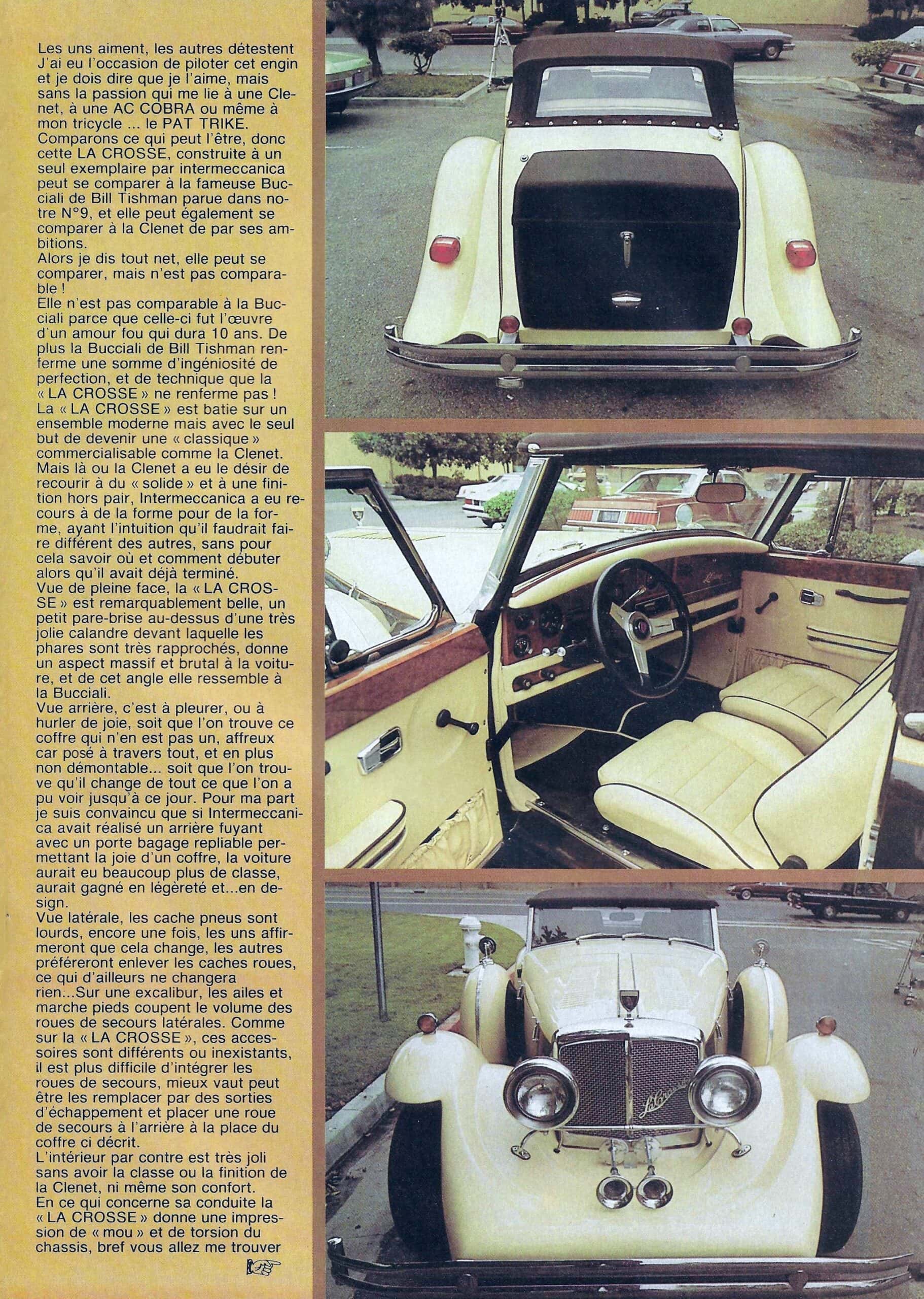 Au cas fort improbable que l’histoire de l’Intermeccanica LaCrosse vous passionnerait, j’ai re-publié l’article que j’avais soigneusement écrit “au Bic” dans le Boeing de retour de Californie via New-York puis Paris, en février’83, pour mon magazine Calandres daté comme un gag du 1er avril 1983, soit 40 ans d’ici. Le problème d’en écrire, malgré une balade d’une journée, c’est qu’il n’y avait pas grand chose à raconter et c’est pire 40 ans plus tard, il n’y en a eu qu’une…