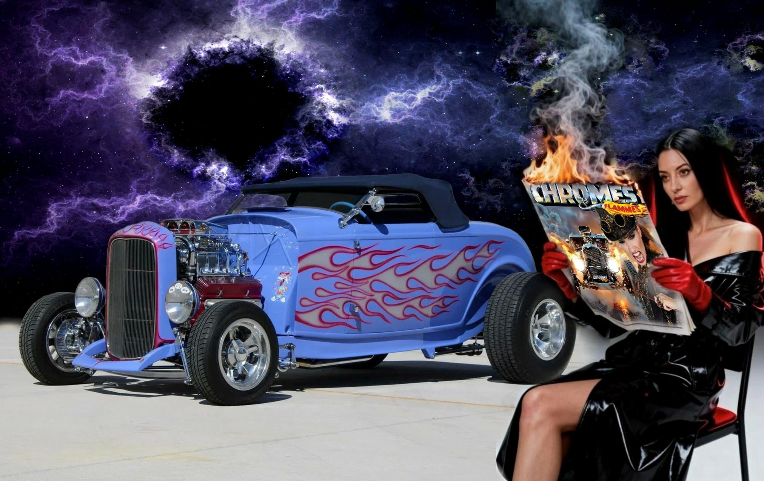 Nous avons fait plusieurs fois le tour de cette discussion sans parvenir à trouver la bonne sortie. Nous devions rencontrer quelques personnages éminents, des figures emblématiques du Hot Rodding dont un des descendants d’Hota Roda, s’est avéré être une source évaporescente amenant à la rédaction d’articles lumineusement éclairant sur l’avenir du Hot Rodding dans le cadre de la recherche spatiale intemporelle. Directeur du musée Hota Roda et, à ses heures perdues, professeur en création d’histoires absurdes, il m’attendait déjà depuis un temps immémorial, tandis que la voix que j’avais en tête poursuivait son exposé sur la philosophie du Hot Rodding… “Quiconque réduit un Hot Rod à ses seules performances”, m’a-t-on appris ainsi, “passe complètement à côté de l’essentiel. La plupart des automobiles sur cette planète sont conçues depuis Platon selon des critères rationnels : vitesse, confort, sécurité, durabilité, design. Il existe des moyens et des méthodes pour atteindre ces objectifs que je vais vous offrir pour que vous en informiez les internautes qui lisent ChromesFlammes”.…