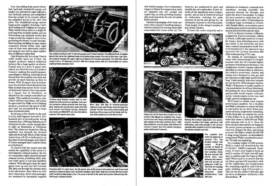 Avec une traction adéquate, la Wigmaster de Wally est facilement capable d’une accélération de 1,5 g (dans les quatre directions), mais faire en sorte que la voiture s’accroche fort dans le quart de mile nécessiterait une transformation géométrique complète à l’arrière, et bouleverserait totalement son utilisation polyvalente. J’espérais obtenir des chiffres de performance concis, mais une date limite et la réticence de Wally Larson à exposer son bébé à des risques avant ses débuts au salon de l’automobile ont retardé toute forme de vulcanisation de la chaussée. Sur le plan fiscal, chez GatsbyOnline/ChromesFlammes, nous estimons la valeur de ce monstre à 200.000 $. Cela se rapprocherait de 500.000 $ si Wally avait payé quelqu’un d’autre pour le fabriquer. Avides de données et ayant accès au logiciel fiable de course de dragsters “QUARTER” de Pat Hale, nous avons immédiatement extrapolé le potentiel d’accélération de Wally. Le décompte était stupéfiant. Avec un poids courant de 2.950 livres, la fusée de Wally fait frire les Goodyear 27,5 x 15 x 17 D4903..; et ne commence même pas à s’accrocher à 200mph ! Les freins Brembo de treize pouces sont boulonnés aux axes en aluminium de Corvette. Les étriers en aluminium à quatre pistons assurent un arrêt sans faiblissement. Les bras de suspension fabriqués fonctionnent avec des amortisseurs de course AVO et des ressorts Eibach. Le soulèvement de l’aileron arrière réglable dans l’habitacle révèle des réservoirs de carburant en acier inoxydable et un système hydraulique à l’arrière, ce qui ajoute beaucoup à l’appui aérodynamique déjà considérable de la conception de la carrosserie.