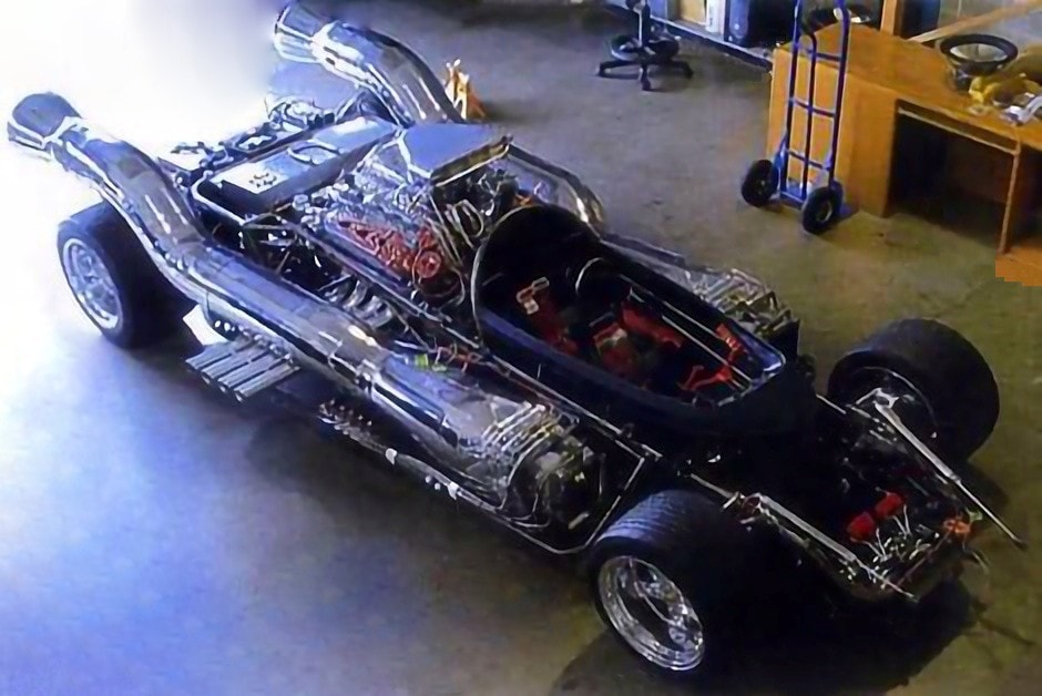 Du câblage de qualité aéronautique alimente quatre batteries de 1.000 ampères sur 34 circuits électriques, presque assez “de jus” pour éclairer Manhattan au moment de Noël… Les relais sont situés dans une boîte à sandwich (sic !) rabattable. Une grande partie de ce câblage (dont certains proviennent d’un bombardier B-52) est dédiée à pas moins de 15 compteurs d’avion et (aïe !) 47 commandes manuelles gérées par le conducteur (quoi, pas de téléphone portable ?). Les relais des 34 circuits électriques contenus dans la boîte à sandwich relevée, révèlent les quatre pompes hydrauliques à deux étages qui donnent du mouvement aux sections de la carrosserie. Pour contrôler à la fois le son (et ultimement la capacité) des collecteurs d’échappement, le conducteur manipule huit découpes d’échappement actionnées par solénoïdes, permettant l’évent latéral (grand ouvert) ou l’évent arrière (étouffé). Lorsque les tuyaux latéraux sont fermés, les gaz usés remontent et traversent l’IRS, puis s’échappent à travers les embouts chromés de la section arrière. Comme il ne s’agit pas d’une concoction ordinaire, le conducteur (et la passagère) sont soutenus par des masques faciaux fournis avec de l’oxygène en bouteille. Quatre unités d’extinction d’incendie au halon déclenchées par la température sont également raccordées dans le cockpit et le compartiment moteur, offrant une protection mesurable contre le mélange de fluides volatils à bord.