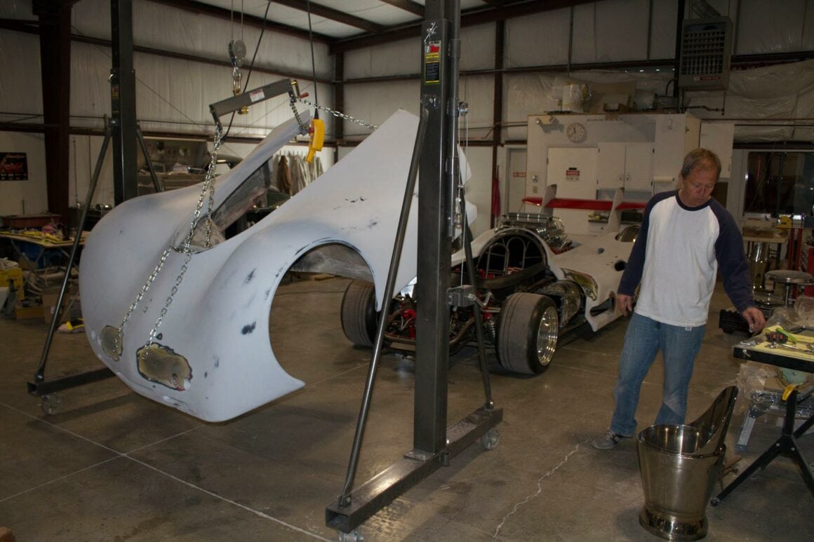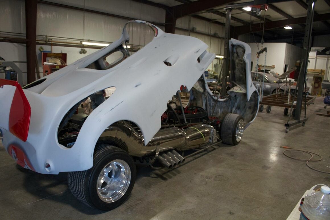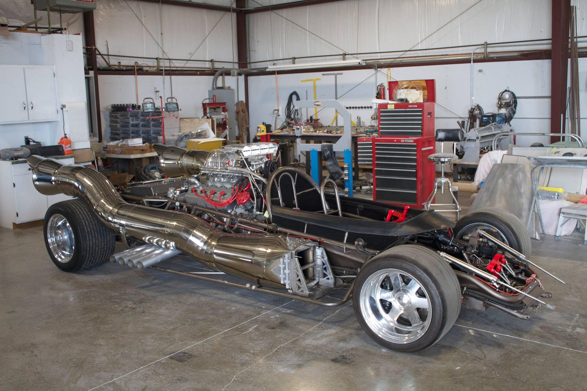 Avec une paire d’arbres à cames en tête par rangée de cylindres et un vilebrequin en acier forgé blotti dans un bloc à six boulons à goujons, cette “scie circulaire” semblait avoir l’Indy 500 tatoué partout. À cet assemblage impressionnant, Willy Larson avait ajouté des tiges d’acier en billette Cunningham, des pièces forgées Venolia et passé de nombreuses heures pour préparer les 32 orifices d’admission. Imperturbable face à la minuscule cylindrée de 241 ci du moteur, Wally Larson savait qu’il pouvait pomper 10cv par-ci et par-la au départ de ce bloc robuste en y injectant un mélange de nitroglycérine et de méthanol à travers un compresseur de suralimentation la plus efficace de la planète : “Le compresseur à vis Lysholm”. Bannis de la “NHRA Top Fuel” au cours des six années précédentes, les compresseurs de P.S.I. Corporation maintenaient constamment 2.800cv à partir de moteurs “Top Alcohol” de 500ci. En faisant fonctionner la même combinaison de moteurs avec un mélange de nitro et de méthanol à 10 pour 1, la puissance doublait. Willy Larson a donc créé/inventé des matériaux composites formant la carrosserie composés de 12 couches synthétiques collées (fibre de carbone, duraglass, fibre de verre, etc.) qui prenaient en sandwich les deux côtés d’un tube en chrome-molybdène et d’une superstructure en aluminium. Cette construction créait une plate-forme (châssis) extrêmement rigide (torsion et flexion), mais l’ensemble ne pesait que 450 livres.