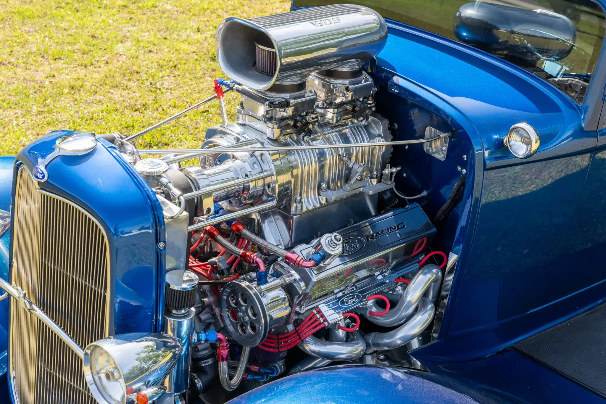 Même après l’avoir conduit, ce Hot Rod est encore un peu au-delà de l’entendement dans ma tête. Il s’agit d’un V8 avec un tiers de puissance de plus que la norme. Lorsque le projet a démarré, l’ajout d’un Blower faisait partie des calculs. Cela signifie que le châssis a été sur-construit. Ce qui ne veut pas dire qu’il n’y a pas eu de surprises en cours de route. Les premières rumeurs indiquaient que la puissance était d’environ 800cv, alors qu’en fait, l’équipe moteur a surpassé les attentes et l’a poussé bien au-delà. Tout ce qui bénéficie d’être différent est différent… Il y a donc une pompe de récupération supplémentaire avec des pistons et bielles en adéquation et bien plus encore. Un radiateur et un intercooler ont été ajoutés comme une solution inspirée de la course. l