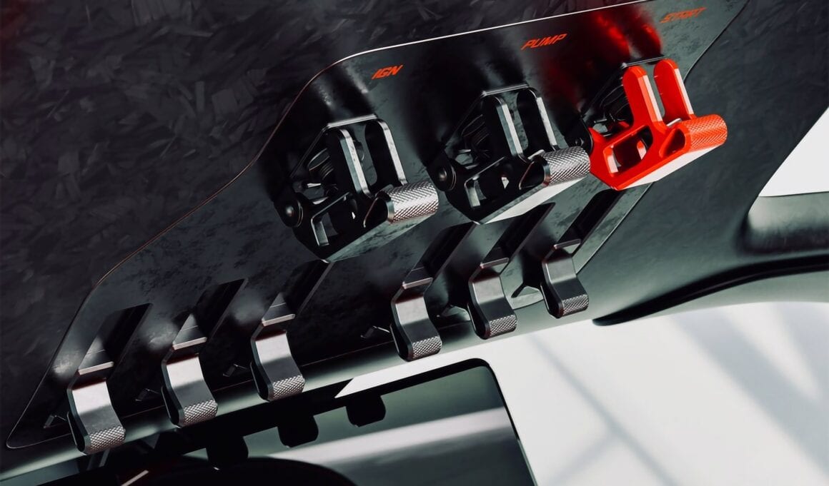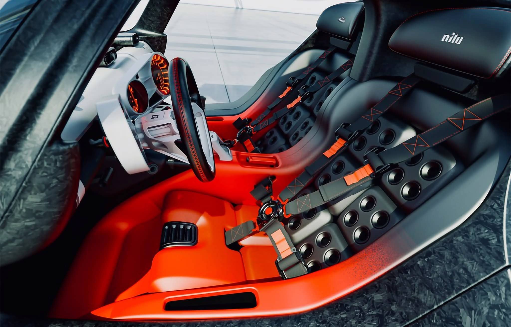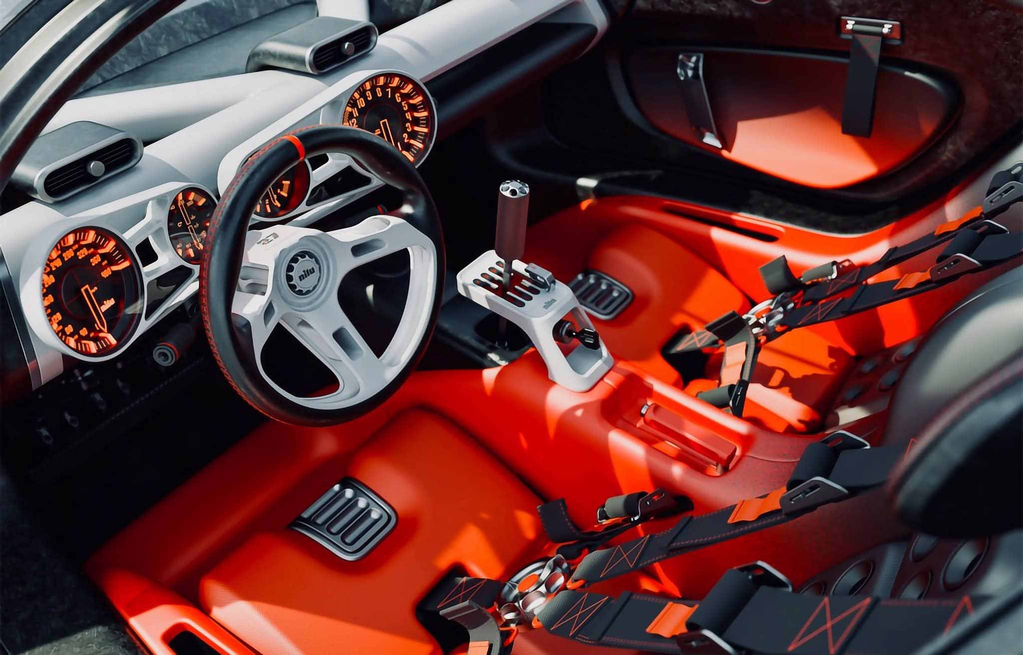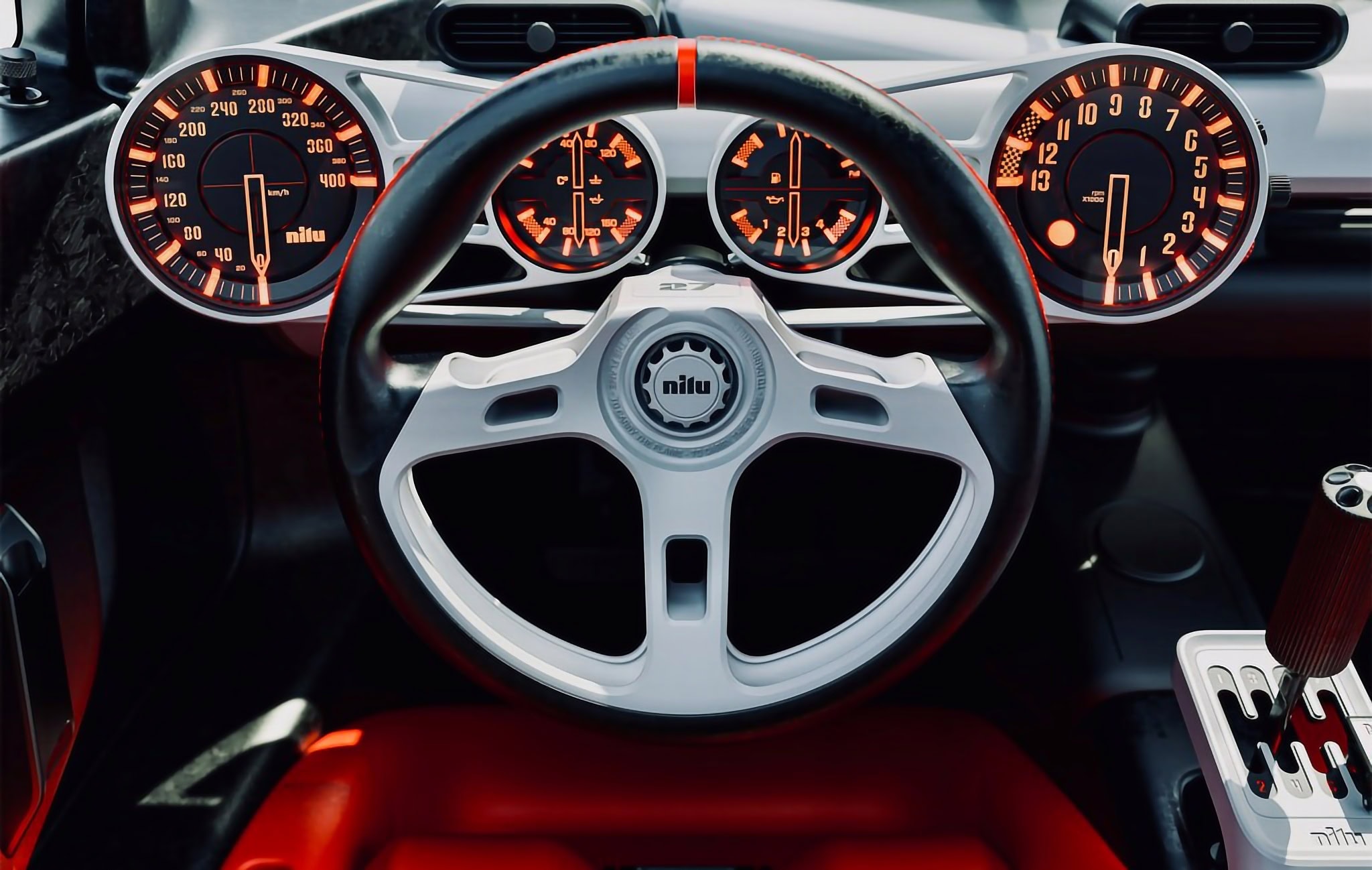 Waouwwww ! Elles sont de faibles hauteurs de seuil et les sièges fixes et encastrés n’obstruent pas les ouvertures des portes avec leurs renforts latéraux. Mais comment la machine s’adapte-t-elle aux grands et aux petits puisque ni le volant ni les pédales ne peuvent être réglées ? L’interface homme/machine NILU27 est donc magique quoiqu’entièrement composé de commandes manuelles, analogiques, d’entrées et de rétroaction qui ne fonctionnent pas… J’ai tout tenté… Rien… Le seul écran est la caméra de recul/rétroviseur, qui s’adresse à la faiblesse traditionnelle des voitures de sport à moteur central : le manque de visibilité vers l’arrière. Mais ça n’est pas encore branché… Décidément, je déchante me demandant si en finale de mes ressentis on ne va pas me faire chanter l’air des bijoux de famille coupés en rondelles… Vite, je dois trouver un point positif… La taille compacte et la forme parfaitement ronde du volant qui spermettent des sensations de direction détaillées et la précision ultime de saisie. Voilà… C’est tout bon, ça, le volant rond… Le volant revient aux sources, il est dépourvu d’interrupteurs, de boutons et autres gadgets. Rien n’allume ni éteint quoique ce soit, c’est magique… C’est le témoignage de la conviction que la conduite de performance nécessite une concentration totale sans aucune distraction. Fini les modes de conduite, les paramètres et les options : les commandes de la NILU27 sont à la fois primaires et intuitives. Il suffit d’imaginer que ça fonctionne…