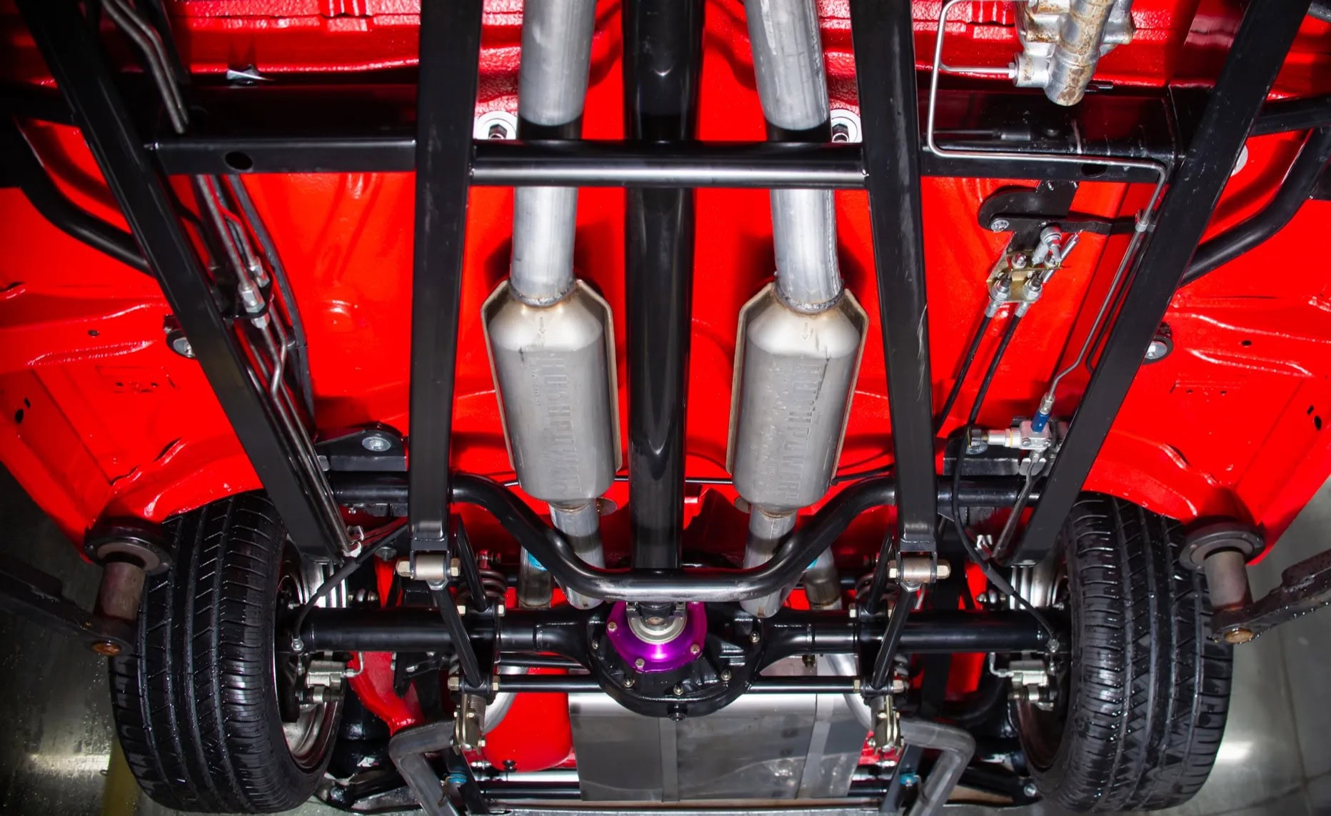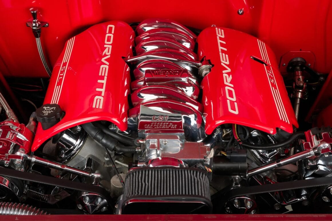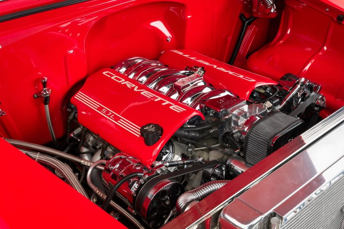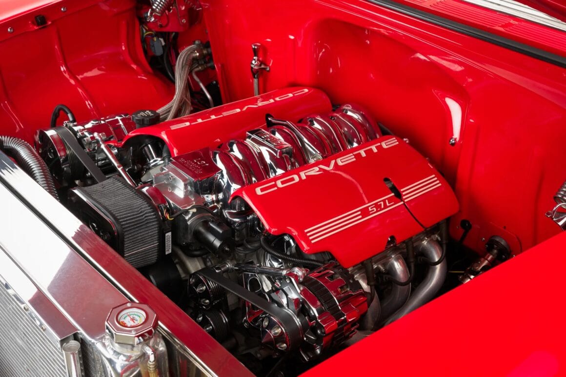 Les modifications supplémentaires comprennent des roues Cragar de 17 pouces, des freins à disque aux quatre roues de la Corvette C5, un différentiel arrière Ford de 9 pouces et une suspension QA1 avec direction à crémaillère en plus d’un collecteur d’admission Weiand, d’un système d’échappement double, d’un système de climatisation VintageAir, de jauges AutoMeter et d’une chaîne stéréo Custom Autosound.