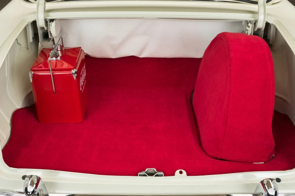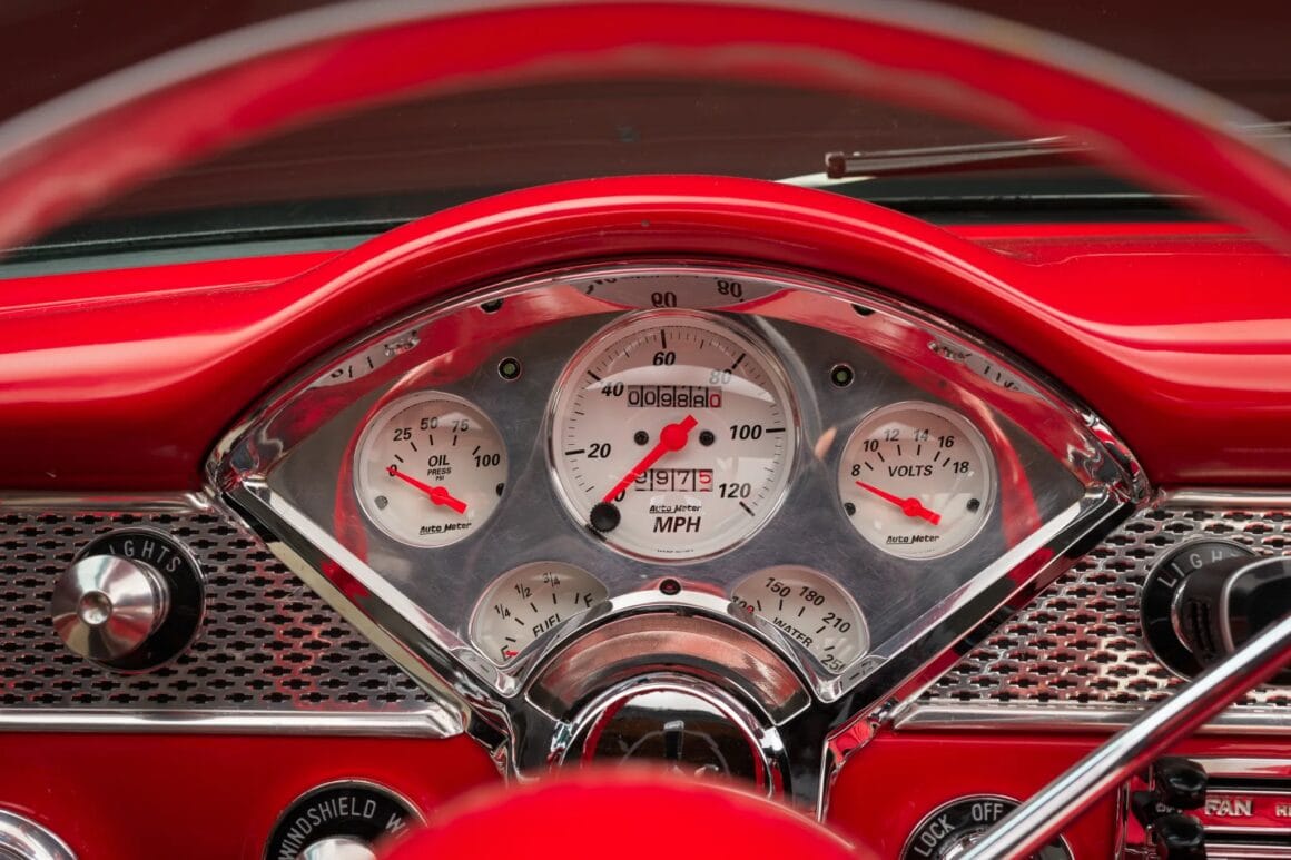 L’intérieur a été rafraîchi dans le cadre de la rénovation et les banquettes avant et arrière sont garnies de rouge avec des accents blancs et complétées par des tapis rouges. Le tableau de bord en acier peint est doté d’un insert en aluminium incorporant un motif de nœud papillon et abrite une horloge, un système de climatisation VintageAir et une chaîne stéréo Custom Autosound.