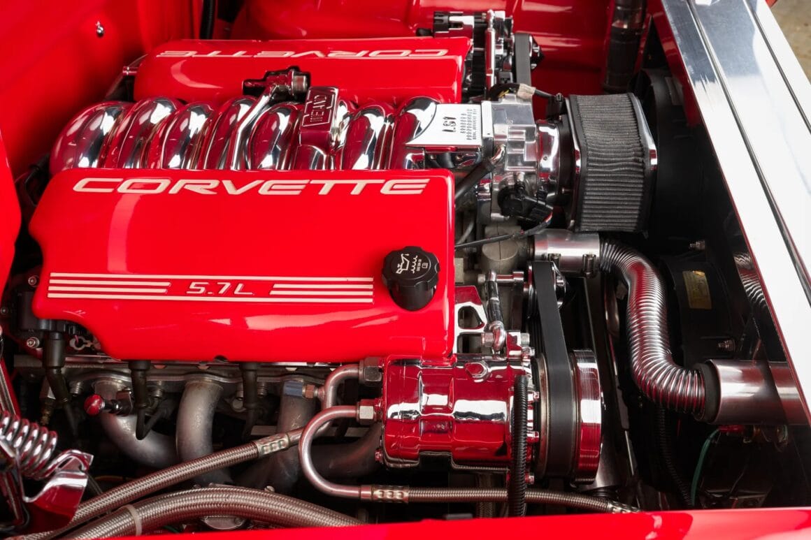 Le compteur kilométrique indique un peu moins de 1k miles. Le kilométrage total est inconnu. Les joints d’entraînement du compteur de vitesse ont été remplacés en novembre 2022. Le coffre abrite une pièce de rechange couverte et un boîtier de batterie personnalisé de style Coca-Cola. Le V8 LS1 de 5,7 litres est équipé d’un collecteur d’admission Weiand chromé et d’un filtre à air de rechange.