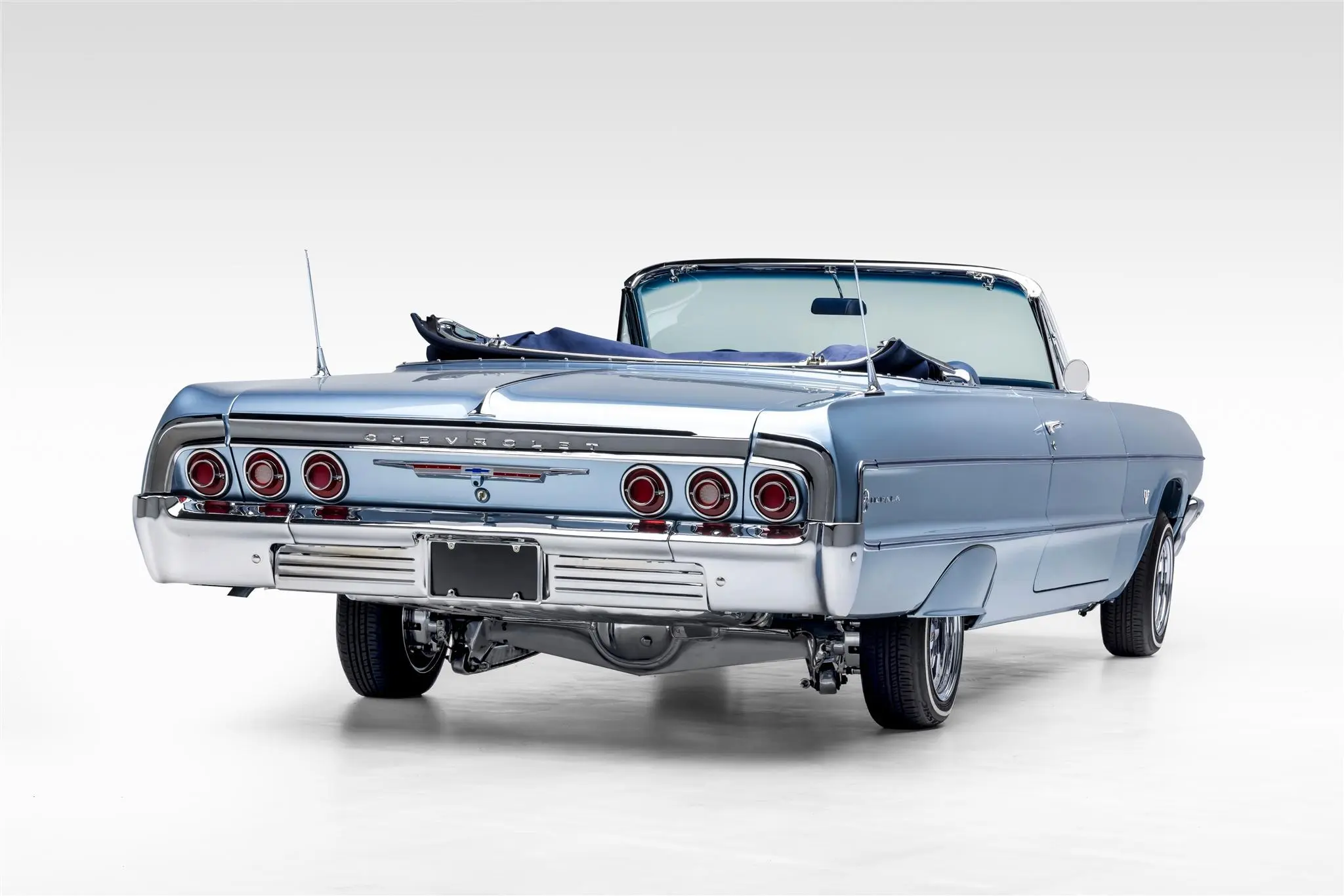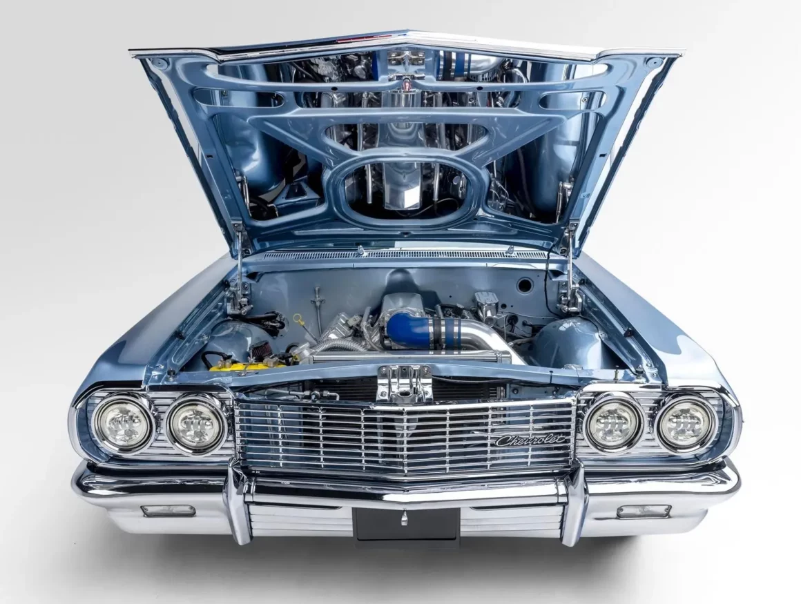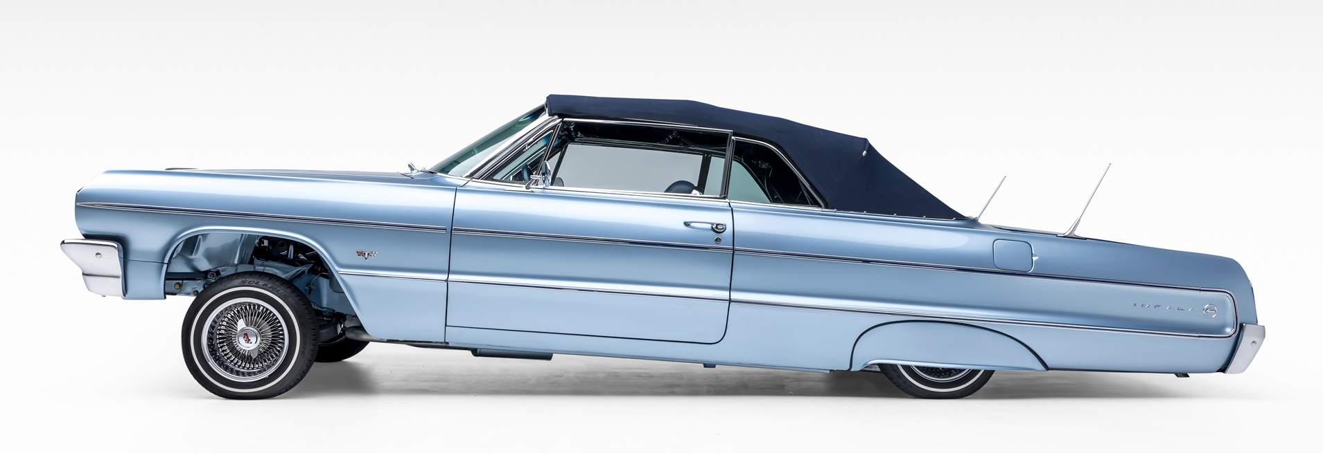 La plupart des voitures lowrider classiques sont équipées moteurs V8, notamment cette Chevrolet Impala, remotorisée d’un LS1 Corvette V8 5L7 Super Sport. Les Impala’s ont longtemps été un choix populaire pour les modifications lowrider, surtout la 3ème génération, aucune n’étant plus vénérée que l’édition de 1964 qui était la dernière des Impala’s de 3e génération, recevant un look redessiné, avec des lignes plus lisses et plus arrondies, des modifications aux feux arrière et quantité d’options. La 64’Impala était une automobile distinctive et magnifique à sa sortie d’usine !