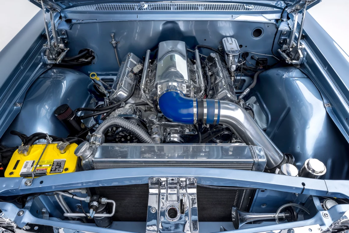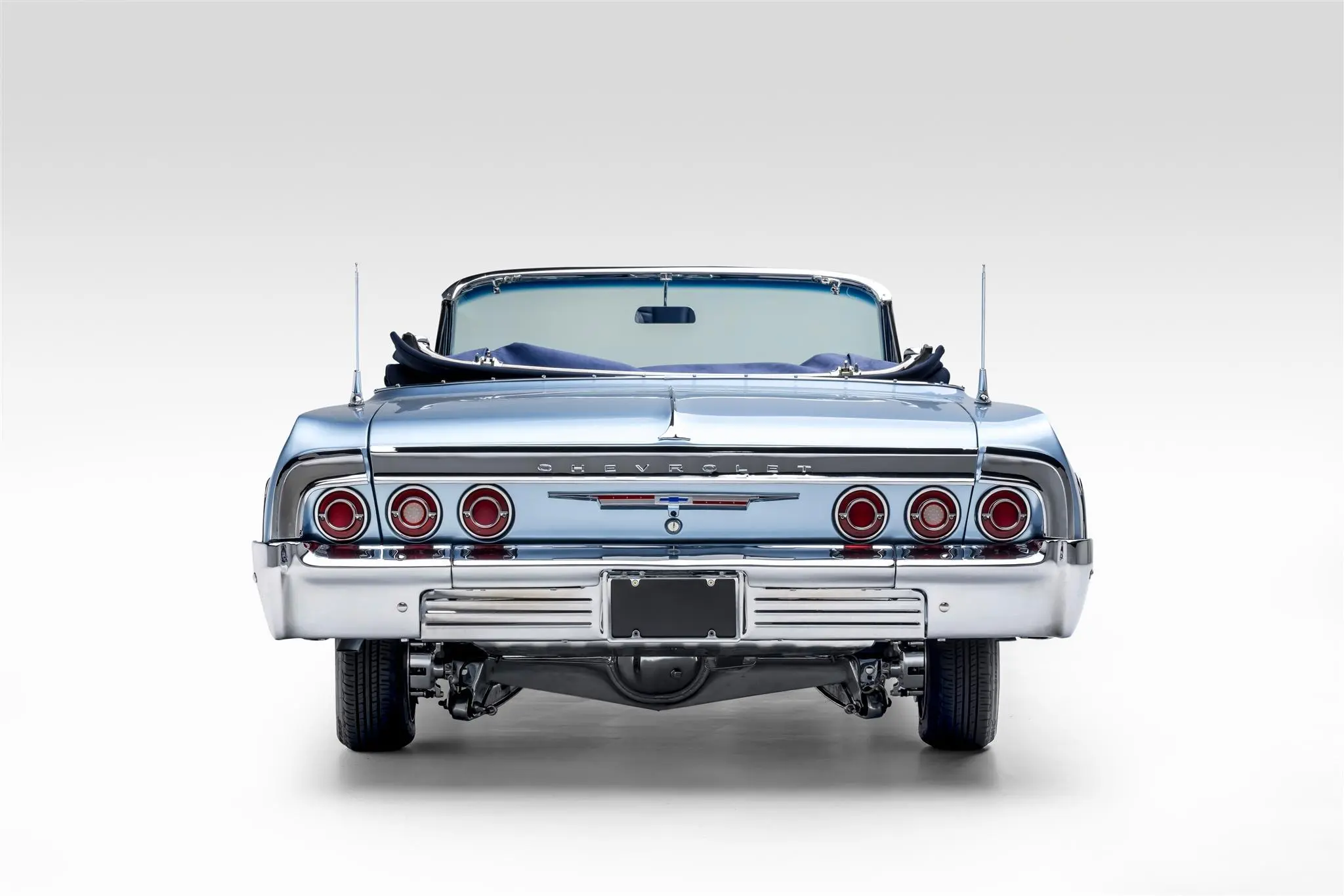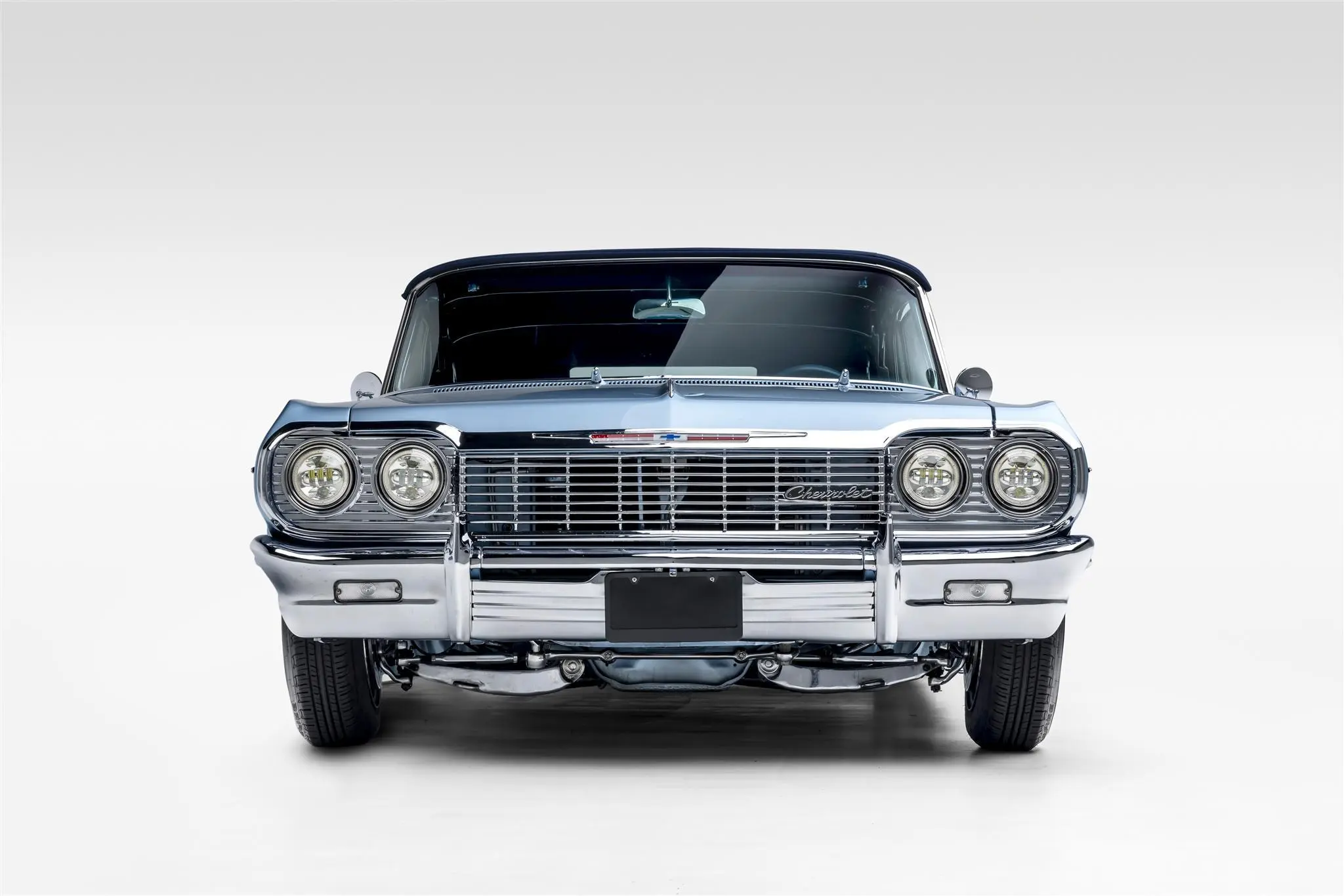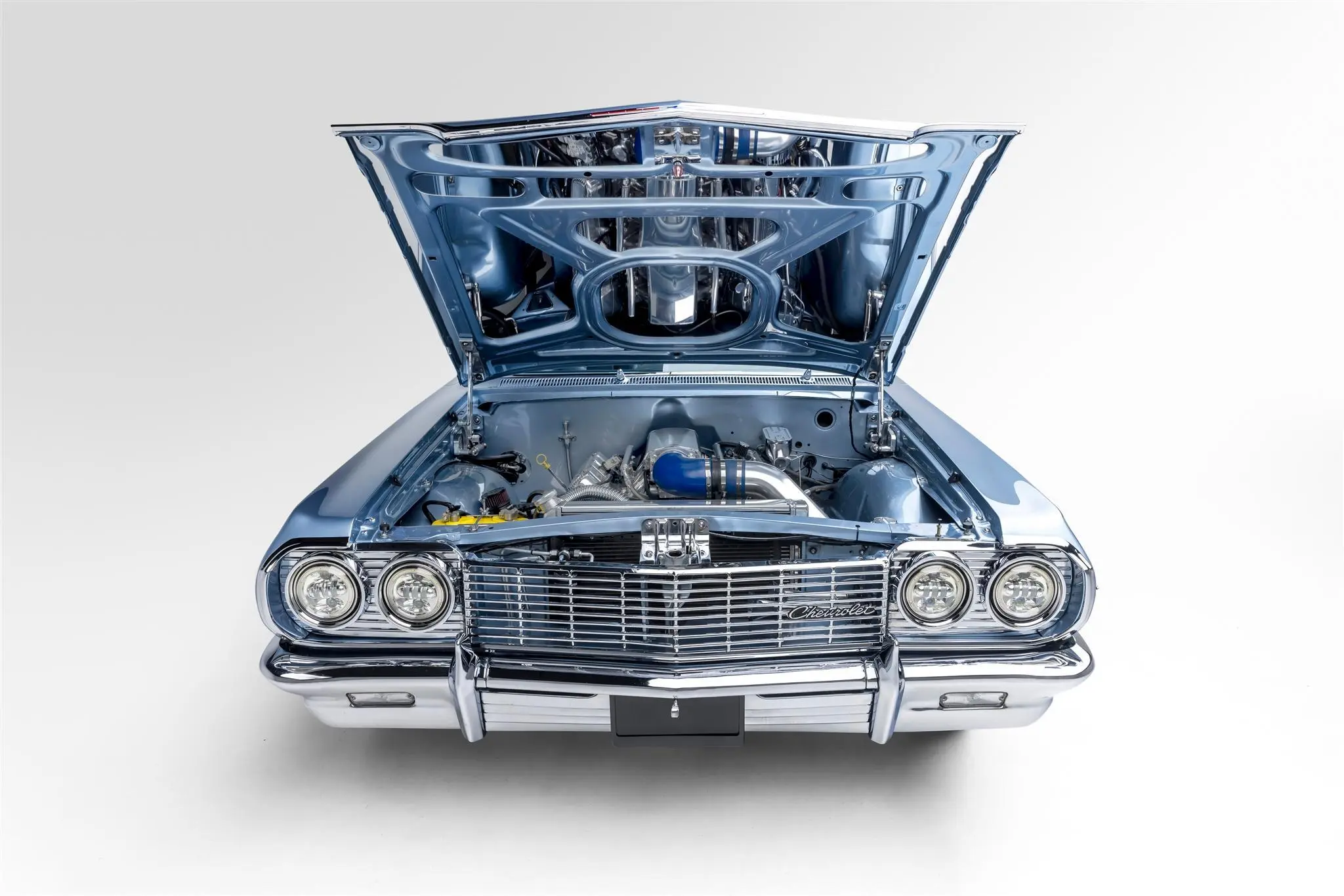 La plupart des voitures lowrider classiques sont équipées moteurs V8, notamment cette Chevrolet Impala, remotorisée d’un LS1 Corvette V8 5L7 Super Sport. Les Impala’s ont longtemps été un choix populaire pour les modifications lowrider, surtout la 3ème génération, aucune n’étant plus vénérée que l’édition de 1964 qui était la dernière des Impala’s de 3e génération, recevant un look redessiné, avec des lignes plus lisses et plus arrondies, des modifications aux feux arrière et quantité d’options. La 64’Impala était une automobile distinctive et magnifique à sa sortie d’usine !