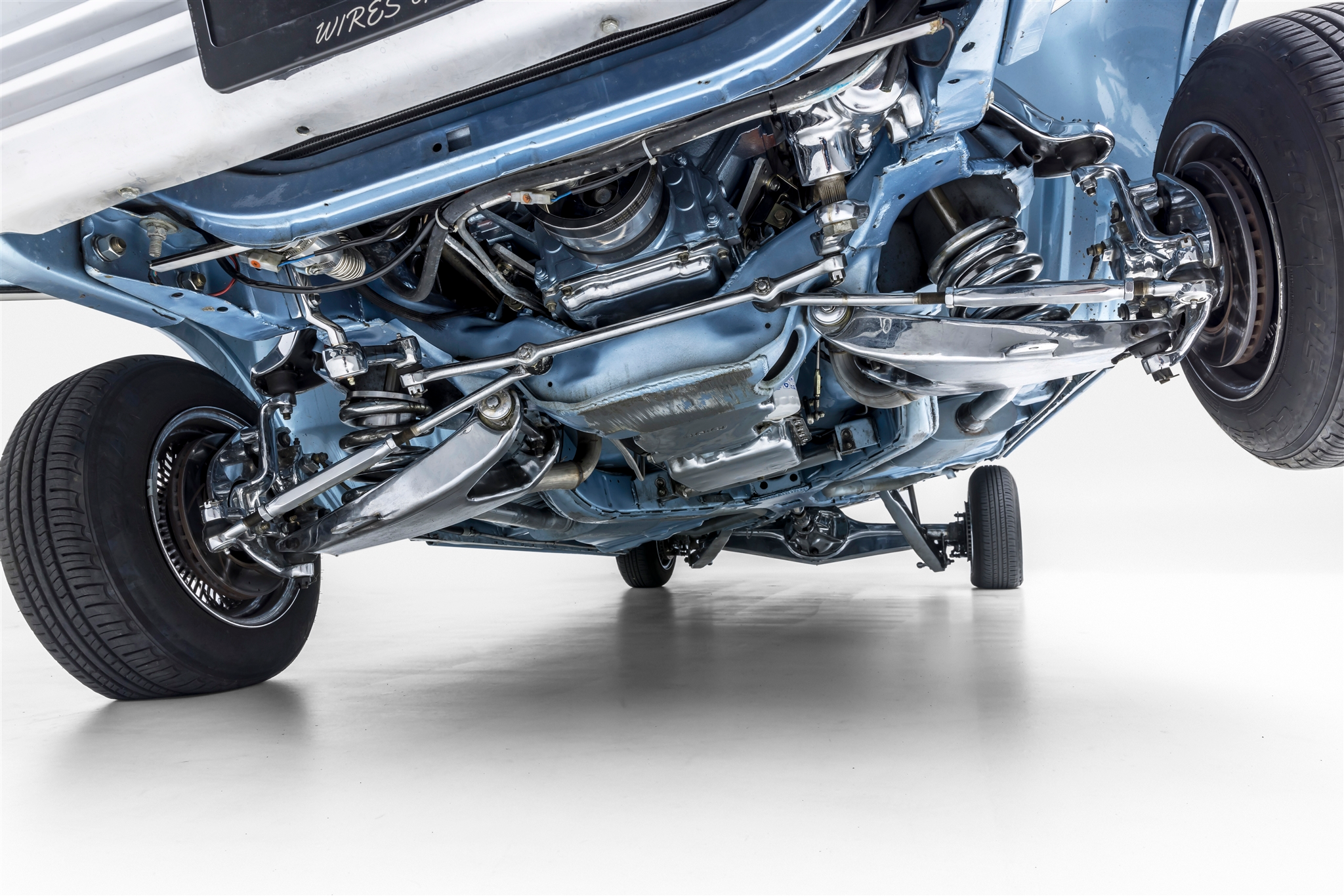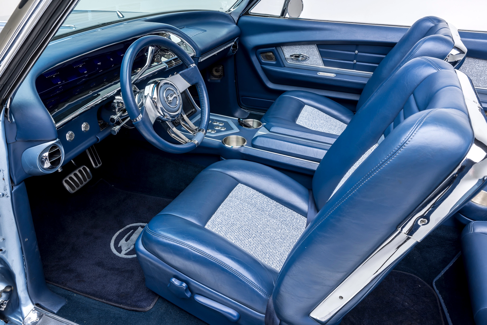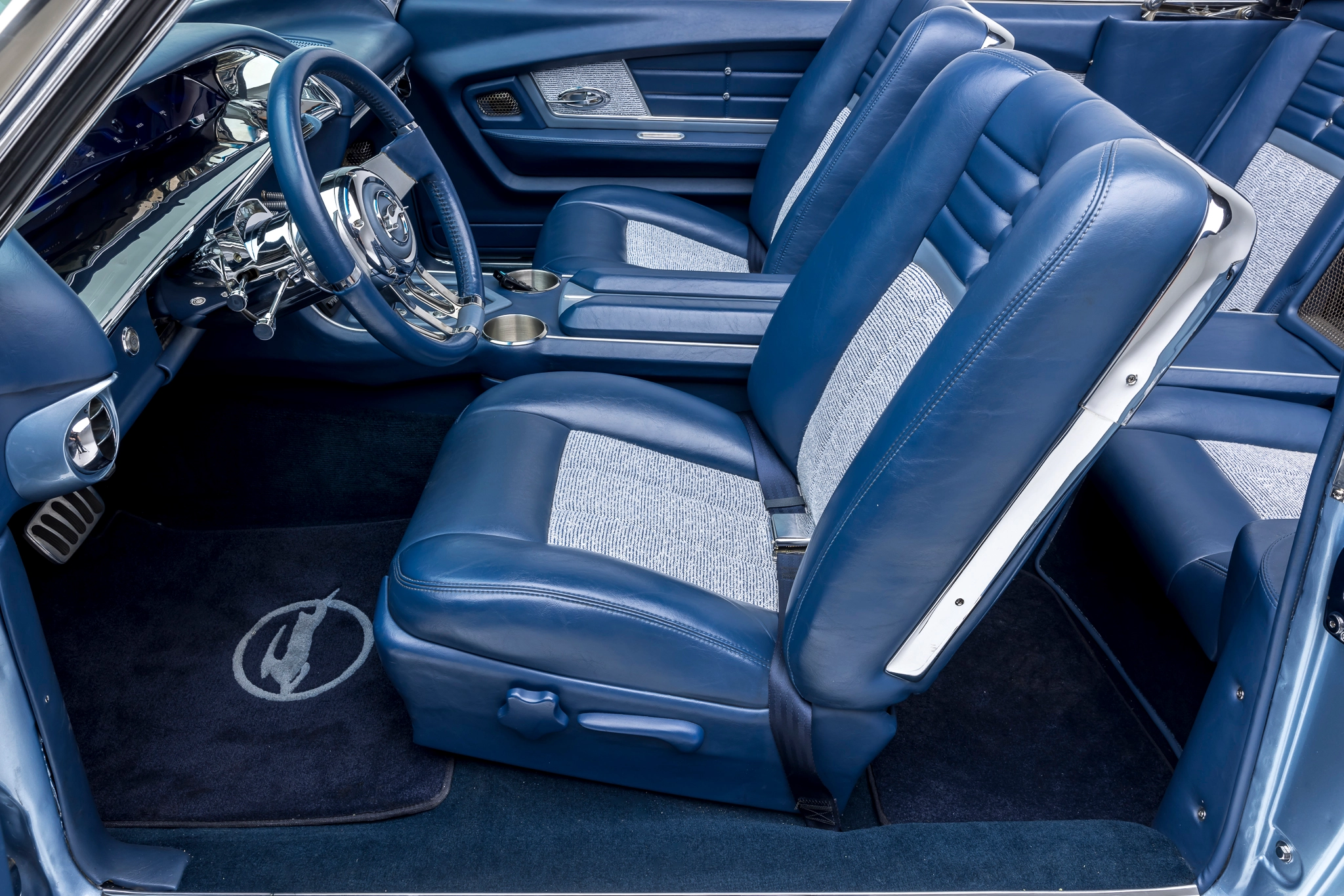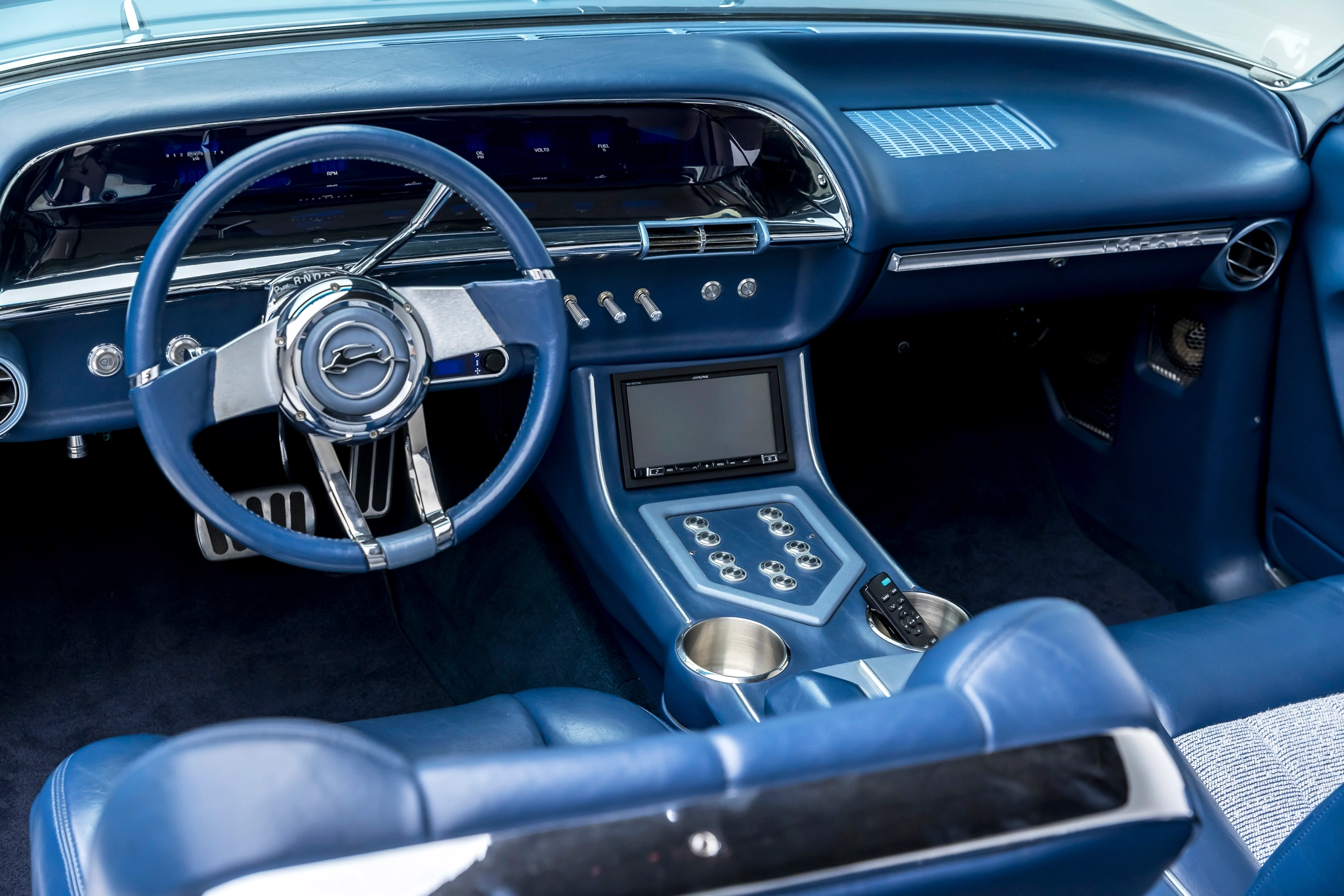 La cabine a été modifiée et rembourrée par California Upholstery de Bell Gardens, en Californie. Les sièges baquets avant à dossier bas sont garnis de cuir bleu marine avec des inserts en tissu et sont reliés par des sièges arrière et des panneaux de porte assortis. L’équipement supplémentaire comprend une console centrale pleine longueur, des ceintures de sécurité sous-abdominales, un système d’allumage sans clé, la climatisation, des vitres électriques, une caméra de recul et un système stéréo personnalisé !