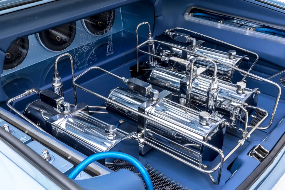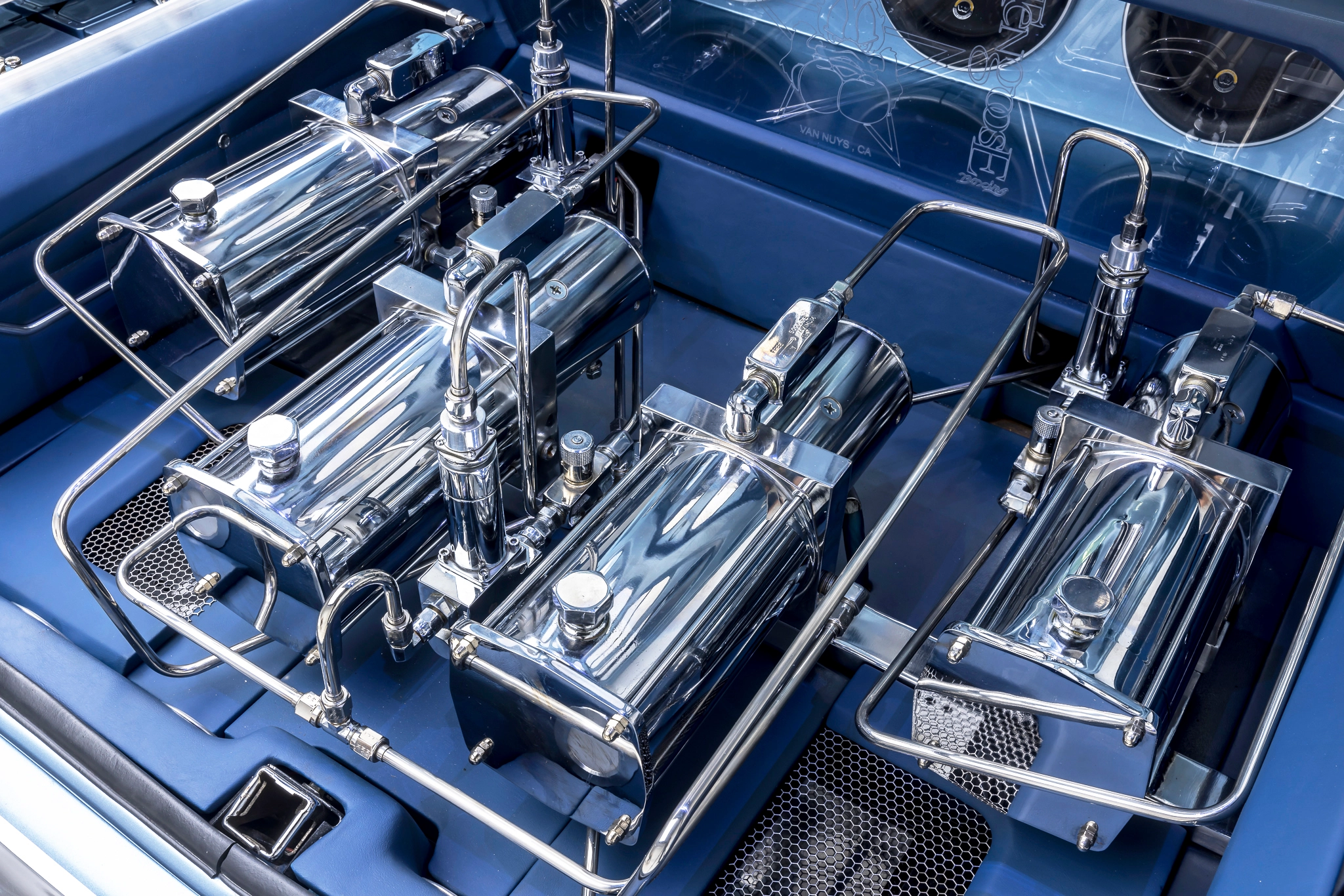L’équipement comprend des roues à rayons Dayton de 13 pouces, une capote bleue à commande électrique et une suspension hydraulique avec quatre pompes et décharges Adex, ainsi que des batteries Odyssey, des freins à disque aux quatre roues, des phares et des feux arrière à DEL, des pare-chocs et des garnitures chromés, un système d’allumage sans clé, un groupe d’instruments Dakota Digital et des composants stéréo de provenance indéfinie… Quoique sont identifiables l’unité centrale Alpine et les subwoofers JL Audio.