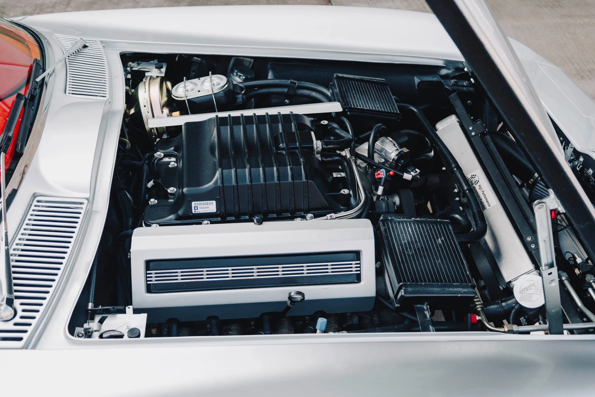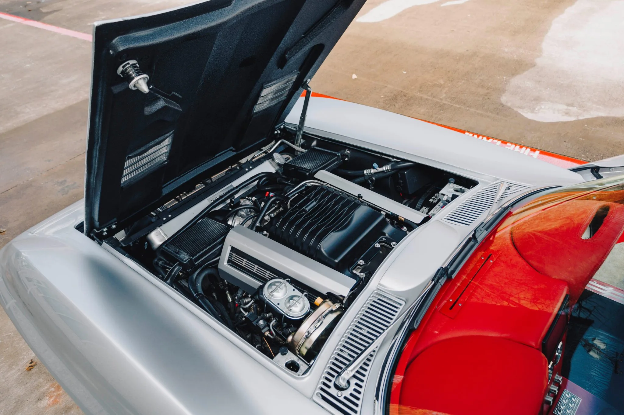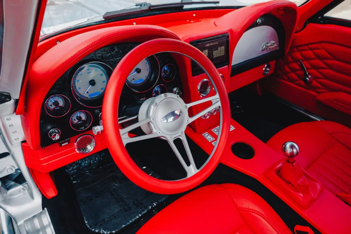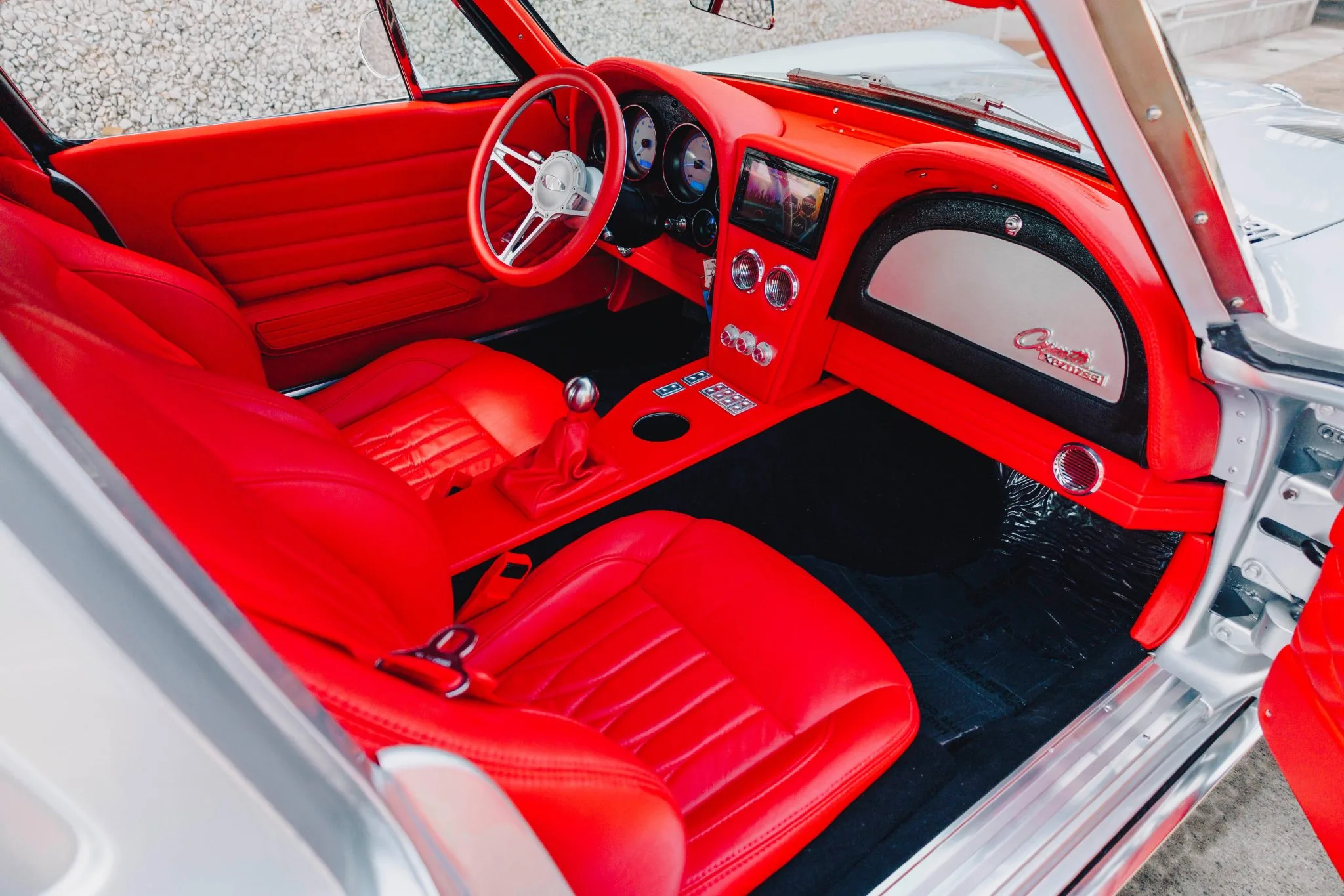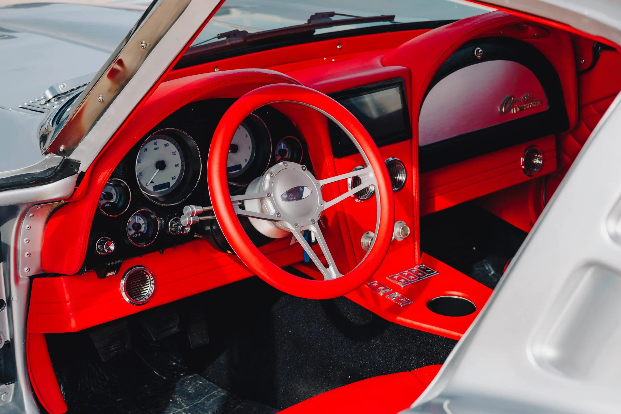Re-construite par HarborVette d’Erie, en Pennsylvanie, USA et motorisée d’un V8 Chevy LSA suralimenté de 6L2 couplé à une transmission manuelle six vitesses Tremec TR6060 et d’un essieu arrière Currie de 9 pouces de 3,73: 1, la Corvette 1963 Split-Window de Donald Trump est finie en argent avec une sellerie en cuir rouge et a été modifiée avec un châssis tubulaire SRIII, une suspension avant et arrière de Corvette C7, des freins à disque C7-Z51 aux quatre roues chromées Grand Sport, des doubles amortisseurs réglables Viking Performance et un système de direction à crémaillère Flaming River !