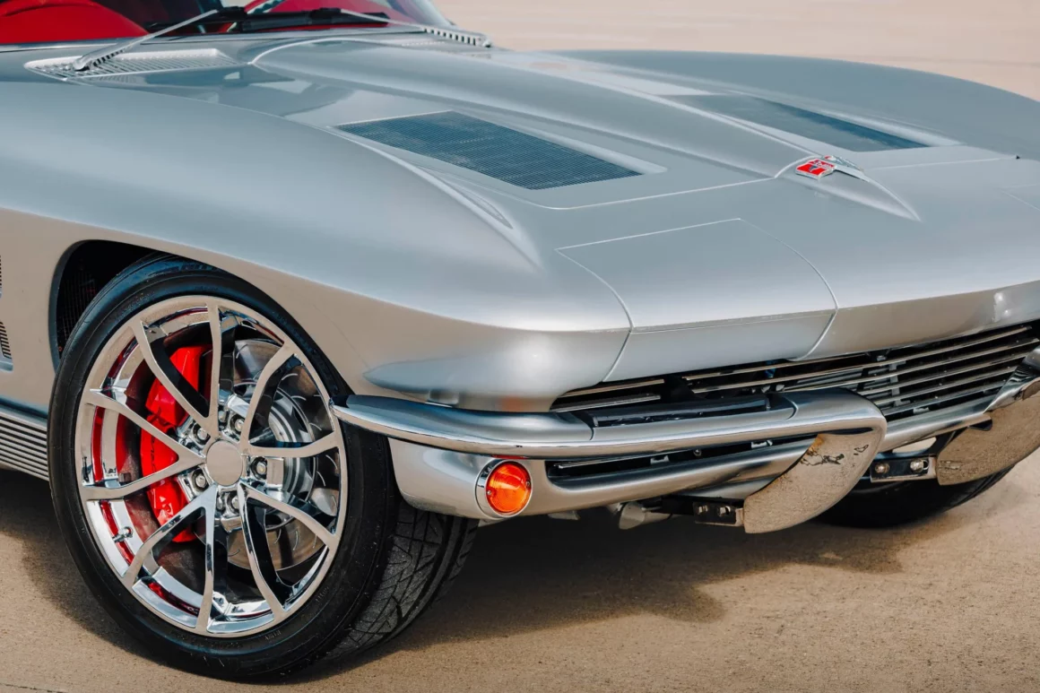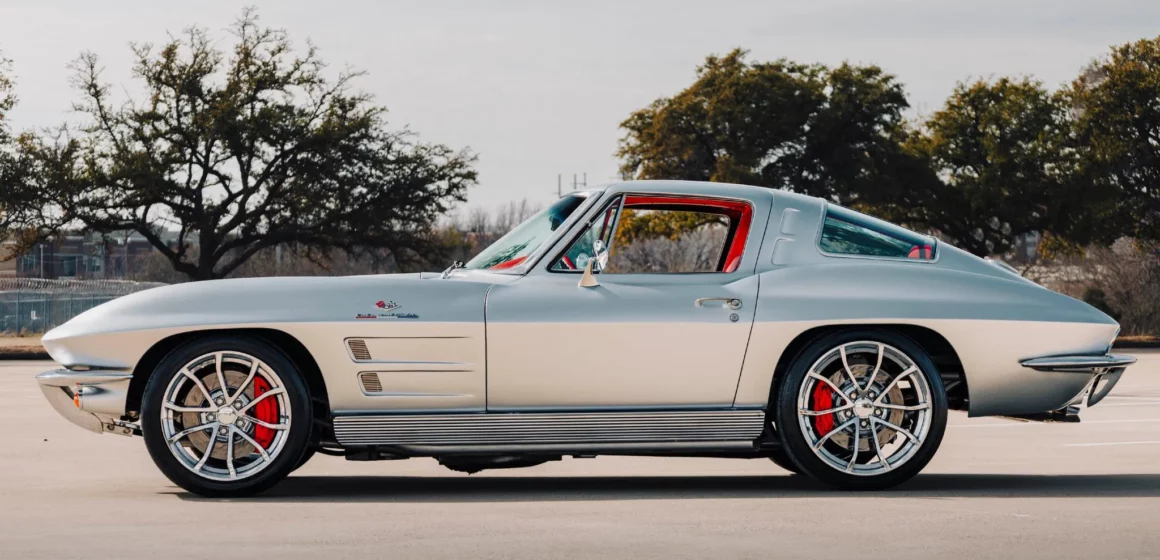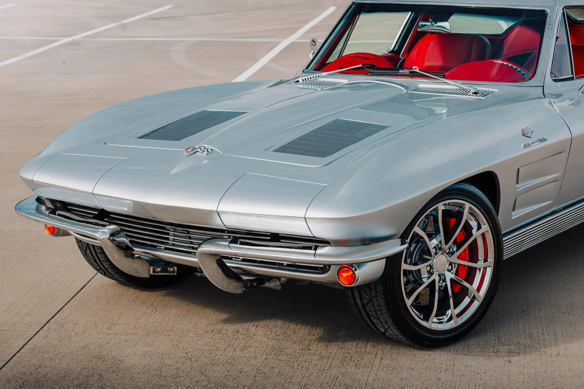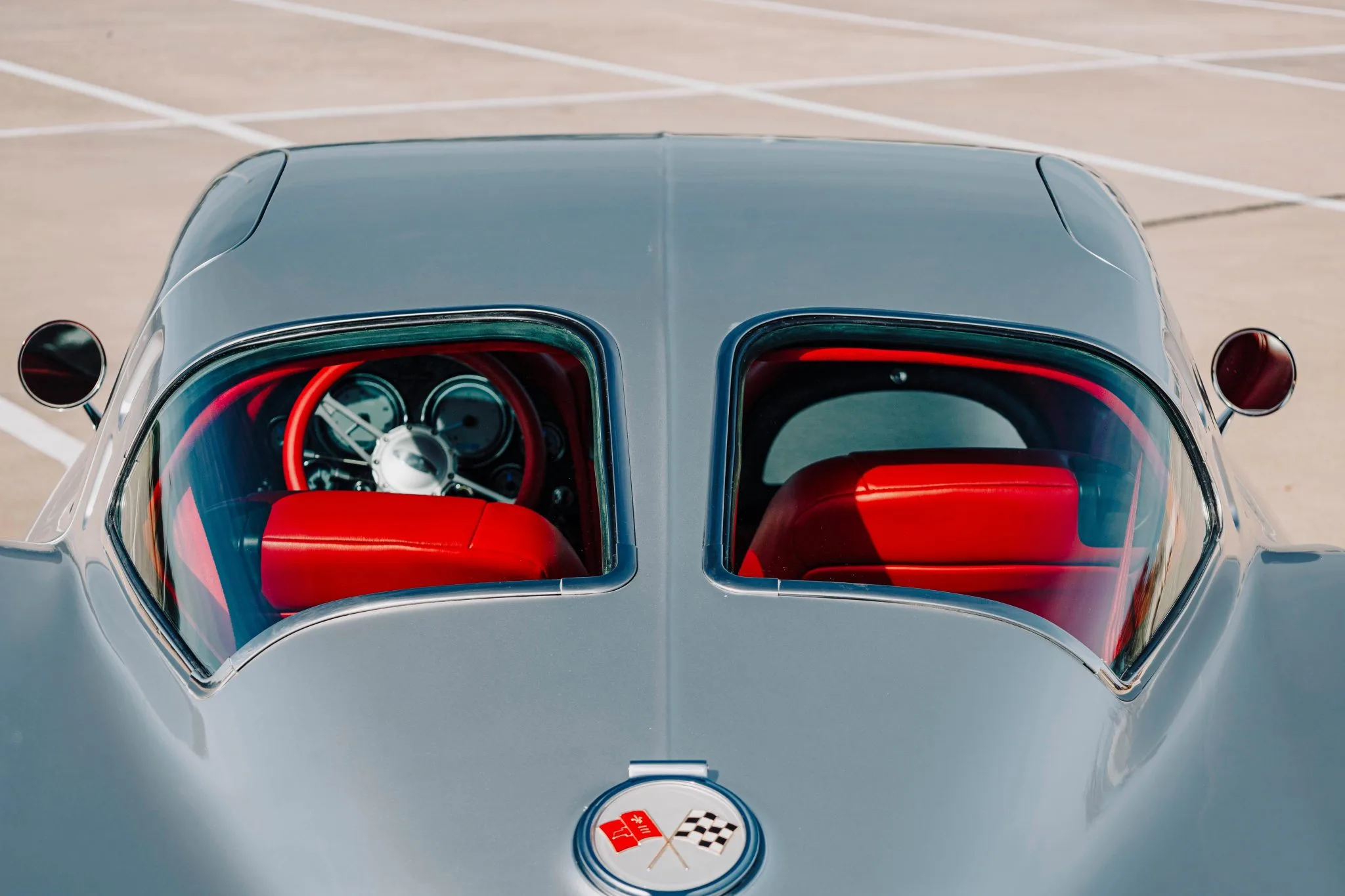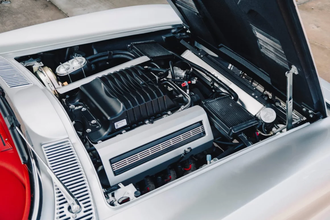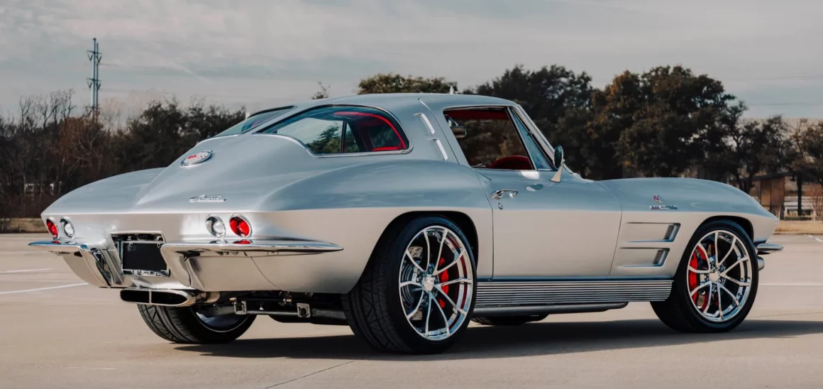 Re-construite par HarborVette d’Erie, en Pennsylvanie, USA et motorisée d’un V8 Chevy LSA suralimenté de 6L2 couplé à une transmission manuelle six vitesses Tremec TR6060 et d’un essieu arrière Currie de 9 pouces de 3,73: 1, la Corvette 1963 Split-Window de Donald Trump est finie en argent avec une sellerie en cuir rouge et a été modifiée avec un châssis tubulaire SRIII, une suspension avant et arrière de Corvette C7, des freins à disque C7-Z51 aux quatre roues chromées Grand Sport, des doubles amortisseurs réglables Viking Performance et un système de direction à crémaillère Flaming River !