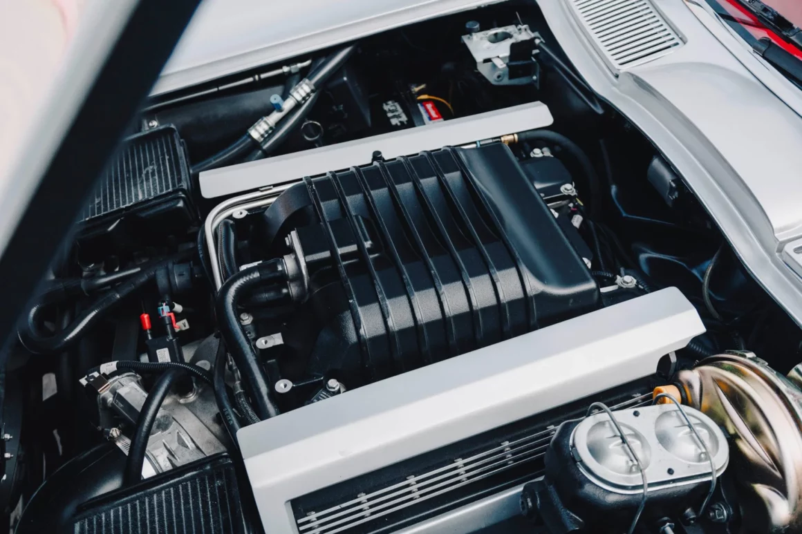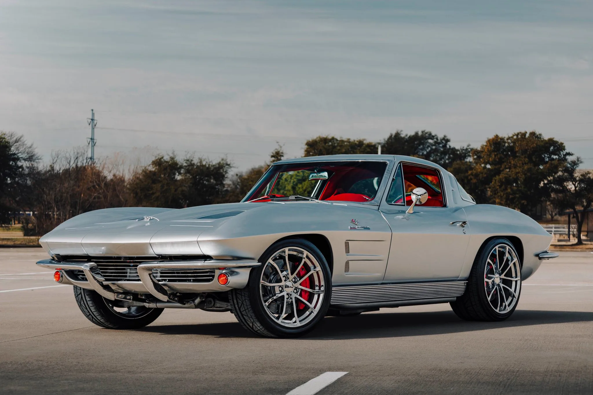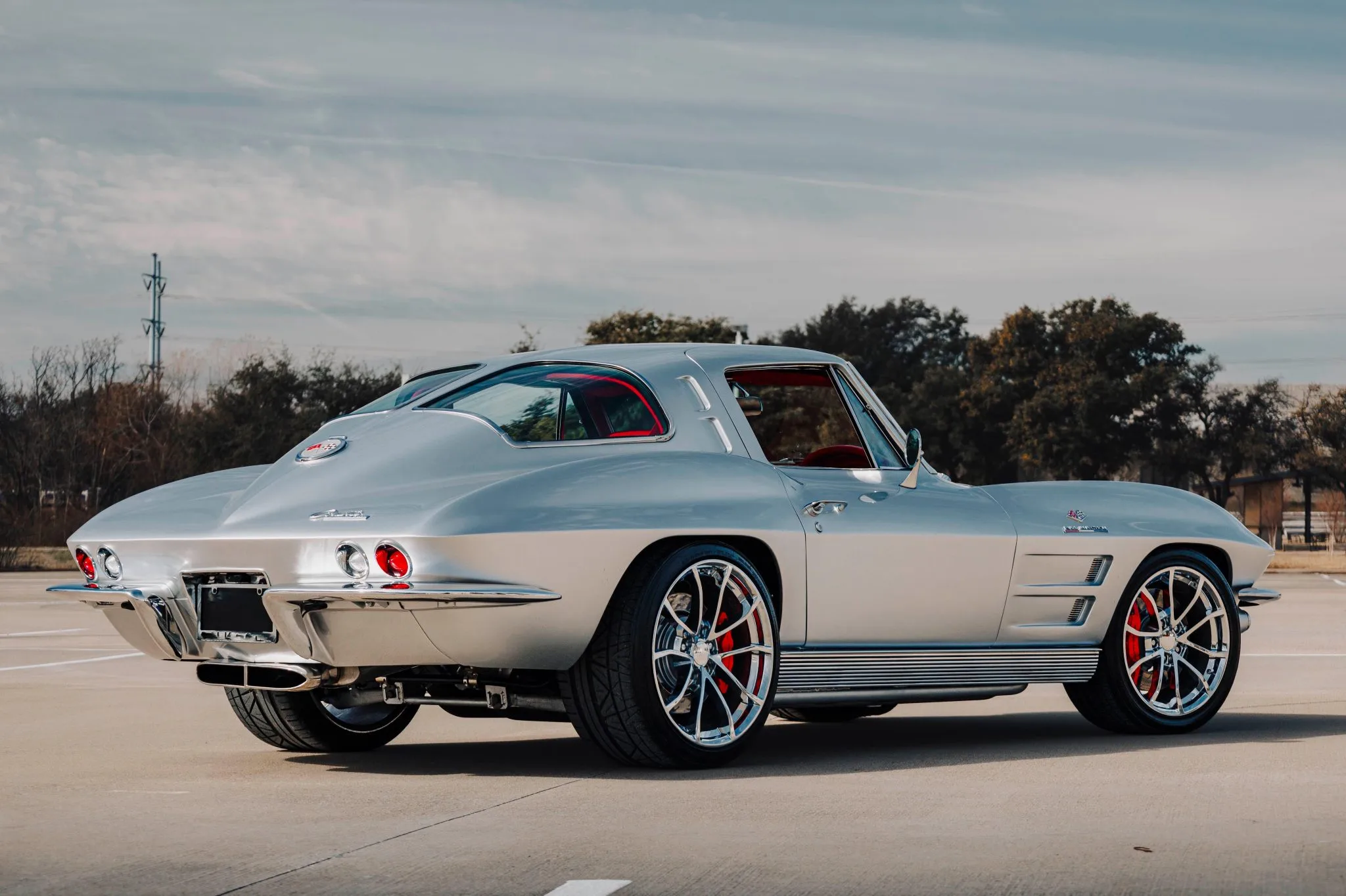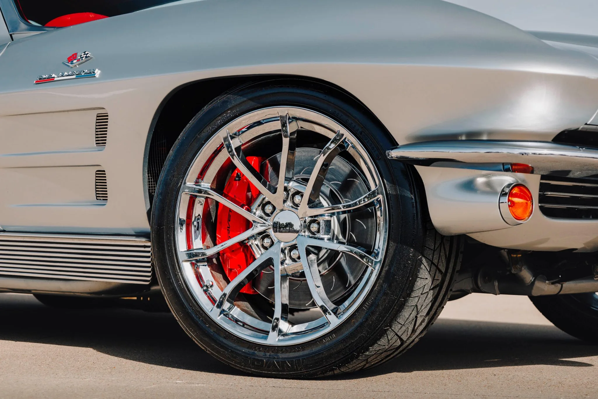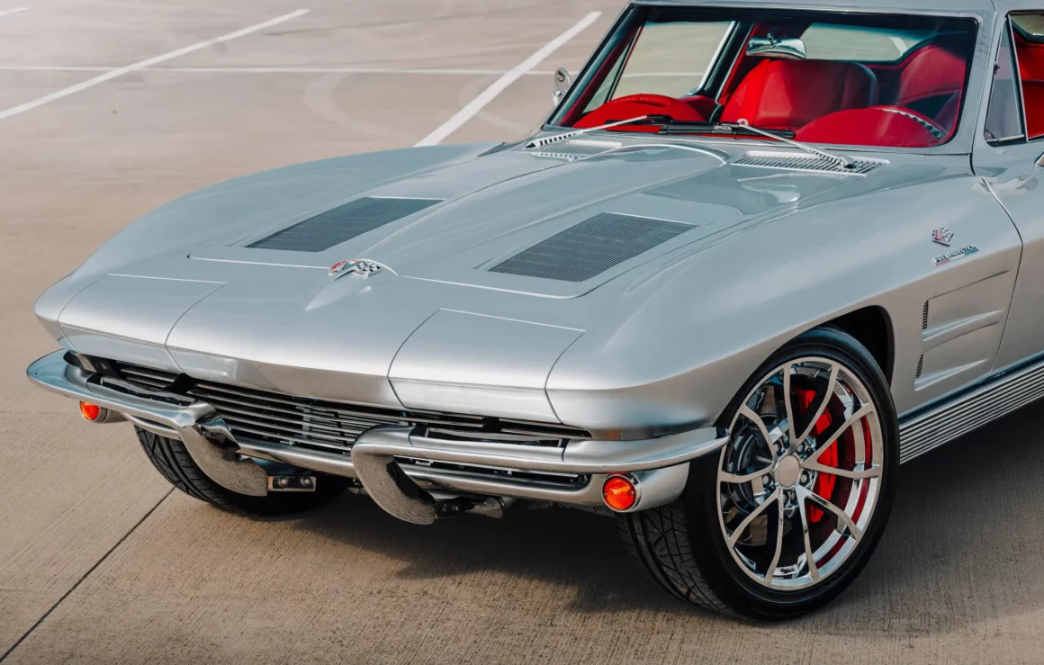 Re-construite par HarborVette d’Erie, en Pennsylvanie, USA et motorisée d’un V8 Chevy LSA suralimenté de 6L2 couplé à une transmission manuelle six vitesses Tremec TR6060 et d’un essieu arrière Currie de 9 pouces de 3,73: 1, la Corvette 1963 Split-Window de Donald Trump est finie en argent avec une sellerie en cuir rouge et a été modifiée avec un châssis tubulaire SRIII, une suspension avant et arrière de Corvette C7, des freins à disque C7-Z51 aux quatre roues chromées Grand Sport, des doubles amortisseurs réglables Viking Performance et un système de direction à crémaillère Flaming River !