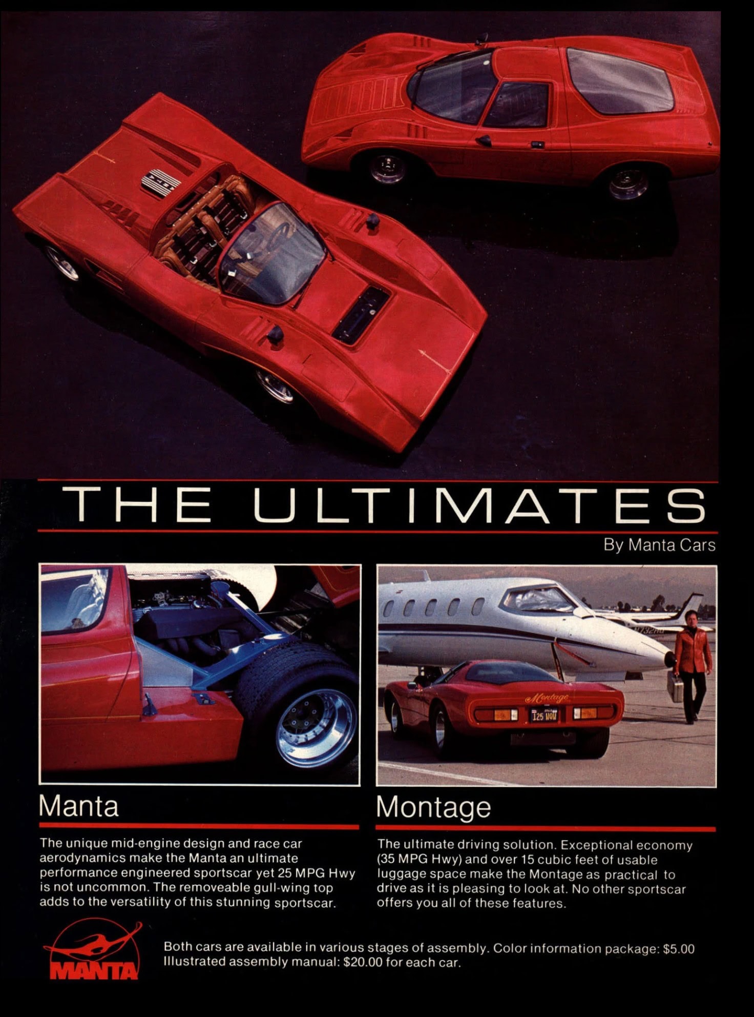 A la fin des années 1970, une nouvelle déclinaison des deux modèles voit le jour : la Manta Montage T. Elle regroupe les caractéristiques de ces deux devancières, cumulant la carrosserie de la première et le châssis tubulaire accompagné du fameux V8 de la seconde. Une reproduction de la Chevrolet Corvette C1 sera, par la suite, rajouté au catalogue. Hélas pour cette entreprise artisanale, (bonheur pour d’autres) le conseiller fiscal de Manta Cars détourne les fonds financiers de la société, la menant à la faillite en 1986. Au final, 1.000 kit-cars furent produits dont 450 Manta Mirage. De la série “Hardcastle & McCormick”, celle qui s’immortalisa auprès du public fut Manta Coyote. Mais étonnamment, c’est la version Manta Montage qui est la plus connue en cause de cette série américaine, connue en France sous le nom de “Le Juge et le Pilote” diffusée entre le 18 septembre 1983 et le 5 mai 1986.