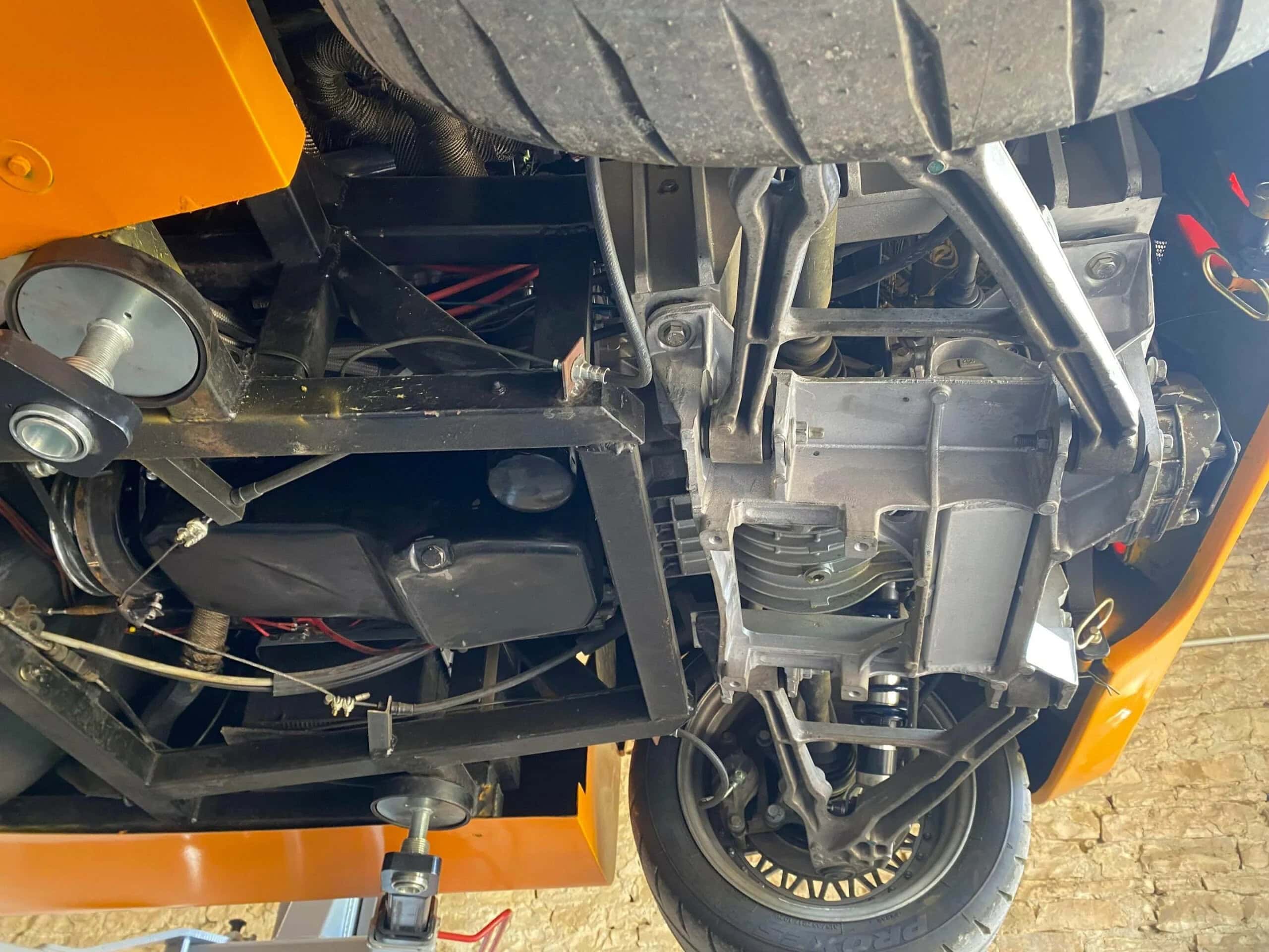 Etat général : Remarquez les soudures mal faites, la précarité de l’ensemble et l’évidence d’un amateurisme indécent en rapport avec la vie humaine des personnes embarquées à bord d’une telle bricole, ce qui sous entend l’incompétence évidente du contrôle technique, amenée à délivrer une attestation d’utilisation sur la voie publique… Manifestement le châssis est un grand n’importe quoi “mal-foutu”, l’affaissement de l’ensemble du train arrière par rapport au châssis, l’immonde bricolage du circuit électrique et, gag ultime, l’impossibilité d’accéder à la batterie et de la changer sauf à démonter les collecteurs d’échappement. Les cosses situées quasi contre les tuyaux d’échappement sont un danger permanent d’incendie, le réservoir étant placé tout contre… Pour ce qui est d’une “restauration” c’est soit une très ancienne alors que la construction est “amateur”… soit une arnaque mensongère vis à vis des acquéreurs..