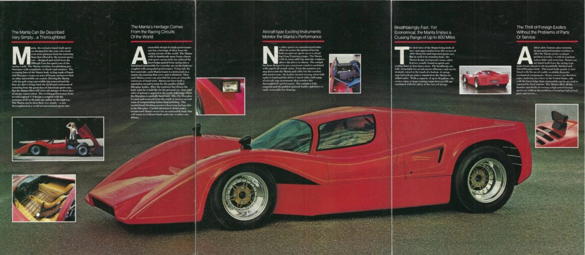 Reflets des seventies, les Manta’s Montage et Virage se proposaient bon marché commandée en kits “Do it yourself” ou construites “en vrac” dans les années 1970 et 1980. Elles offraient l’illusion d’être des Supercars qui n’existaient pas encore, si ce n’étaient les Ferrari’s et Lamborghini’s, qui étaient les voitures les plus rapides sur les routes pourtant à vitesse limitée depuis 1973… Certains kit-Cars se vendaient mensongèrement en tant que voitures de course homologuées pour la route. Pffffffff ! Déjà on sentait qu’on se faisait avoir fort profond, mais le prix à payer pour être possédé par un Kit Car, outre de devoir passer par des escrocs, était bien moindre qu’une Countach… Les Manta’s ont été construites autour d’un châssis en acier tubulaire disposant d’une récupération hasardeuse de suspensions avant et arrière (très indépendantes), quoique le châssis VW Cox était utilisé dans beaucoup de cas (désespérés)…