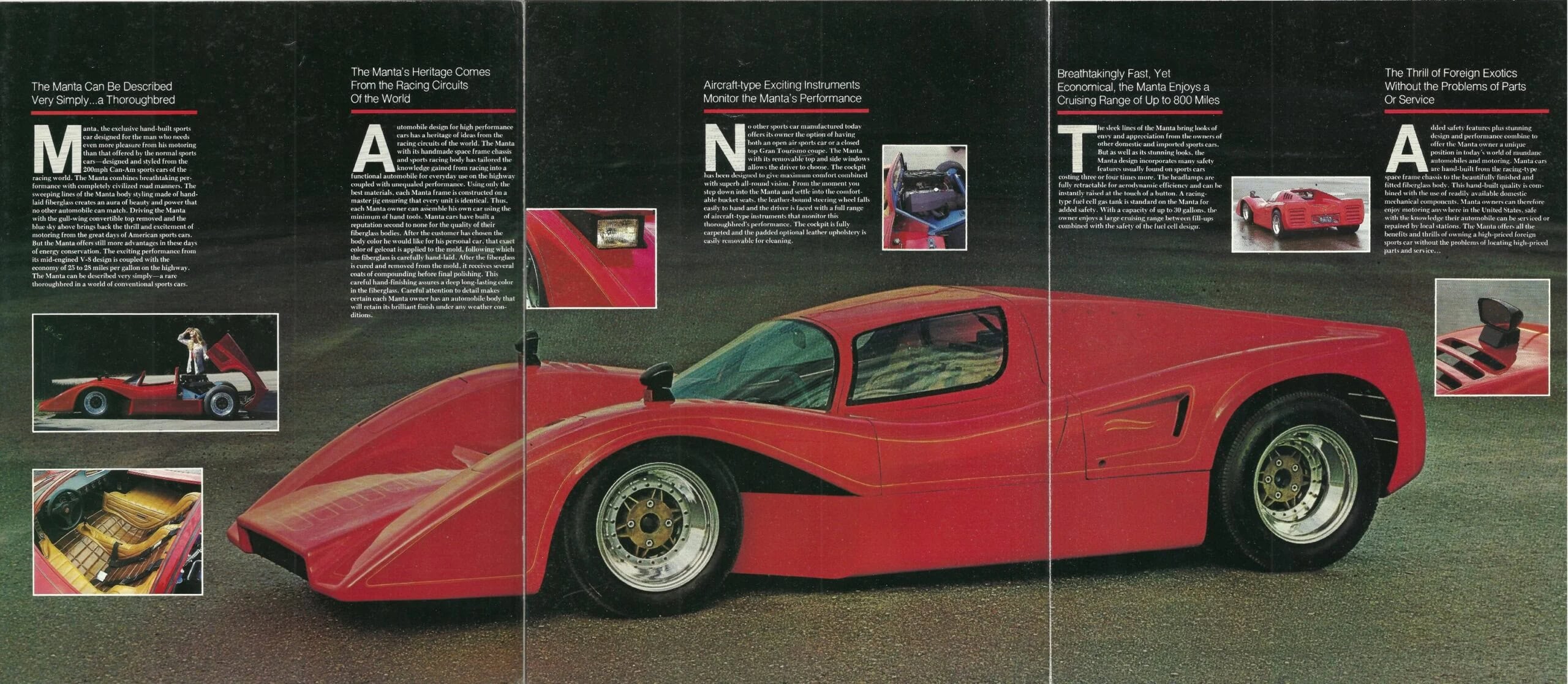 L’aventure des Manta’s a débuté avec les frères Brad et Tim LoVette, passionnés d’automobiles et de courses “à l’américaine”. En 1966, ils découvrent la McLaren M6, première GT produite par Bruce McLaren. Elle marque tellement les deux Américains qu’ils décident de créer leur clone/clown prototype. En 1973, ils fondent Manta Cars, à Costa Mesa, en Californie et singent librement la McLaren M6, sous forme d’une voiture en kit “Do it Yourself” (à monter soi-même) avec une variante plus chère qui est la même prête à rouler ! A l’instar de la McLaren M6 et de sa version de route, la McLaren M6GT, deux versions seront proposées : la Manta Montage, spécialement construite pour s’adapter sur un châssis VW Cox et motorisée par un flat-four VW Cox, même principe qu’un Buggy… en sus est proposée la Manta Mirage, imaginée façon circuits, mais utilisable sur routes, disposant d’un châssis tubulaire et d’un moteur/boite US.