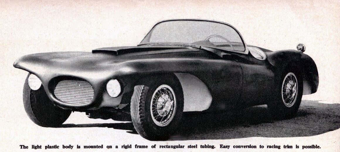 À l’été 1955, il a présenté au public la première version de la Manta Ray… et il l’a fait avec style ! Le lancement a été soutenu par un article dithyrambique pleine page dans le numéro de juin 1955 de “Road&Track”. Trois belles photos et un texte laudatif quasi nauséeux fe fatuité, ont ainsi scellé l’introduction de cette voiture dans une publication majeure, ce qui a également contribué à présenter la voiture au public avec la publication de photos de dossiers de presse extrapolés du magazine.