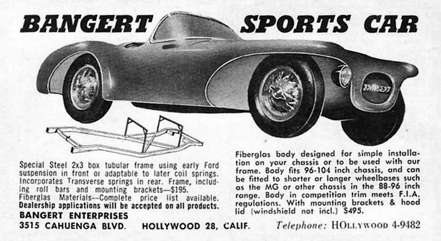 Les premières publicités pour cette voiture sont apparues dans des journaux Hollywoodiens, faisant connaitre “Hollywood Plastics”. Puis deux articles de magazines sont apparu sur sa voiture, l’un dans “Motor Life” et dans l’autre appelé “Badge Bar Journal”. Les ventes ont augmenté en conséquence. Bangert a alors créé un second Kit-Car qui s’est de suite avéré populaire en cause de son look de voiture de course… La “Baldwin Special” conduite au succès par Bill Pollack sur les pistes de course de la côte ouest telles que “Willow Springs”.