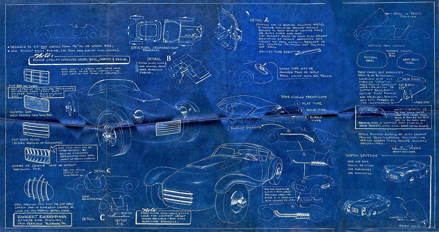 Elle avait la taille et la forme “en fuselage d’avion” des voitures de course Indianapolis 500 de l’époque. Noël Bangert voulait que les amateurs de courses automobiles et de voitures de sport puissent construire facilement cette version pour une utilisation légale sur les routes. Une idée qui va s’avérer très lucrative. Certaines versions pouvaient être montées avec des ailes façon cycle, d’autres sans, et d’autres avec des ailes de conception unique qui couraient sur toute la longueur de la carrosserie.